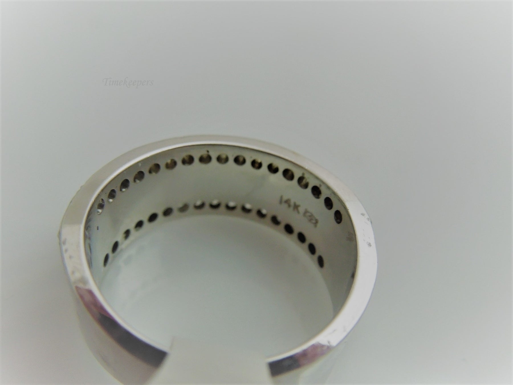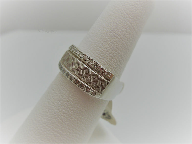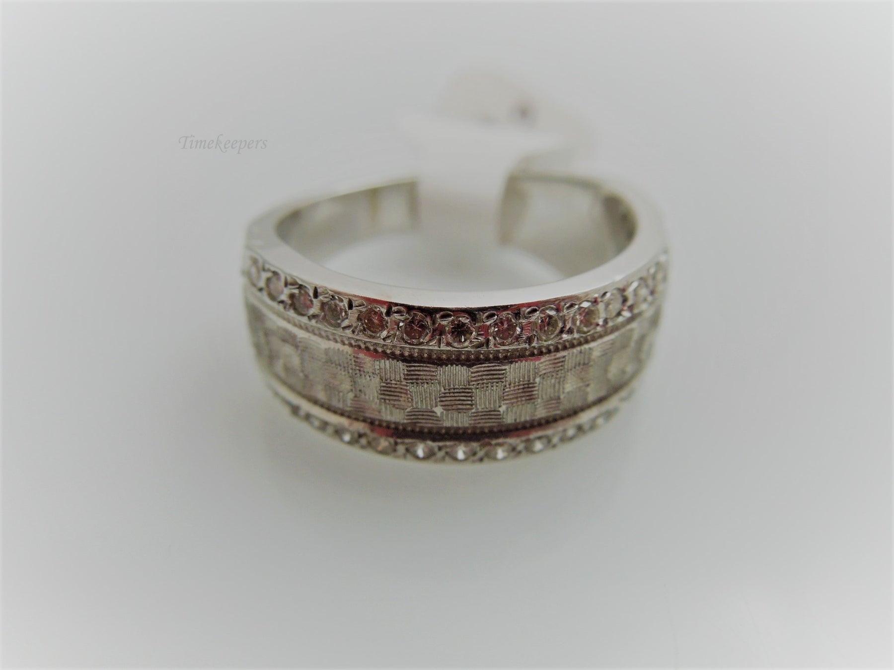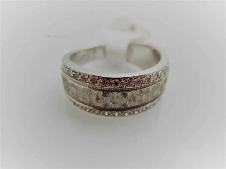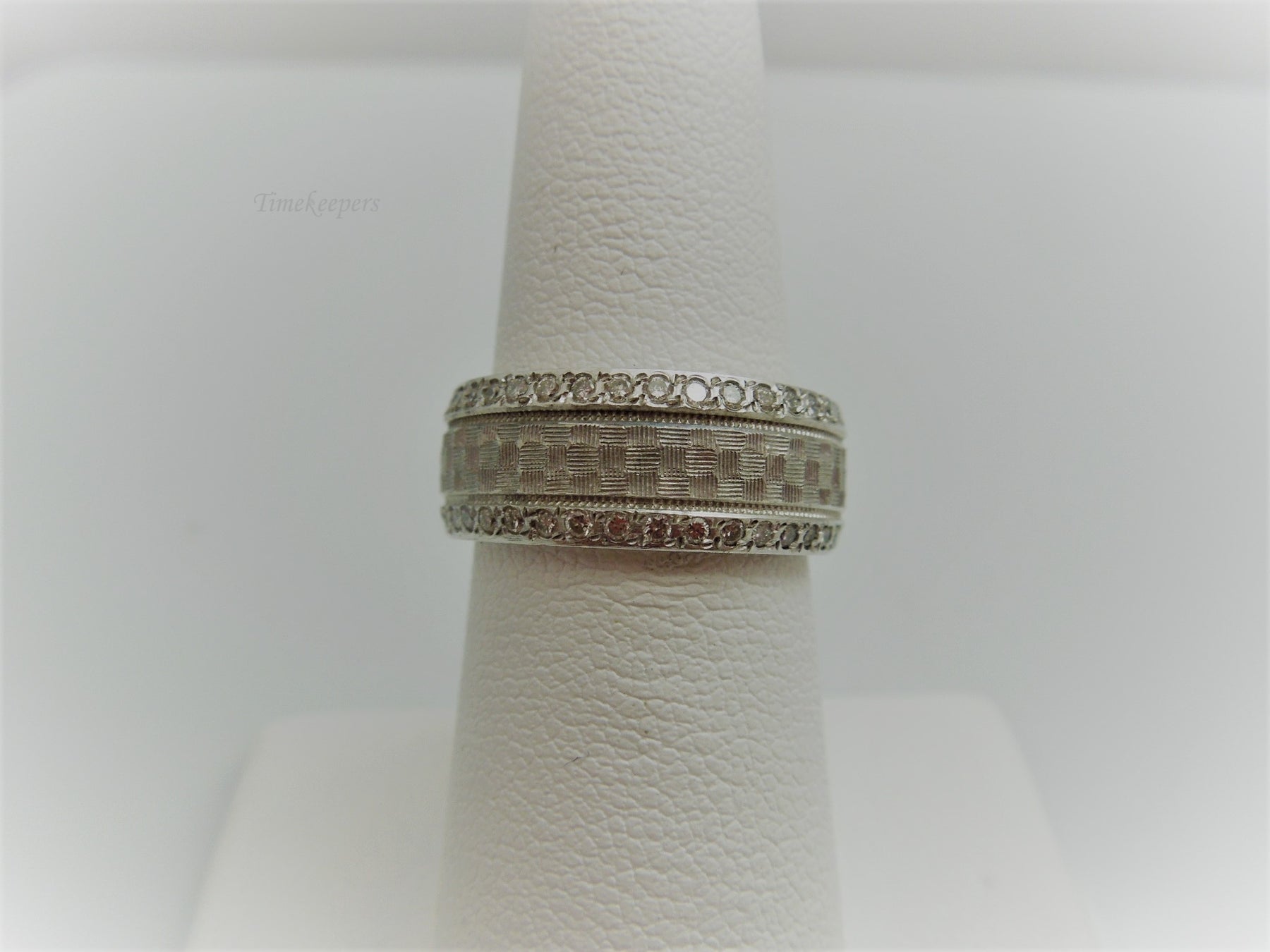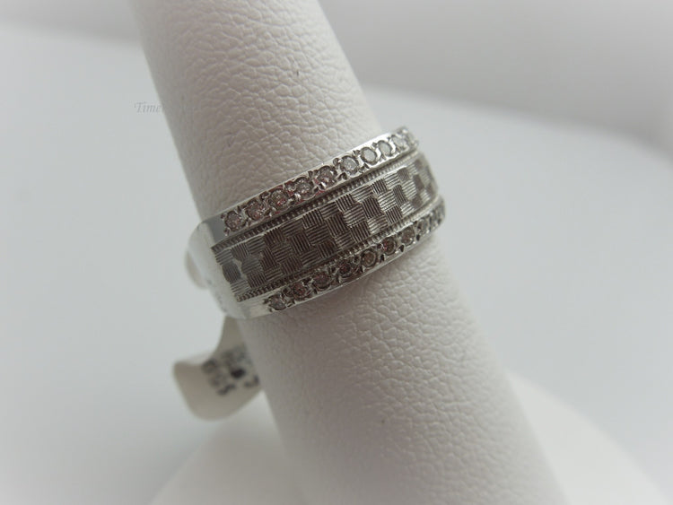 This is a lovely ladies wedding band. Set in 14kt white gold, it features a checkerboard design that runs along the top of the band. Along each side of the checkerboard design, is a row of round cut diamonds. Ring is stamped 14k. Would be a nice wedding band for her.
