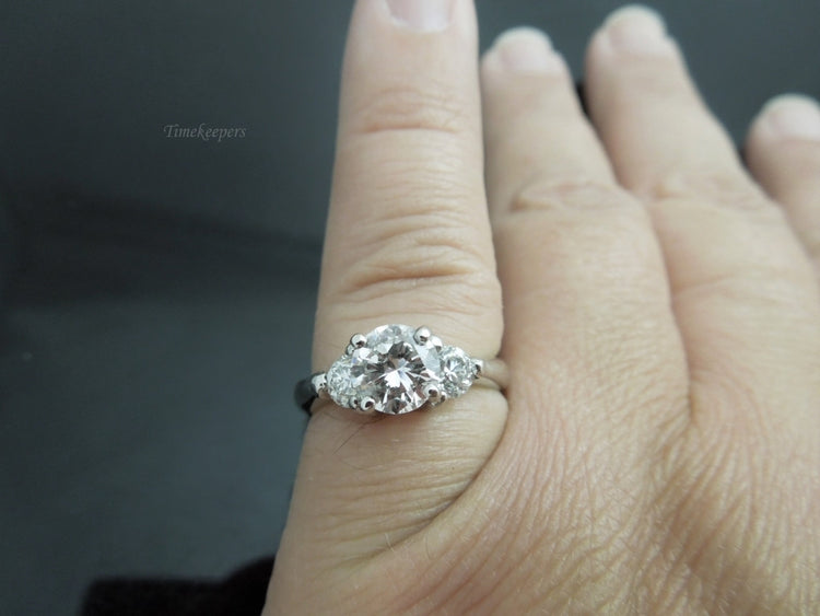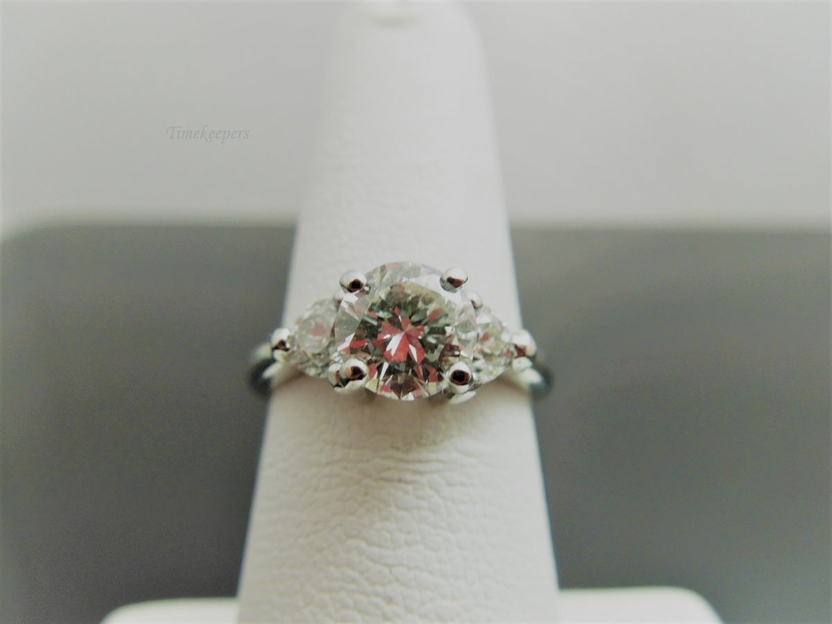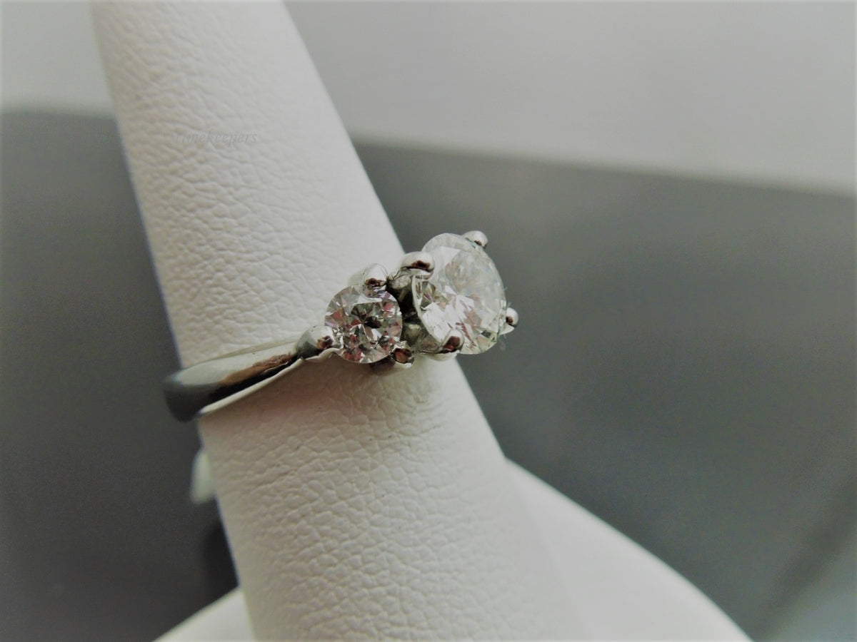 This is a simple, but beautiful engagement ring. Set in platinum, it contains 3 round cut diamonds, with the center weighing .97cts, and each side stone .28cts & .29cts. Shank is stamped Plat. Would be a lovely ring to propose with!!
