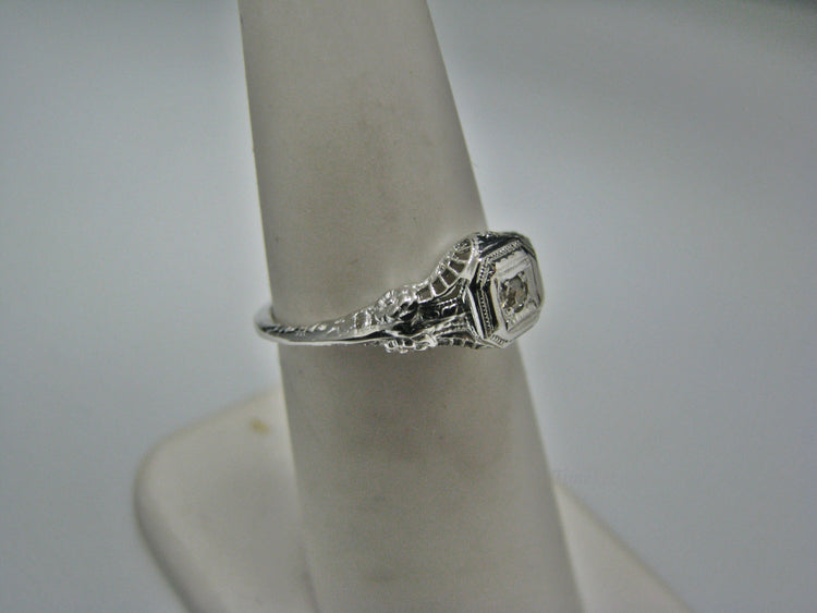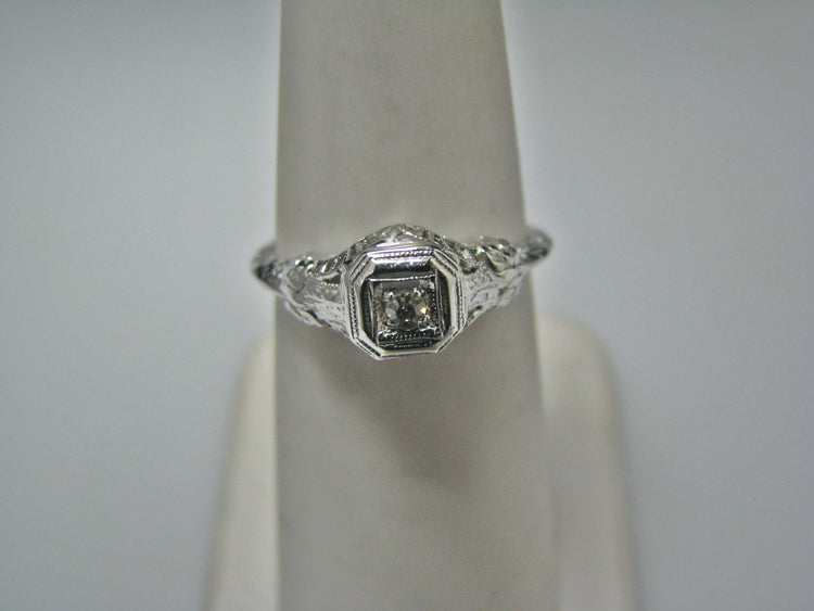 This stunning ring features a center 0.026 ct diamond. This is a beautiful filigree mountingand flower design down the side. The shank is decorated half way down. The ring is stamped 14k. This ring is from the 1920's. A beautiful piece for a any special occasion!