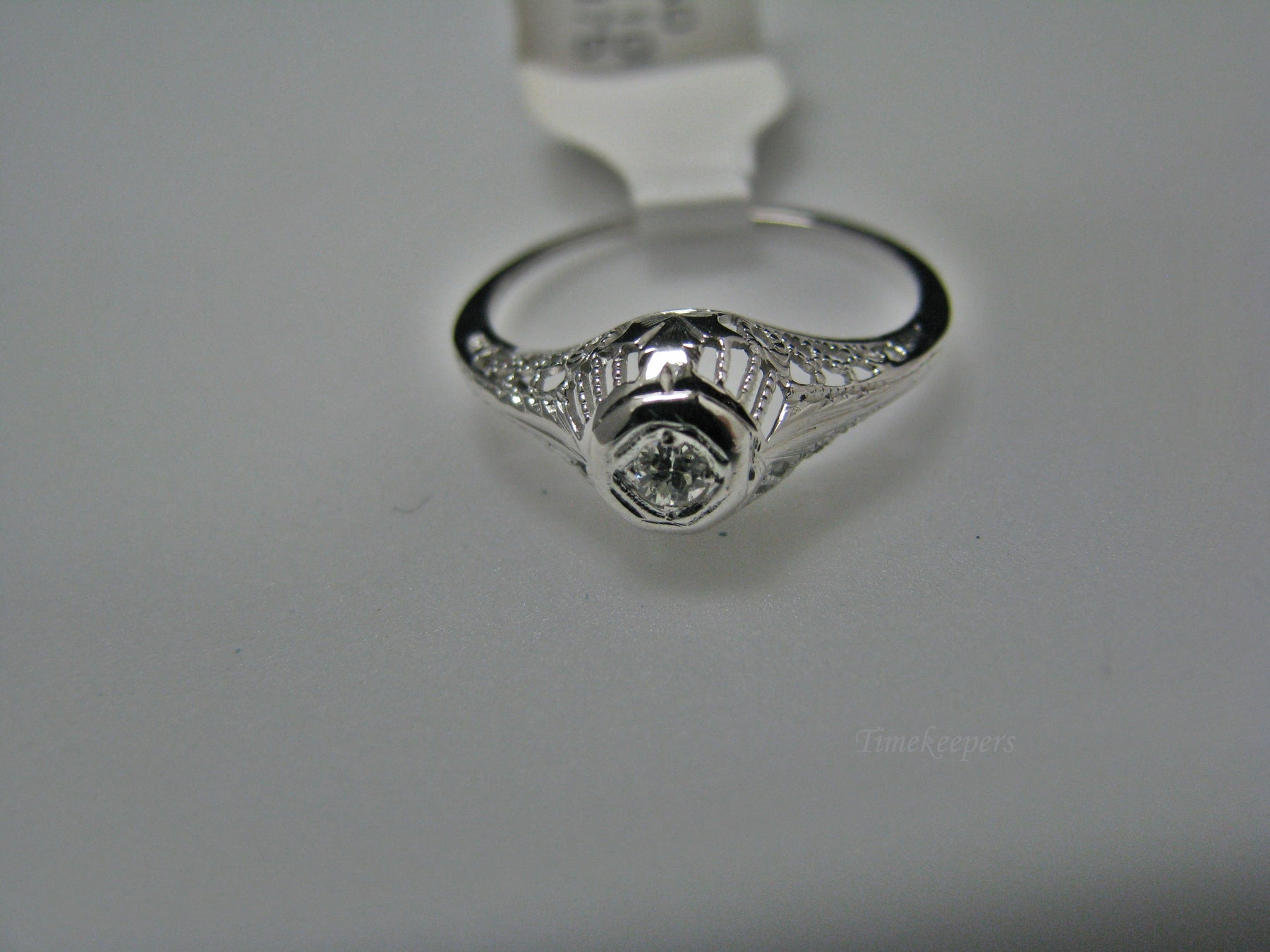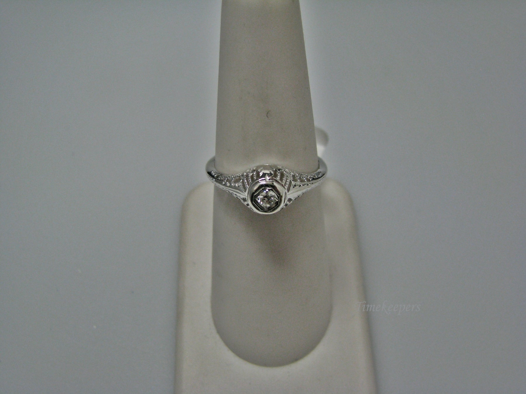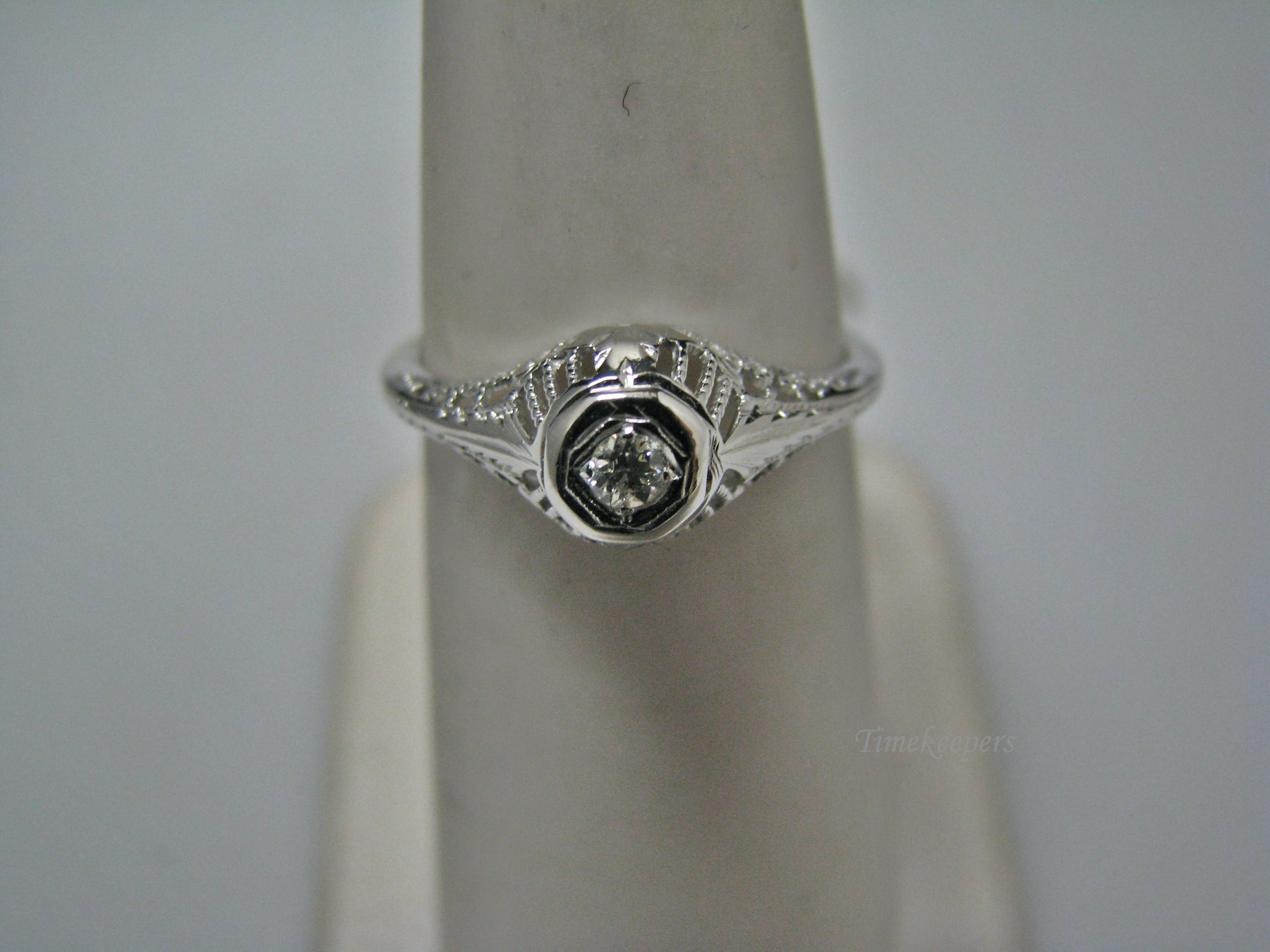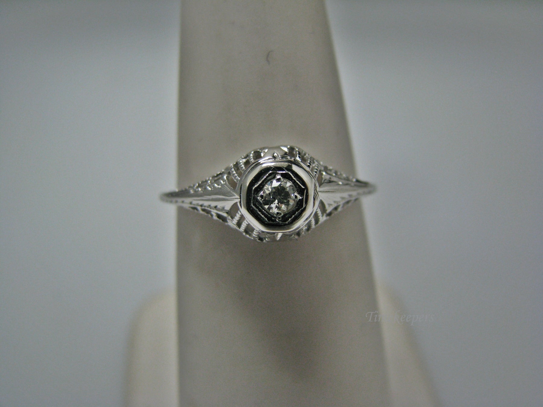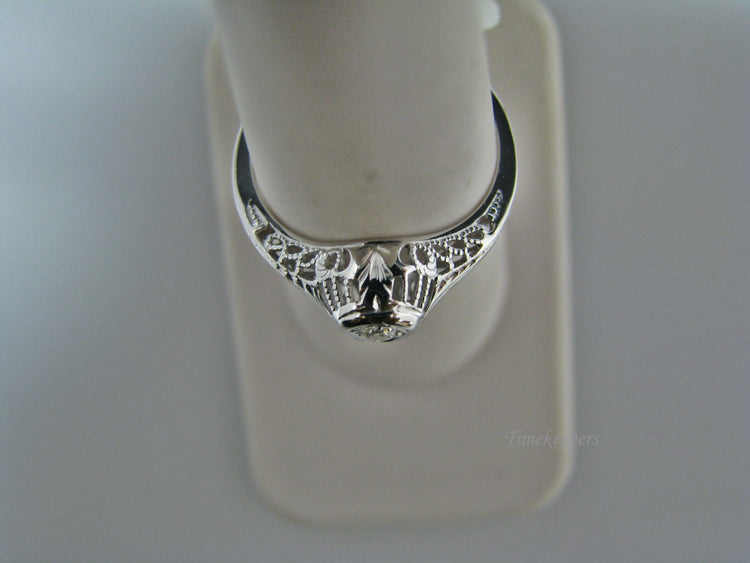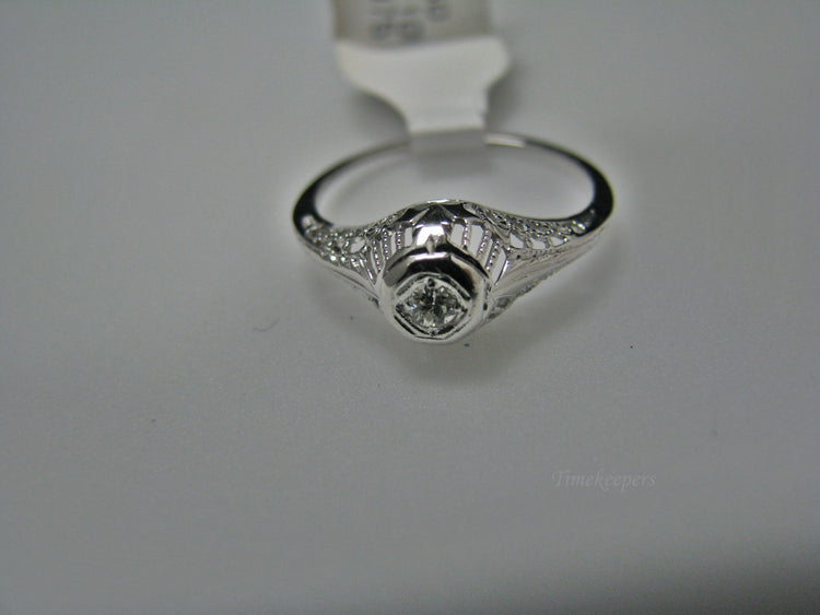 This stunning ring features a center 0.04 ct diamond. This ring has a beautiful filigree mounting down the side. The shank is decorated half way down. The ring is not stamped 14k, but it was tested for it.