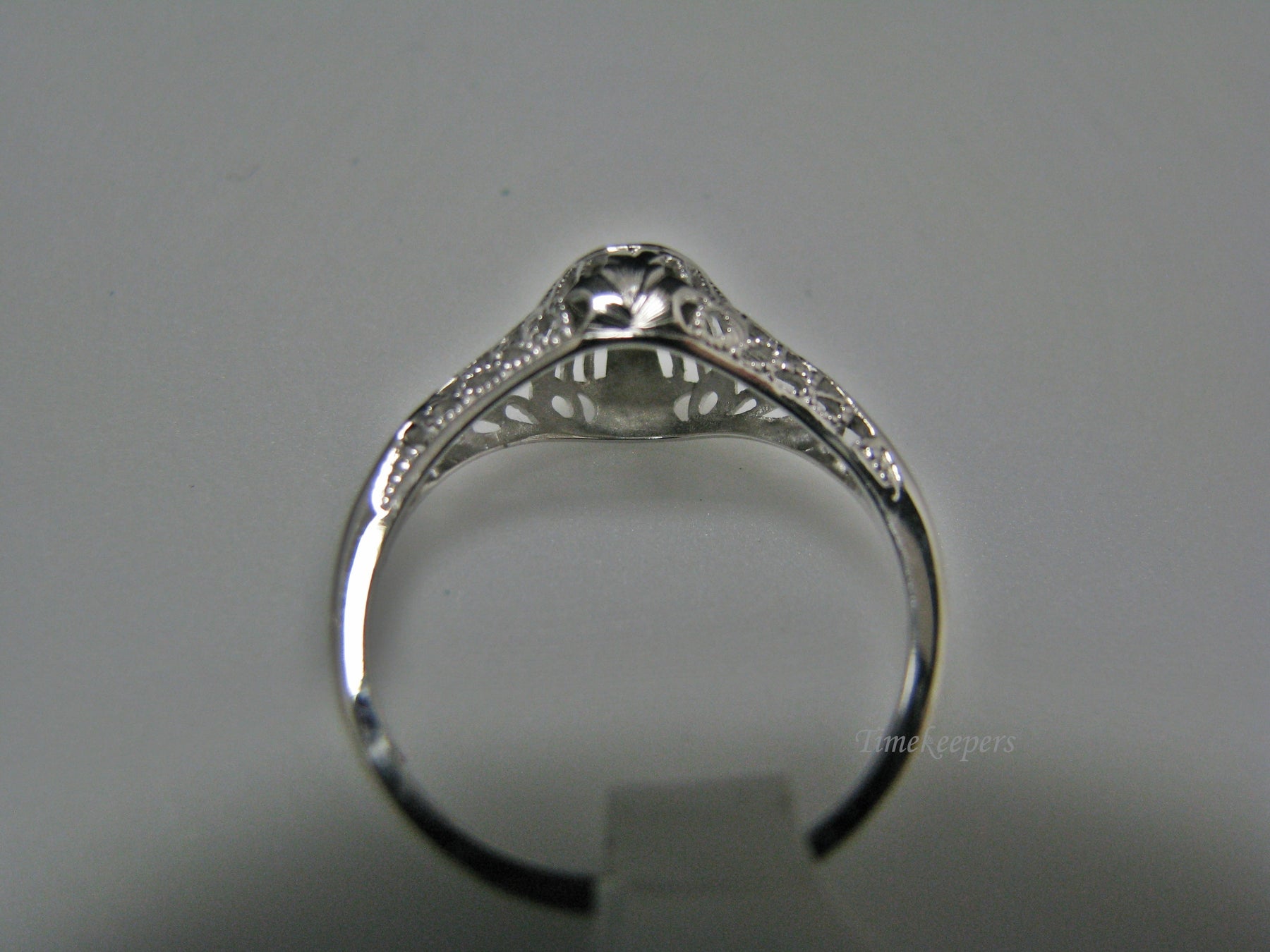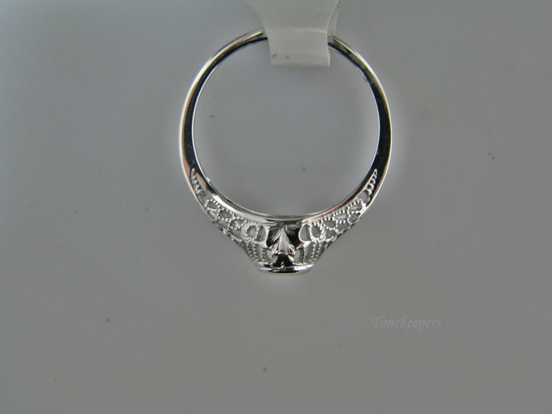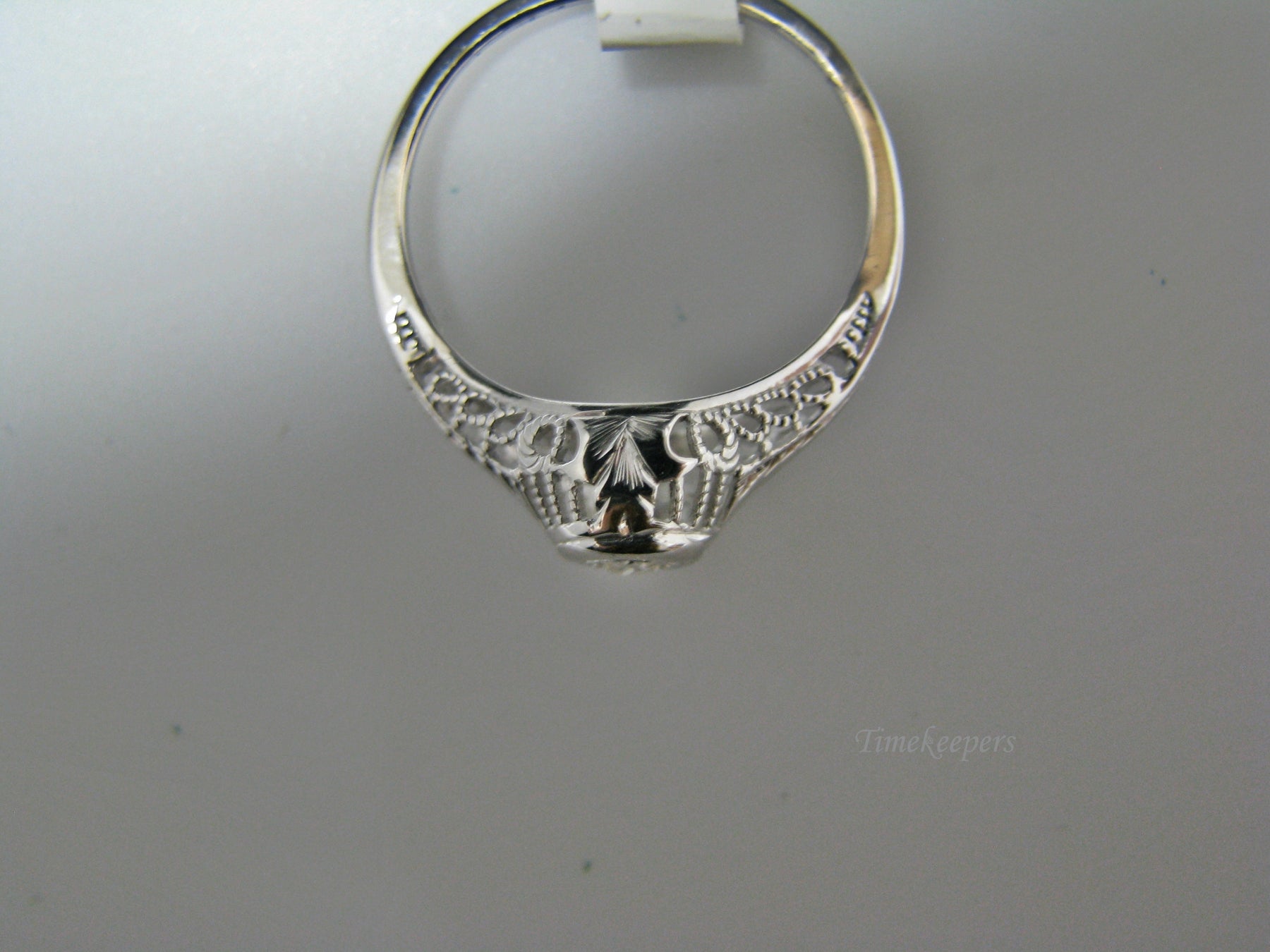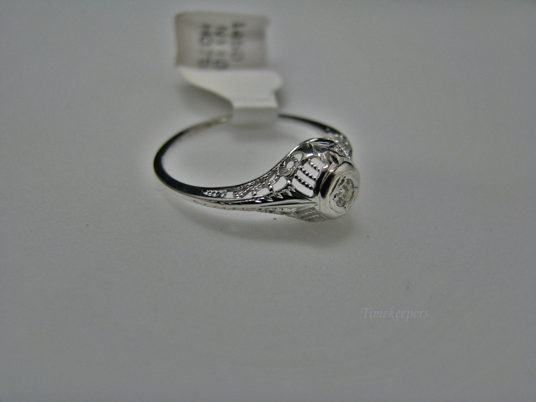 This stunning ring features a center 0.04 ct diamond. This ring has a beautiful filigree mounting down the side. The shank is decorated half way down. The ring is not stamped 14k, but it was tested for it.