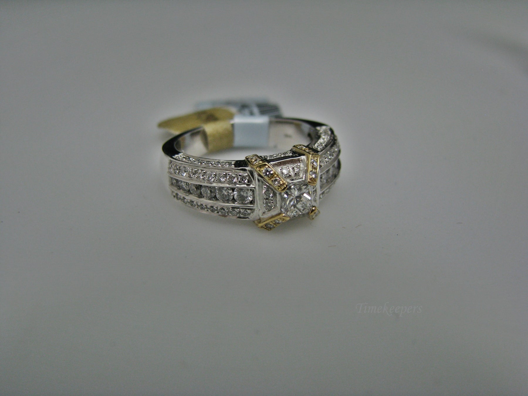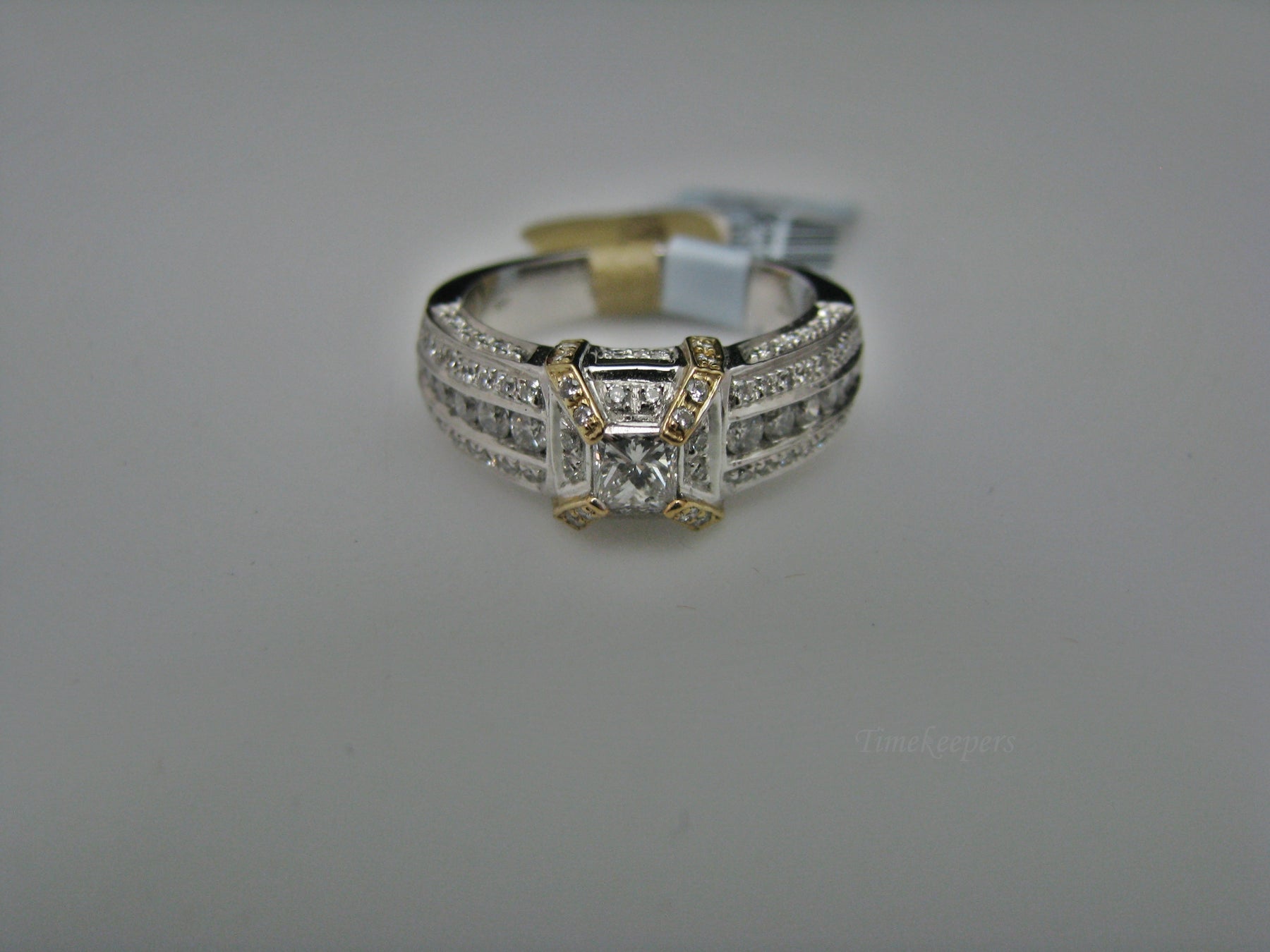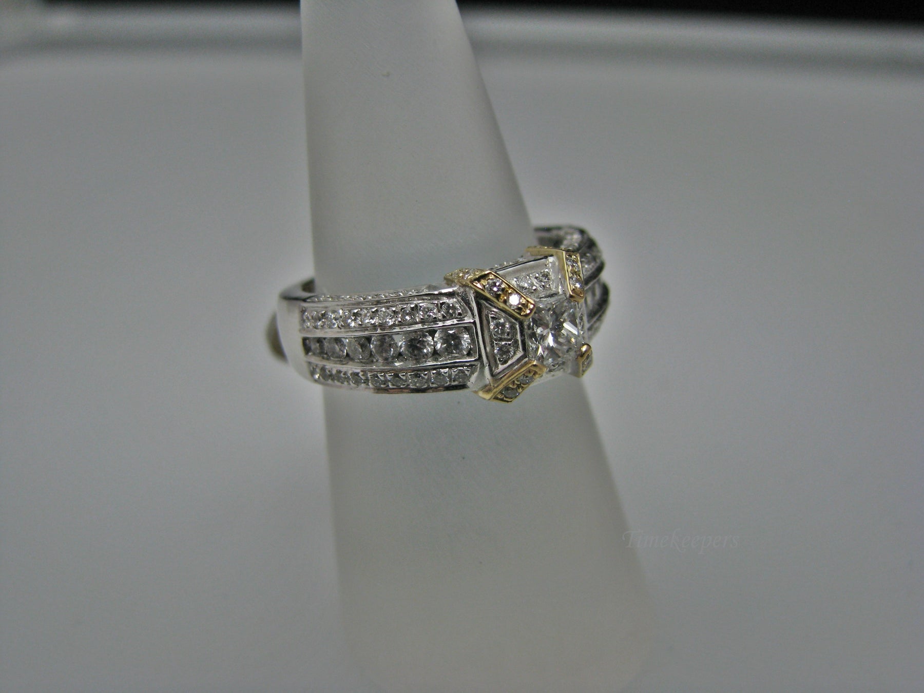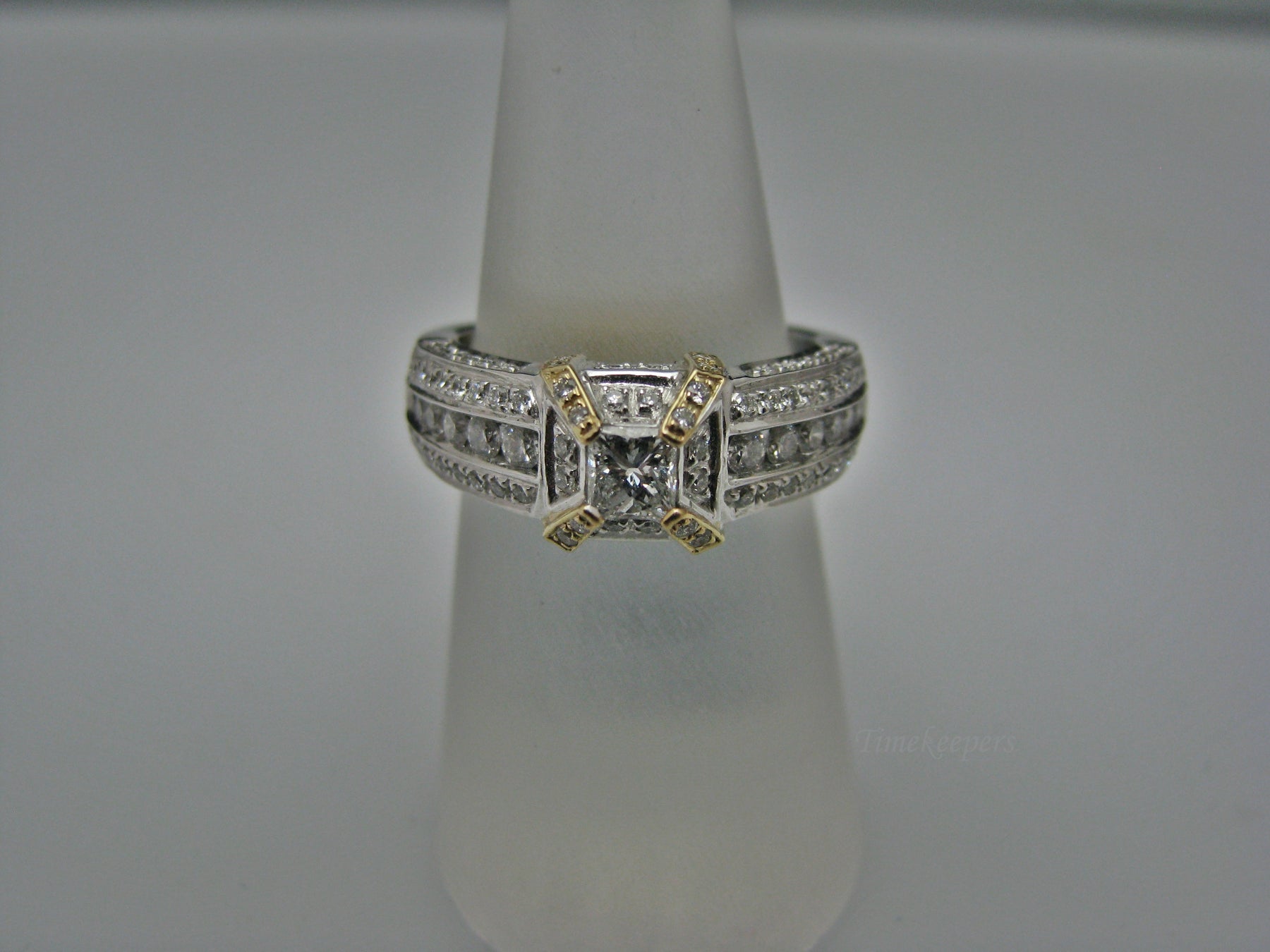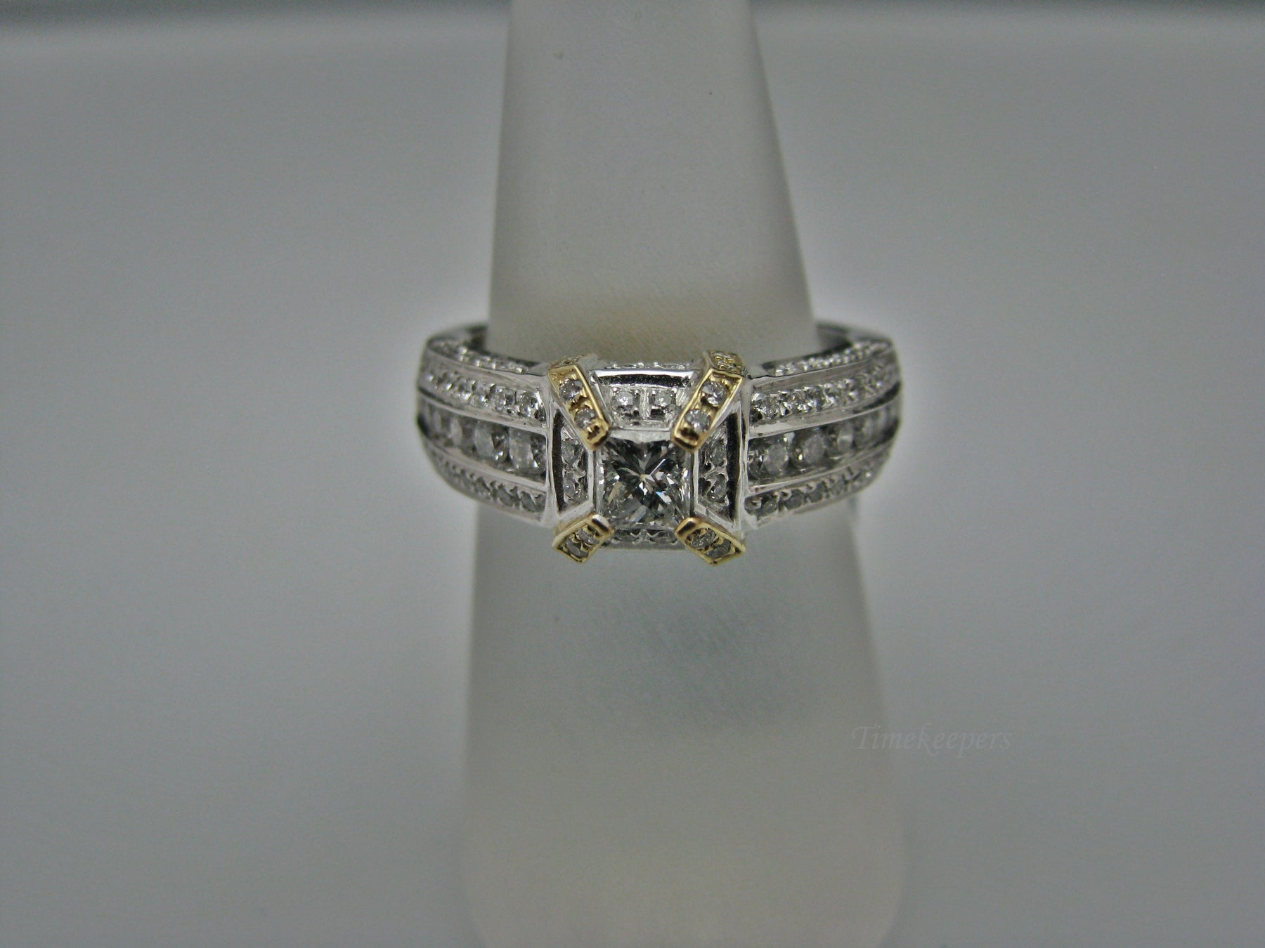 Specifics: 14k White and Yellow Gold Center Diamond is 0.35ct (Princess cut) Smaller Diamonds with different sizes TCW is 1.05ct Total weight of ring 7.9 grams