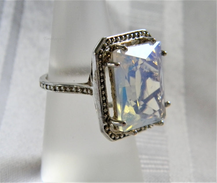 This pretty ring features an emerald cut iridescent glass stone in a silver frame. Silver balls around the stone and down each side of the shank.