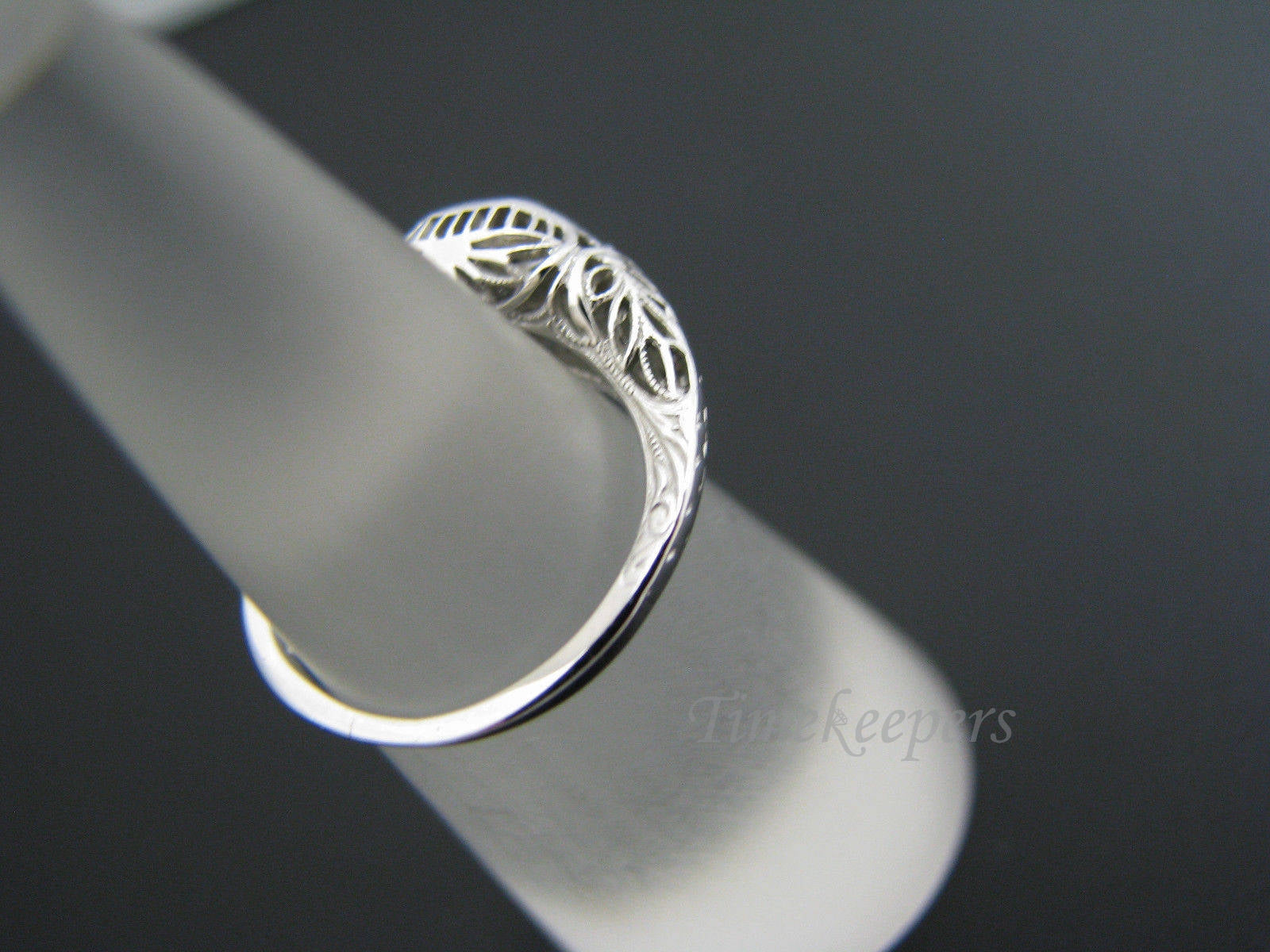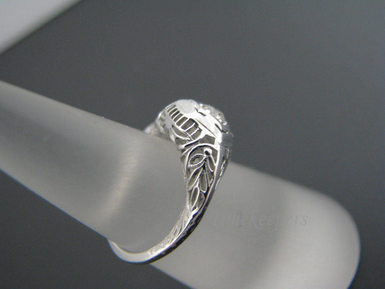 This stunning ring features a center .14 ct diamond. This is a beautiful filigree mounting. The inside of the ring is stamped 18k. We believe this ring to be from the 1920's. A beautiful piece.