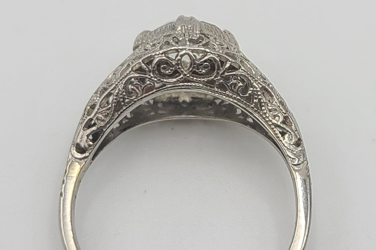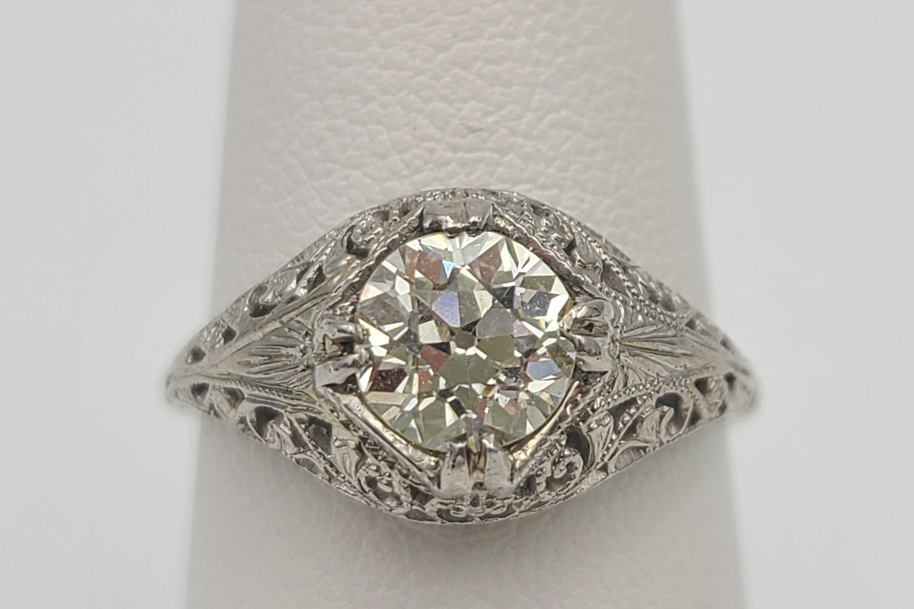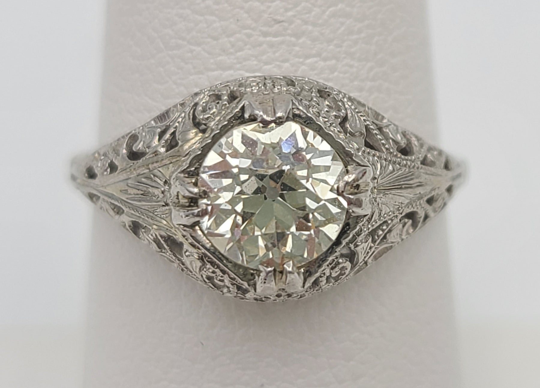 Large, sparkling 1.12ct diamond ~ set in solid a platinum filigree setting and 14kt white gold shank. Shank is not stamped and looks like it was replaced at one point because of the difference in metals. Ring was tested on our GemOro AuRacle AGT3 machine and showed the top filigree as platinum, and shank as 14kt. Size 7