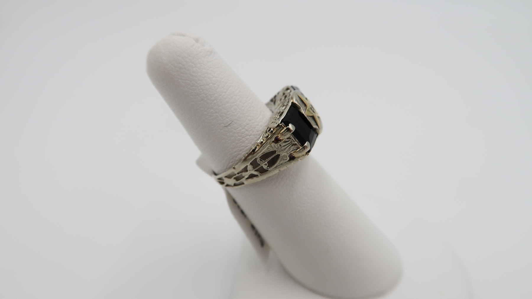 This Order of the Eastern Star ring features gorgeous filigree details amongst the bold black onyx centerpiece. Crafted of 14 karat gold this 1920s ladies piece is in wonderful condition with a perfect polish!