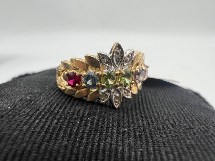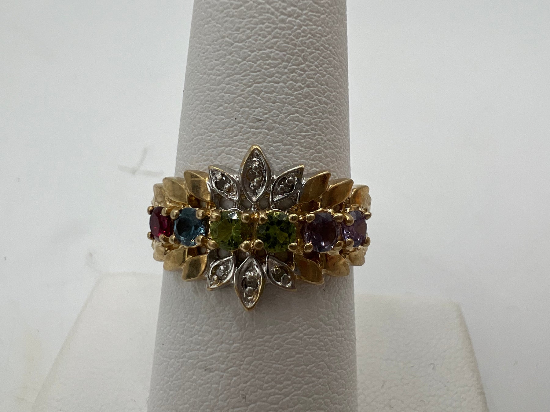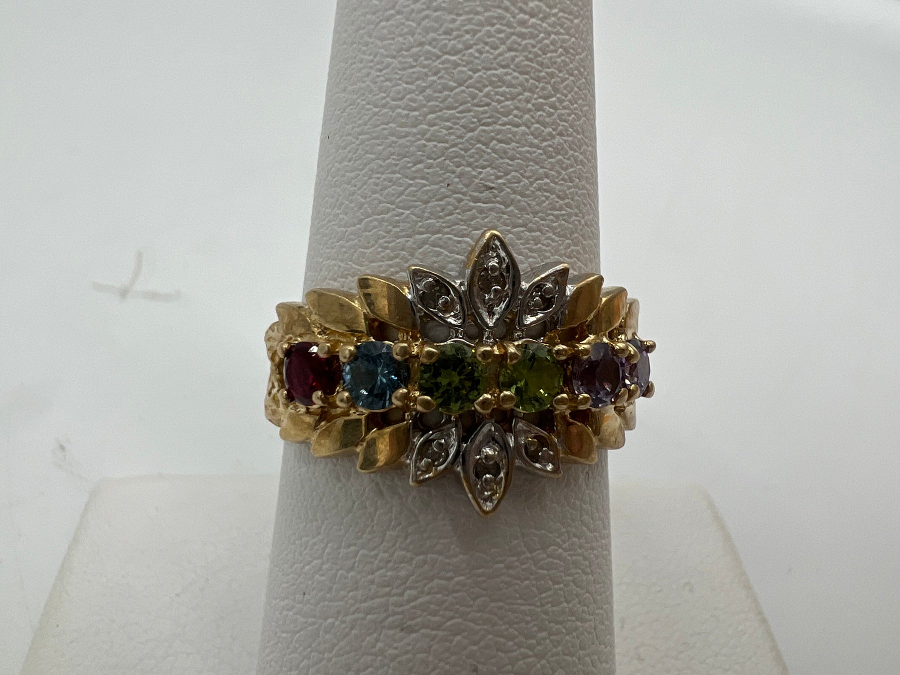 This ring is made of yellow and white 10kt gold. It is two toned, as displayed in the photos. The gemstones are ruby, blue topaz, peridot (x2), alexandrite, and amethyst. It weighs 3.6 grams and it's a size 7.75.