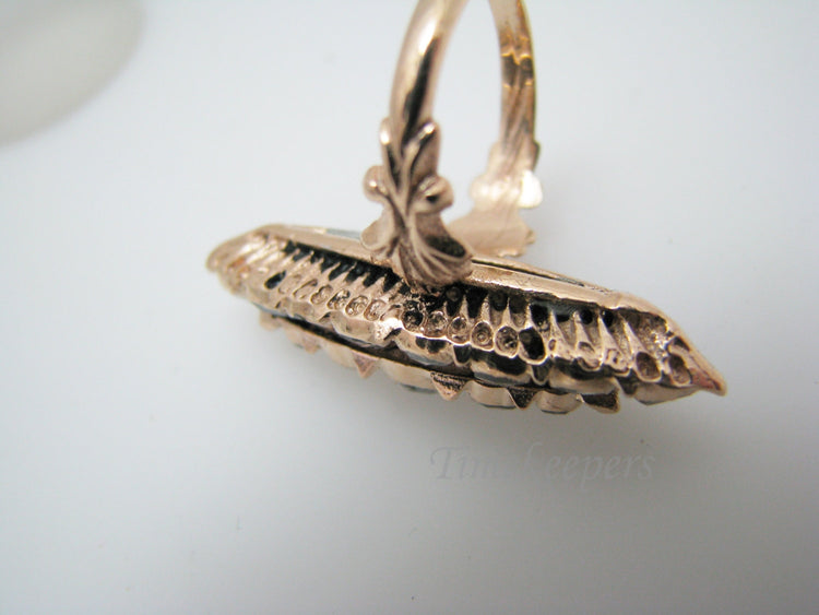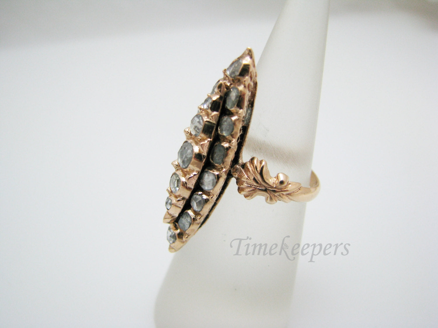 This is a very unique ring in 10k rose gold with (19) single rose cut diamonds set in a tiered ellipse mounting.  The mounting is very decorative with filigree.  This ring is not marked but has been tested to 10k gold. Would be a nice antique gift for her!