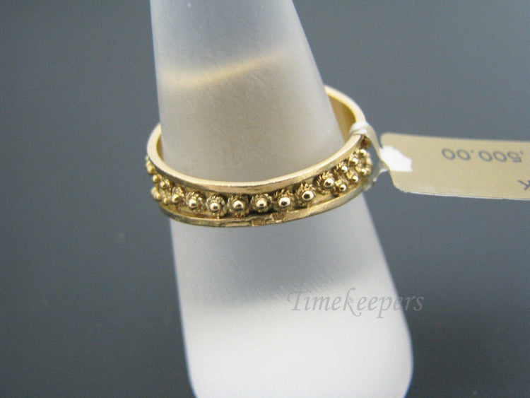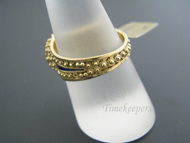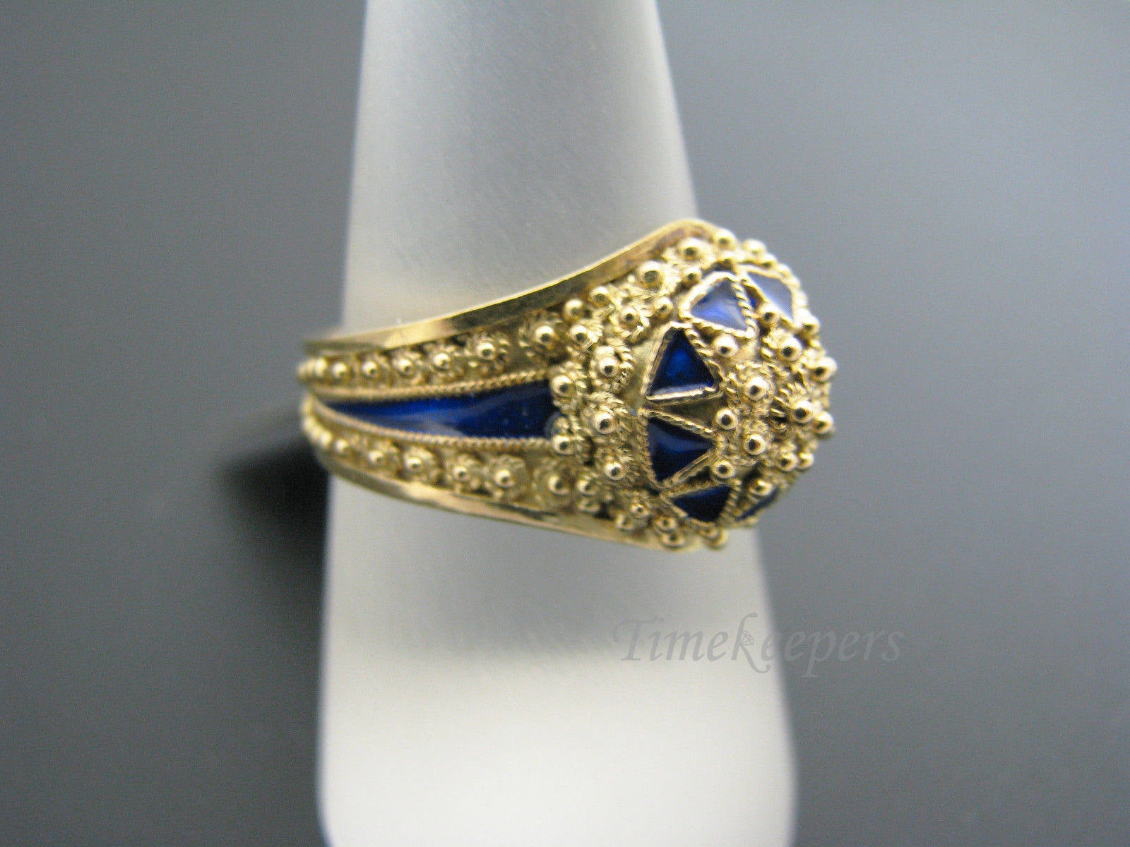 This is an absolutely unique ring! The ring features a domed top with a star design and blue enamel between each point. The base of the dome features small gold balls all the way around. The band features a center stripe of the blue enamel with a row of gold balls on either side. The balls form into one line of gold balls at the bottom of the ring. This ring is stamped but I can't read it on the outside bottom. This ring has been tested to 21k yellow gold.