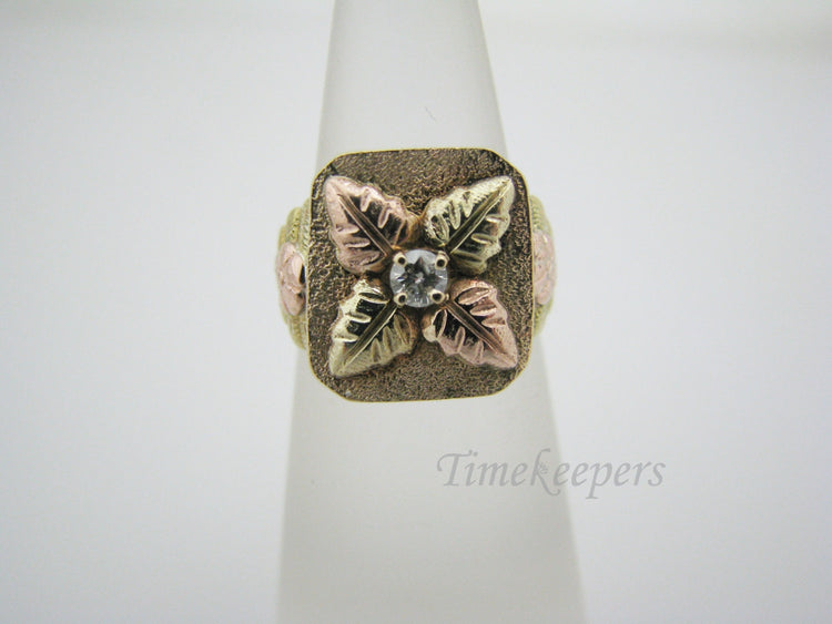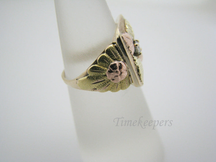 This stunning ring features a single diamond set in the center of four leaves atop this beautiful flat top ring. Two of the leaves are rose gold and two are green gold set on yellow gold. Either side of the ring features a rose gold flower with green gold leaves around. The majority of the shank is yellow gold. The inside of the shank is stamped 10.