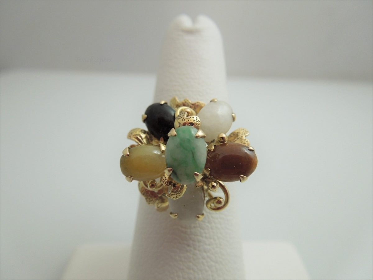 g954 Beautiful Ladies Vintage 14kt Yellow Gold Multicolored Jade Ring