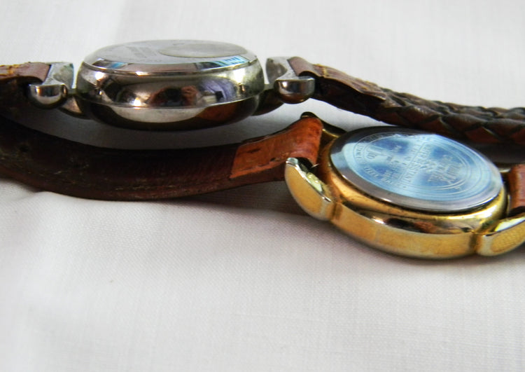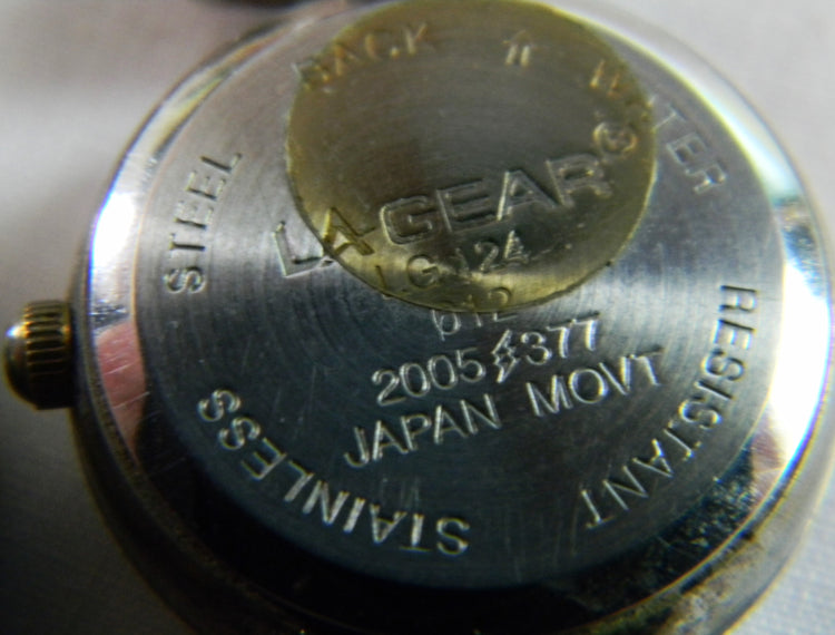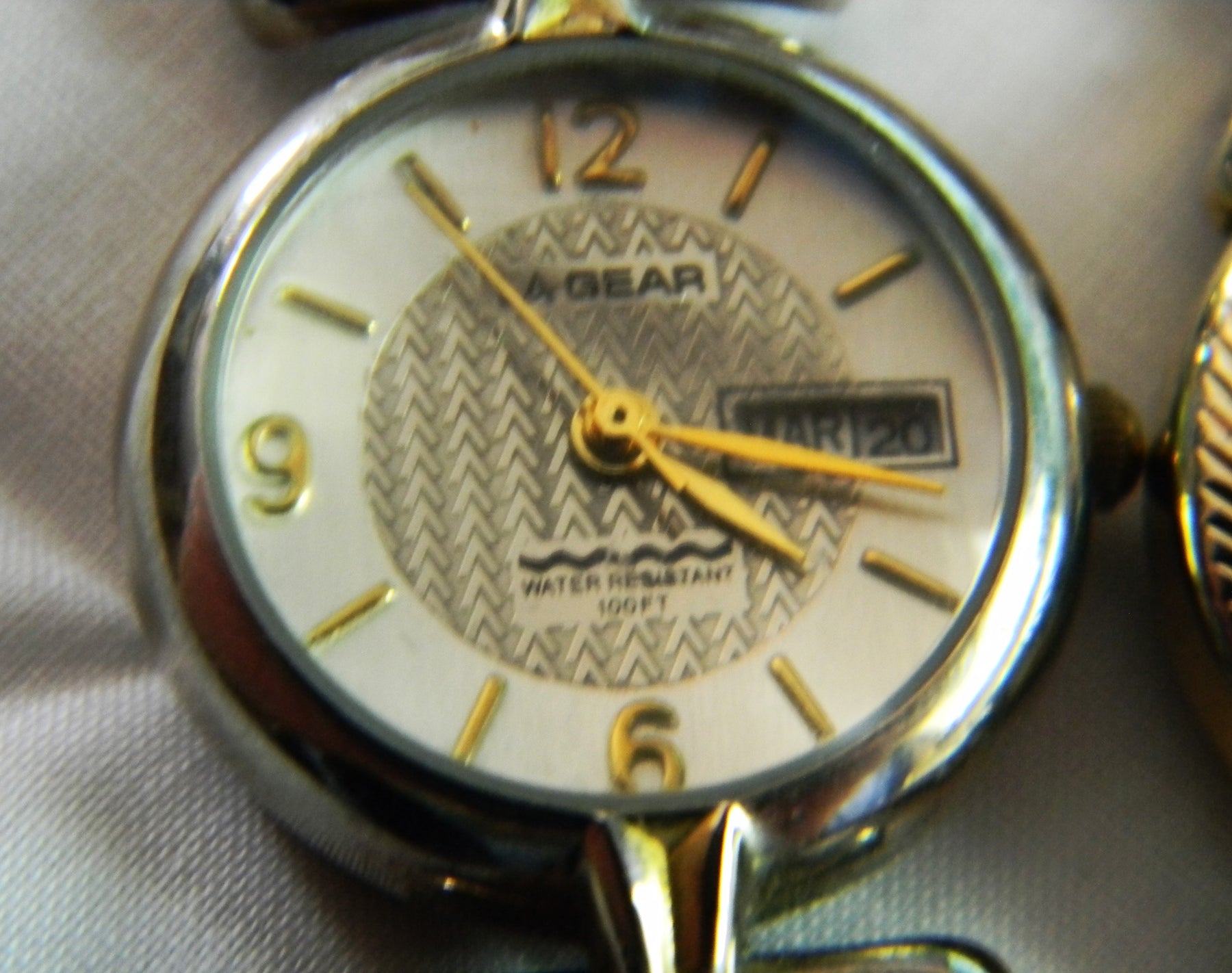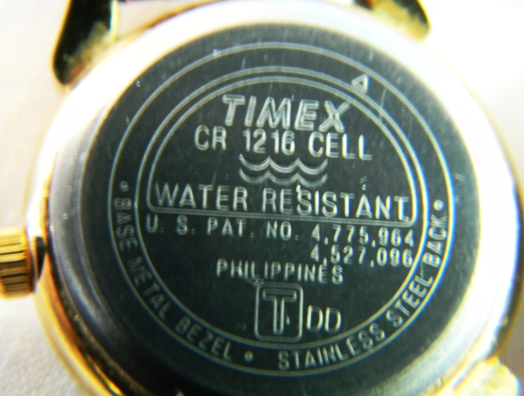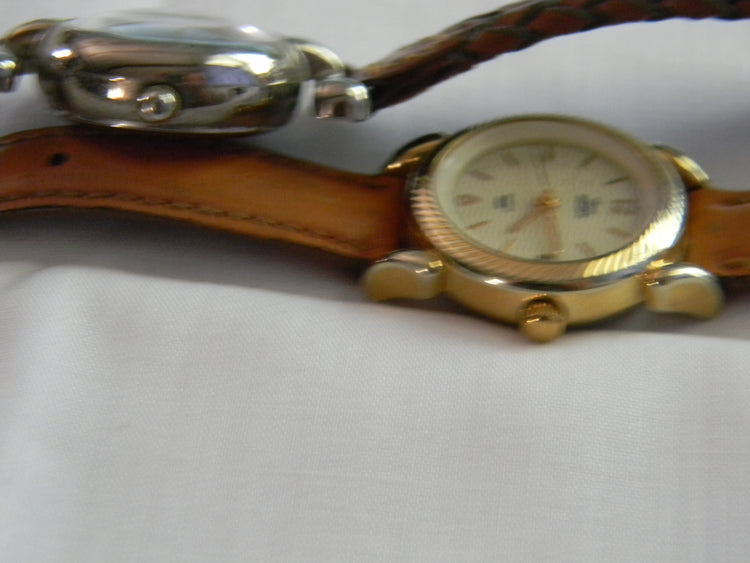 The second watch is a women's Timex Indiglo with the date at the 3 o'clock position. This watch does have a gold tone case and a brown leather band. This band does show a lot of wear. The Indiglo back lite does work.