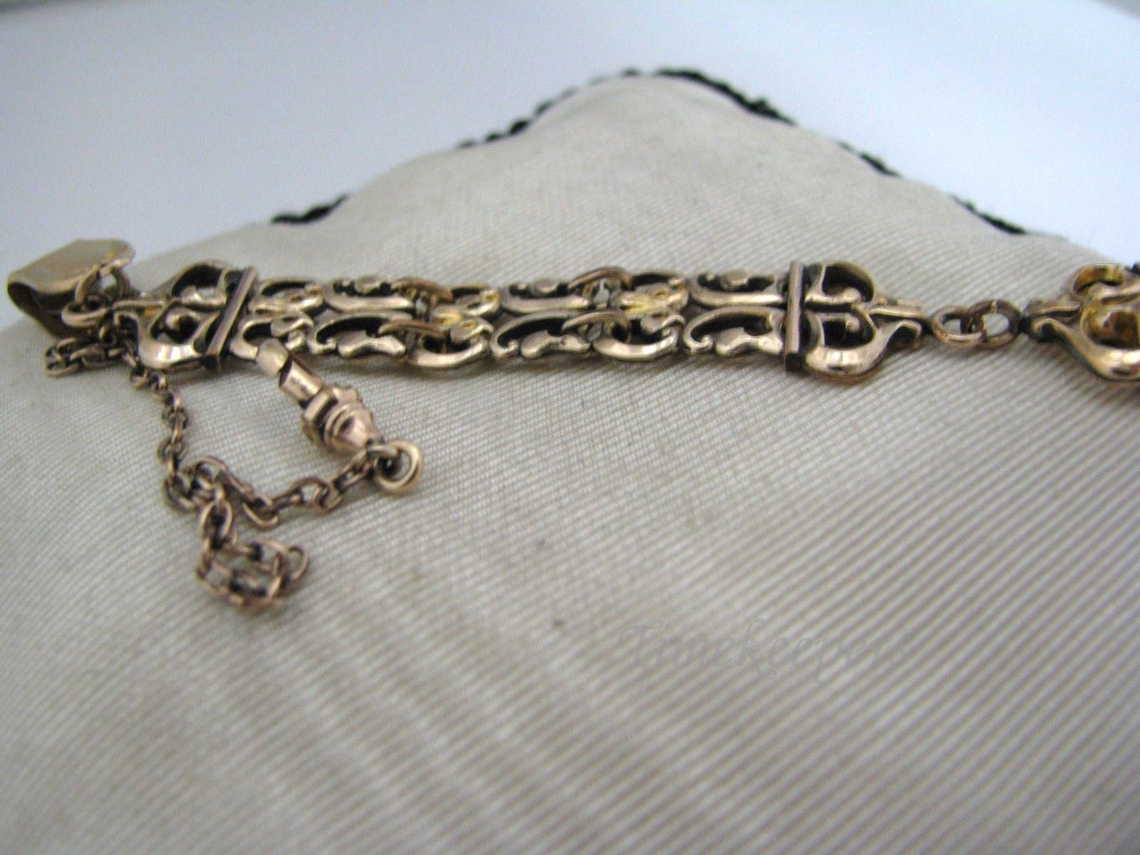 This fob features (3) filigree links with a signet. The fob is 10k yellow gold and 2 1/2" long and 1/2" wide hanging from a waist clip. The signet is 5/8" long and 9/16" wide, gold filled. The watch chain is 4 3/4" long, gold filled. The fob and chain are in good cosmetic condition for their age. They have light wear, and light discoloration from being lightly used and aging. The watch spring clasp is stamped J.E.S.S.