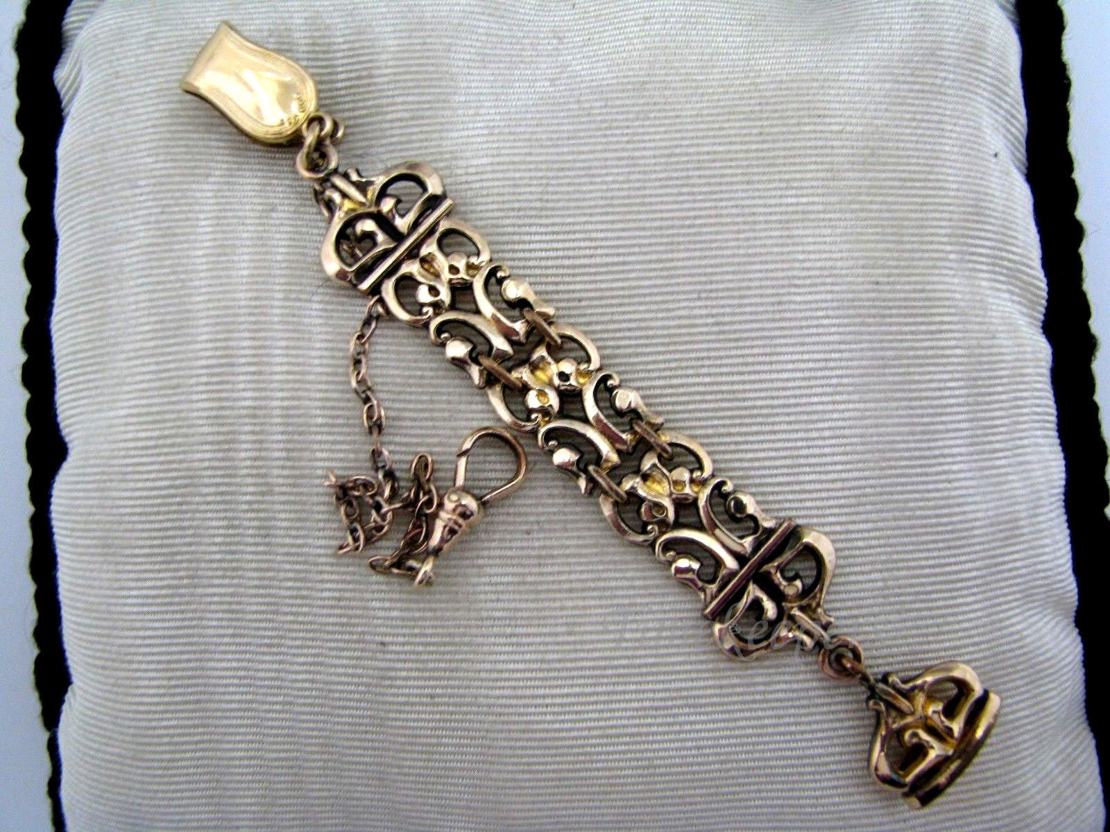 c383 10K Vintage (3) Filigree Link Fob w/ Pocket Watch Chain on Waist clip and Signet