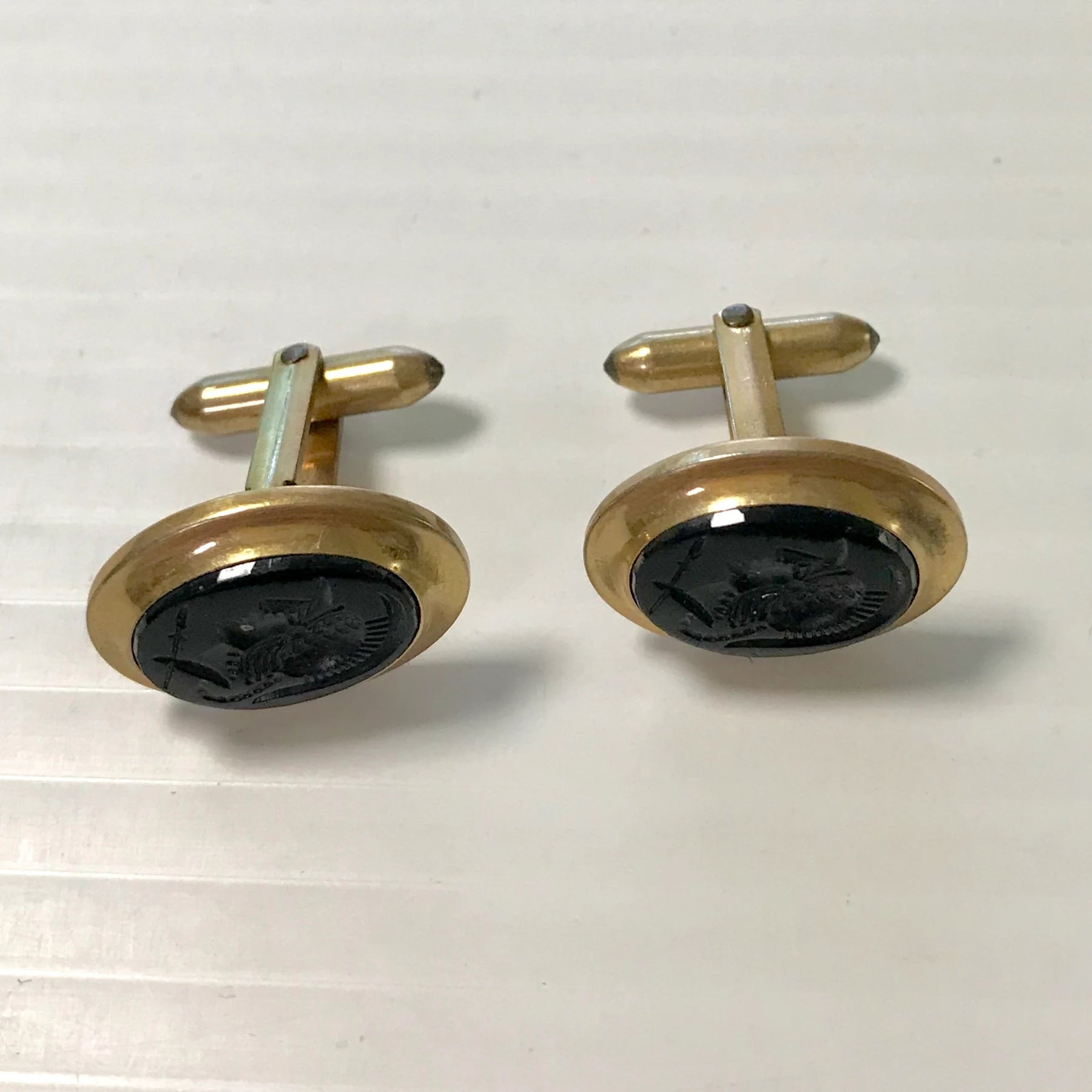 Vintage Gold Tone Cuff Links. Oval shape with Carved warrior on black filling