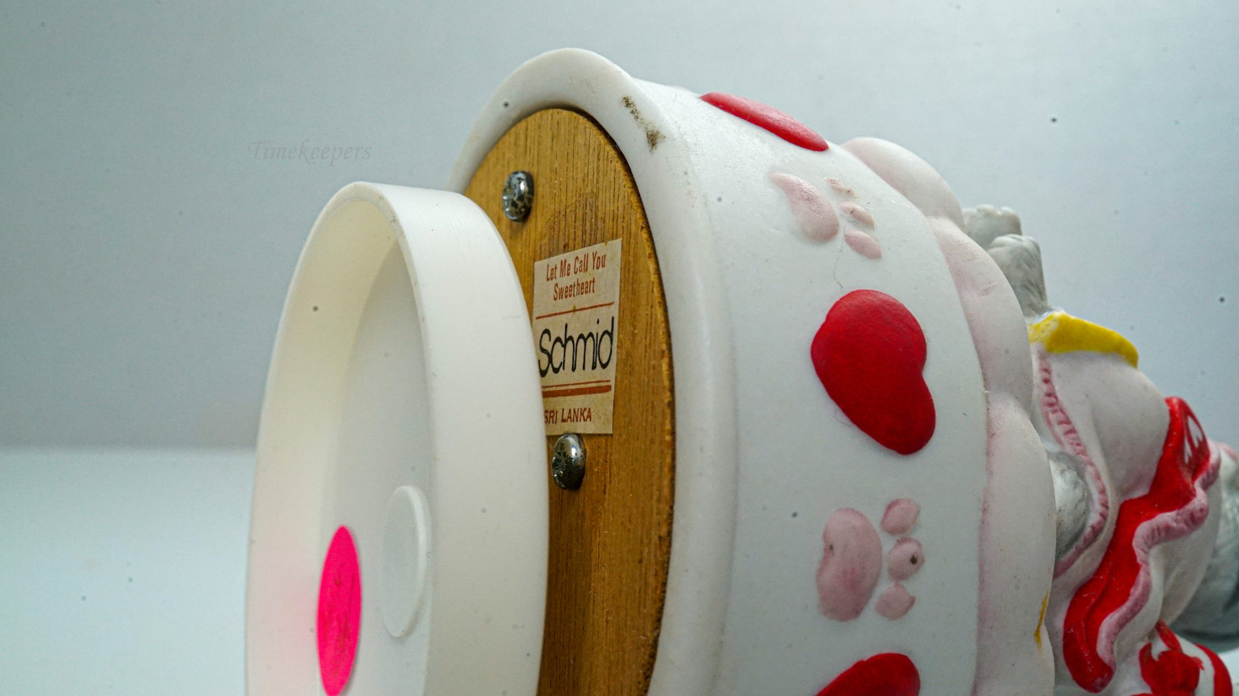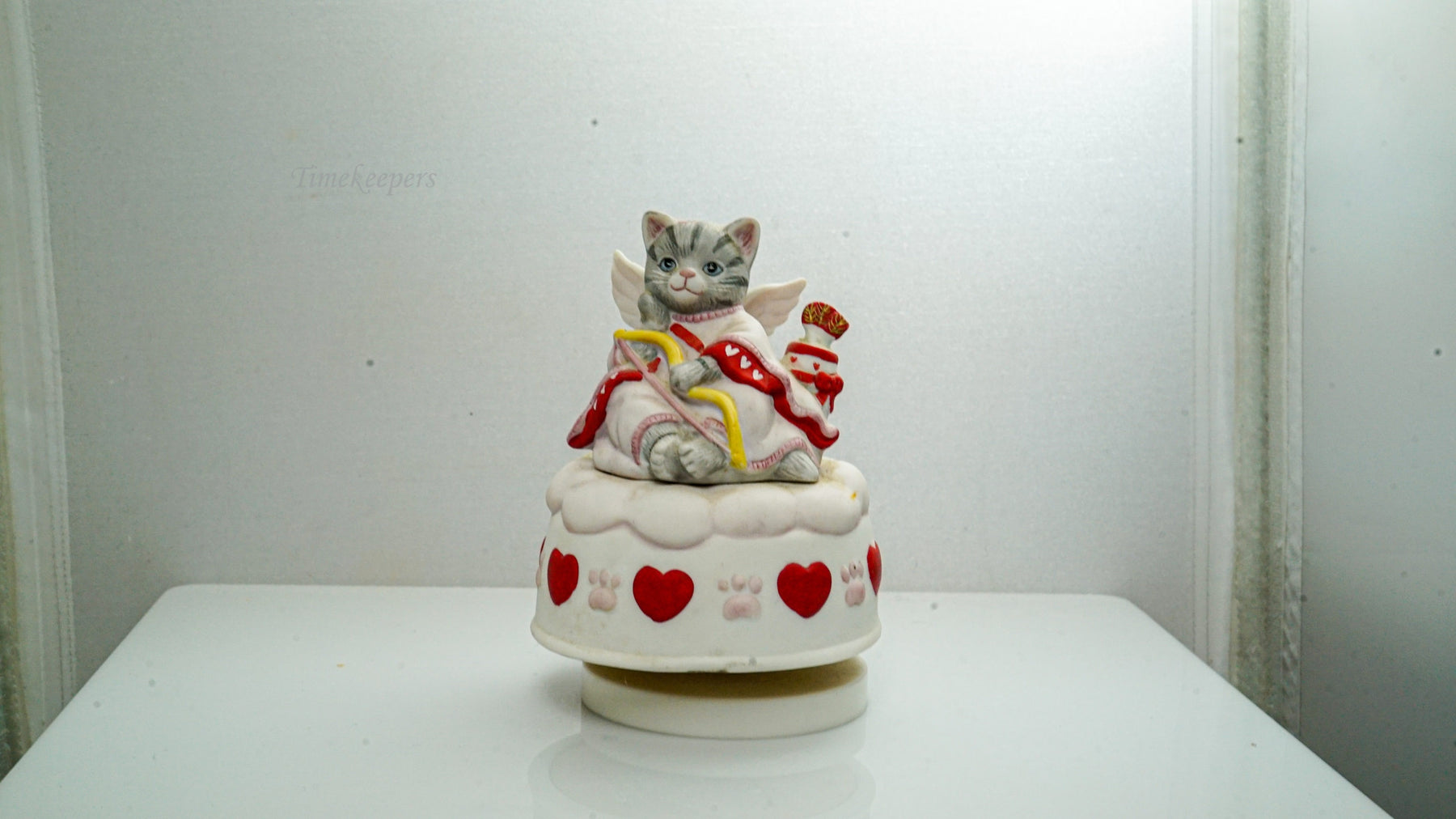 Very cute cat music box. This cat sits on top of what appears to be a cake. It plays "Let Me Call You Sweetheart"