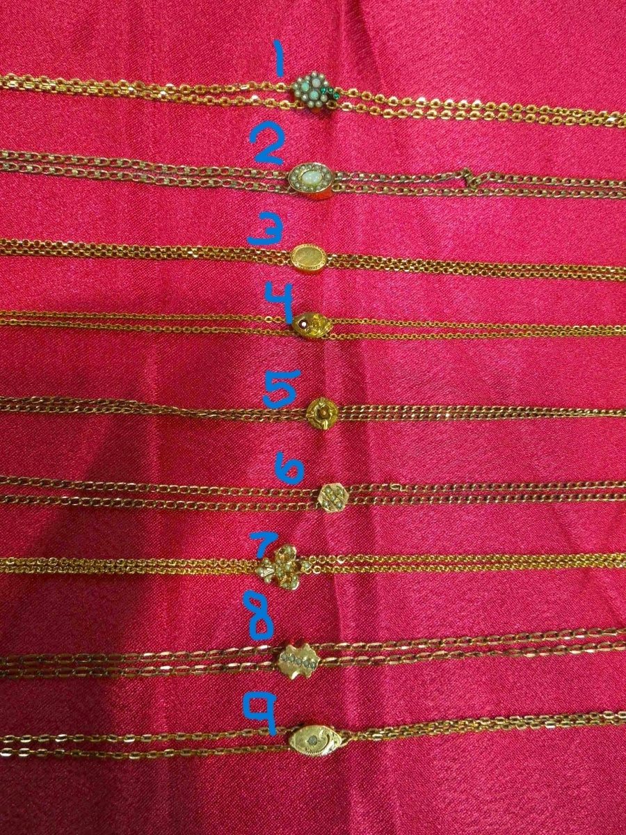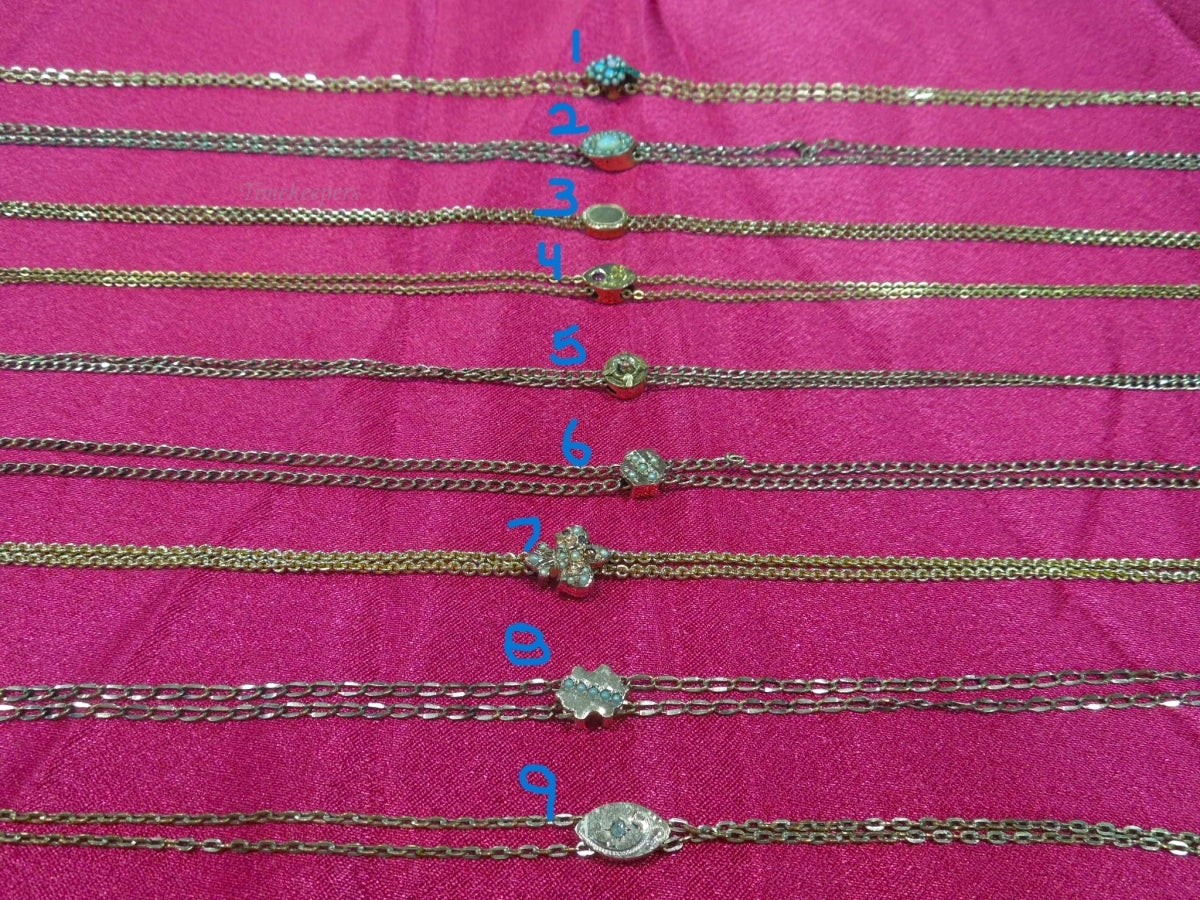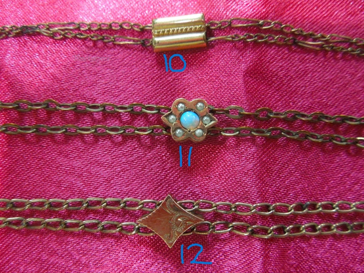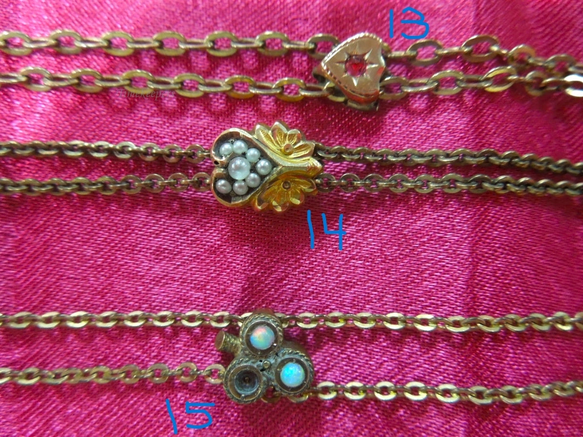 These are nineteen different gold-filled pocket watch chains, each featuring a different slide charm. Some have seed pearls, some contain opals or rubies. They are sold separately and have their own individual #. So if there is a particular one you would like to buy, just let us know which number from our photos. Would be a nice gift for him or her! **Note, some slides are missing stones**