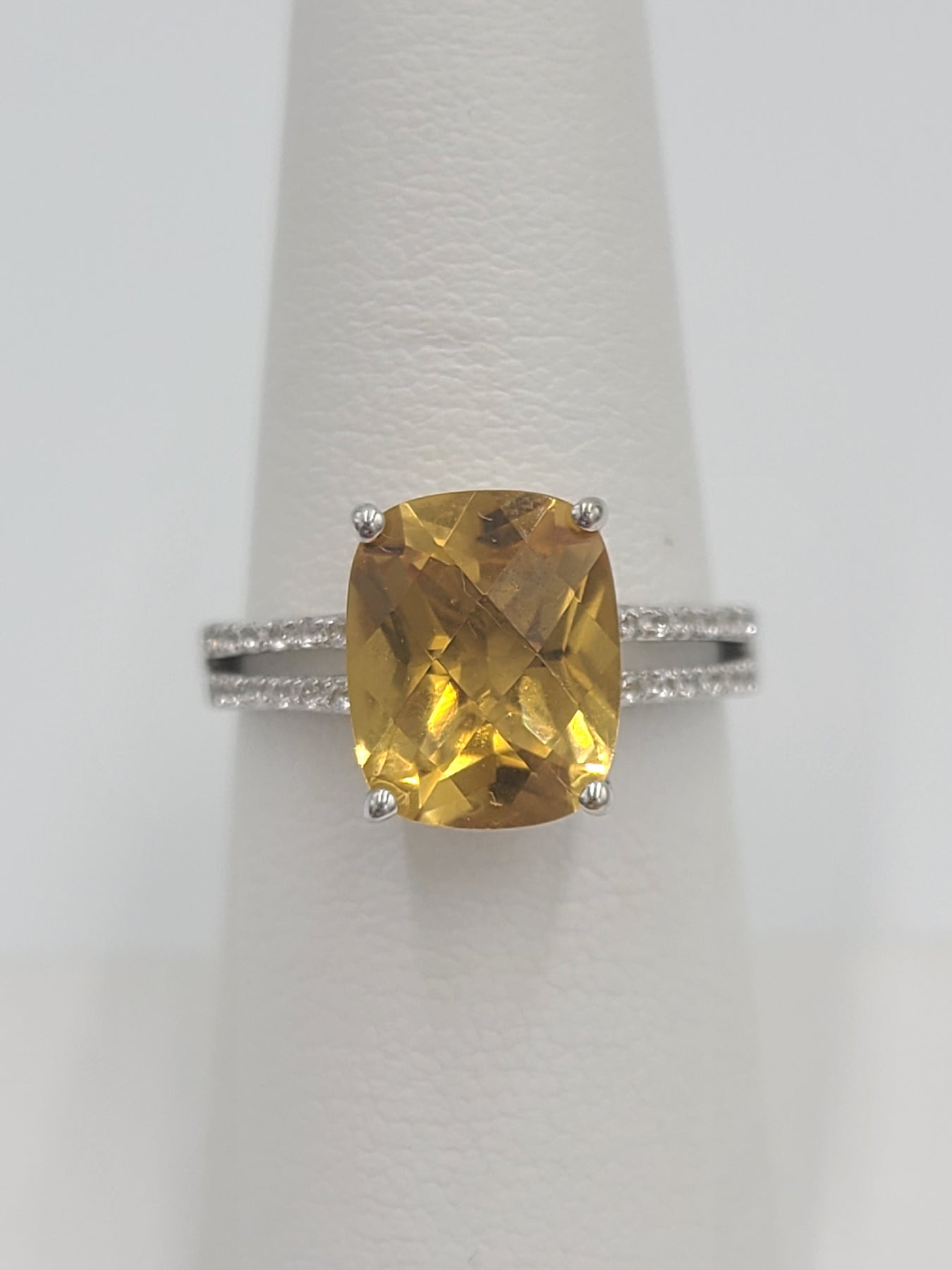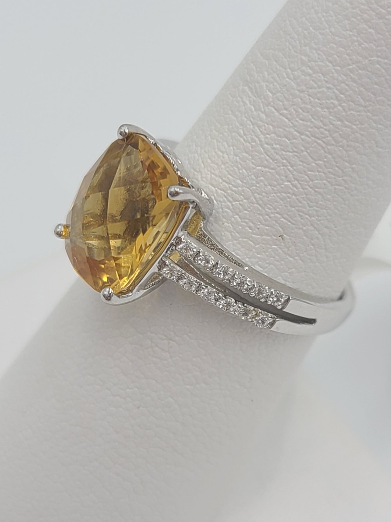 This is a lovely cushion cut citrine ring perfect for your November baby!! Set in a lovely sterling silver setting, it features a double row of cubic zirconia stones tapering each side of the center citrine. Perfect for daily wear. Shank is stamped 925