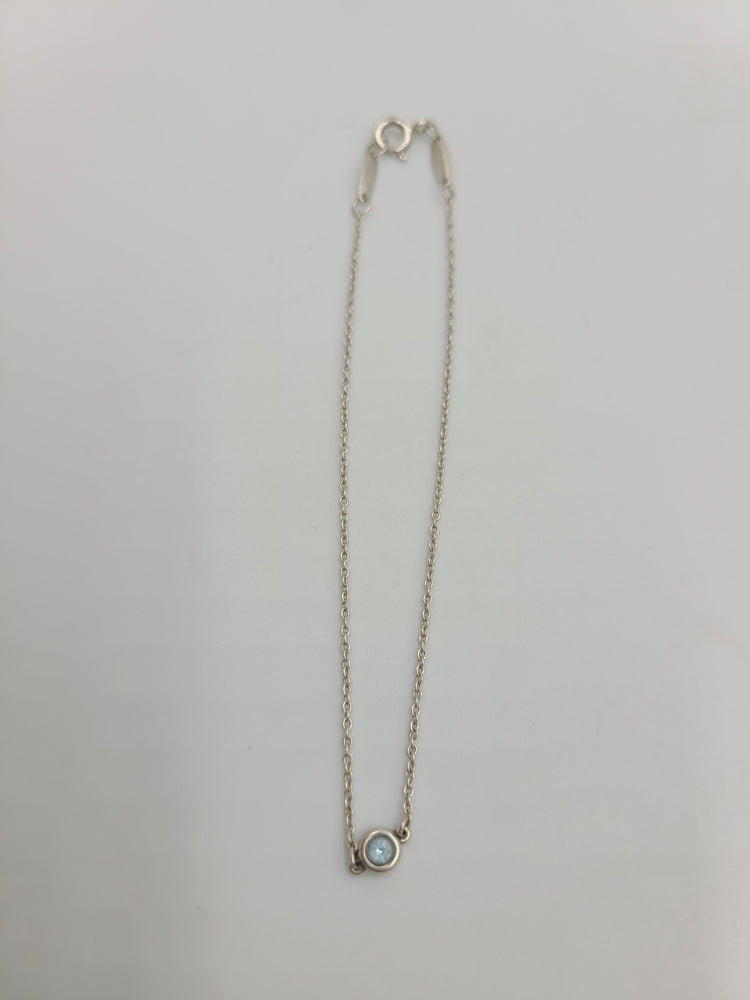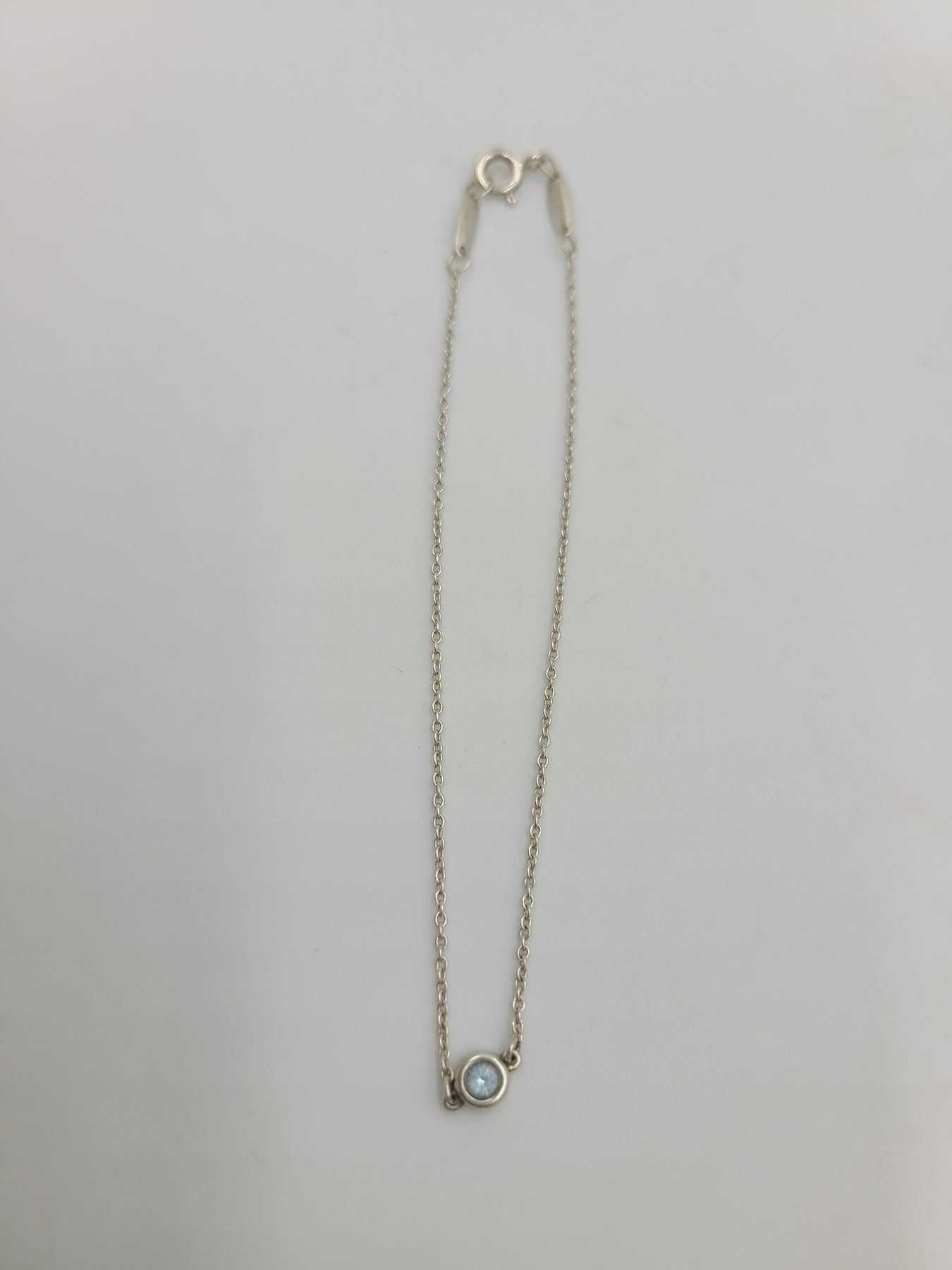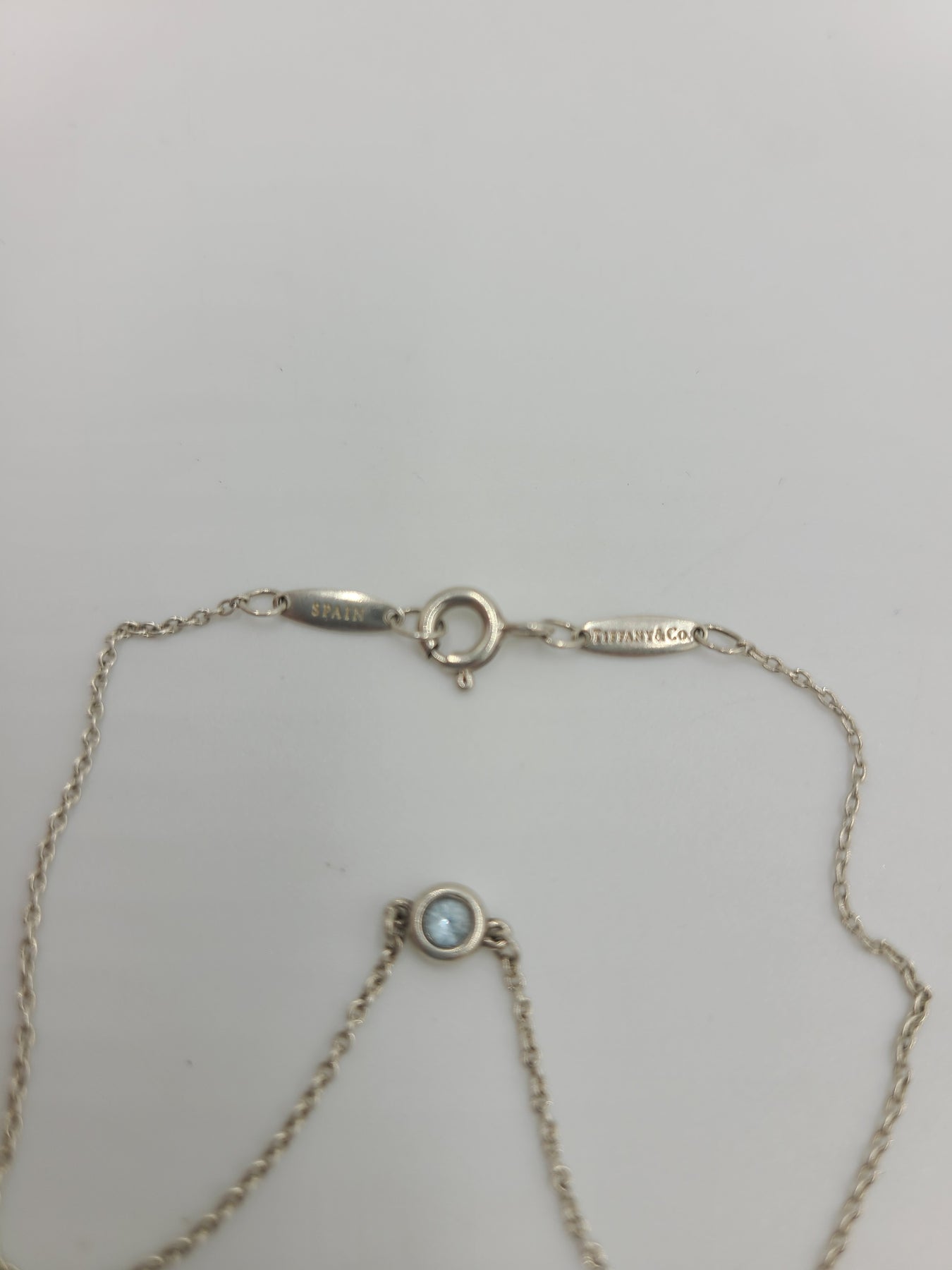 This is a cute Elsa Peretti Tiffany & Co, bezel set blue topaz stone set in sterling silver. 8" in length and is stamped. Would be a nice anniversary, birthday, Christmas, Mother's Day or Valentine's Day present for her.