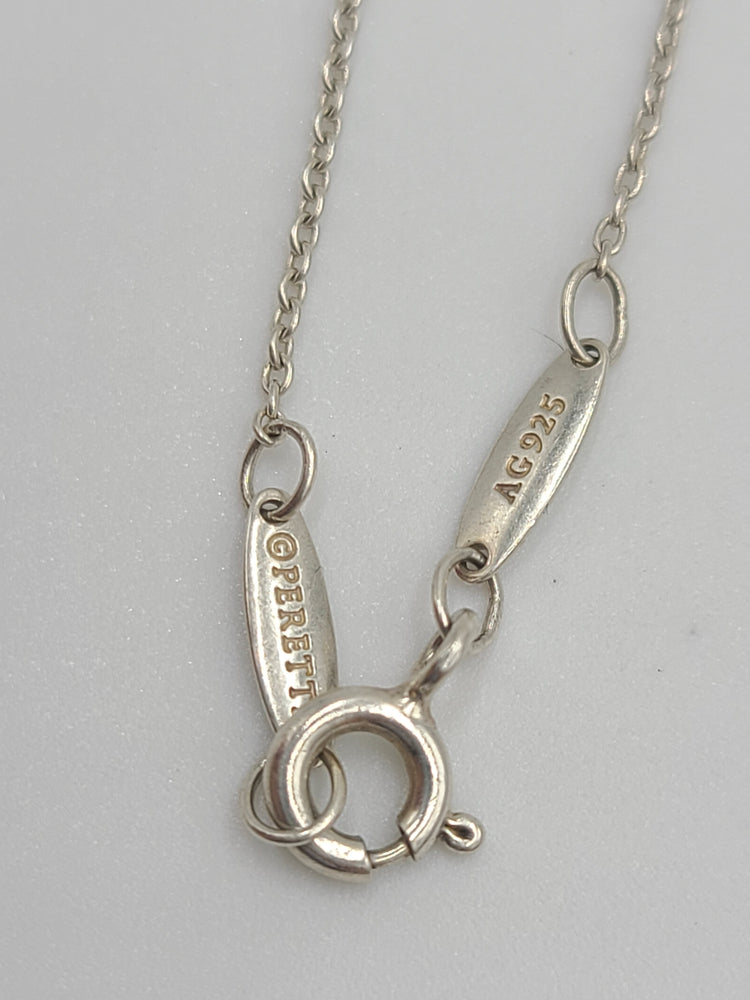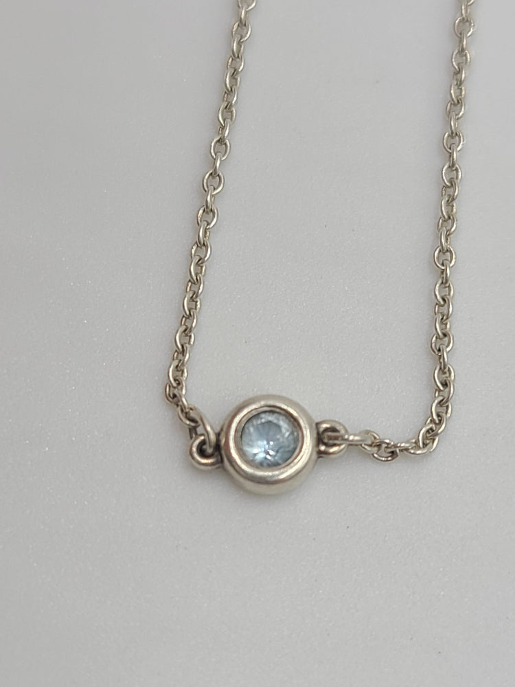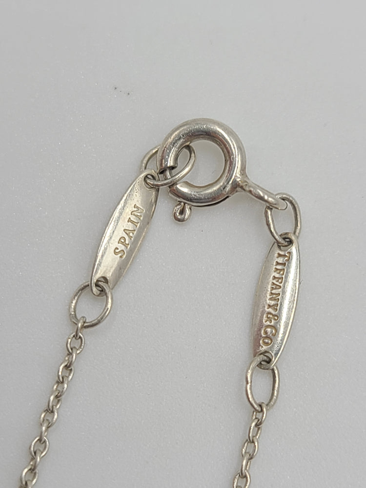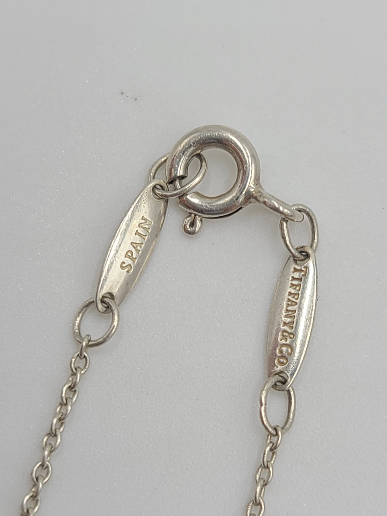 This is a cute Elsa Peretti Tiffany & Co, bezel set blue topaz stone set in sterling silver. 8" in length and is stamped. Would be a nice anniversary, birthday, Christmas, Mother's Day or Valentine's Day present for her.