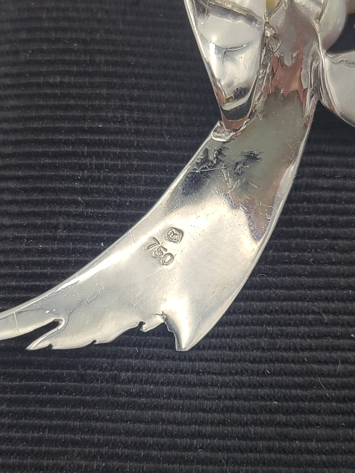 This beautiful vintage 18kt white gold pin features a cluster of beautiful freshwater pearls and a few diamonds to accentuate the pearls. The pin is made of high-quality 18kt white gold and has a silver color. It is signed 750 and in excellent condition. It is perfect for anyone who loves vintage jewelry and is looking for a unique piece to add to their collection. Would be a lovely anniversary, birthday, Christmas, Mother's Day or Valentine's Day gift for her!