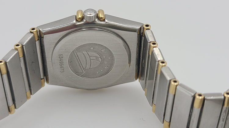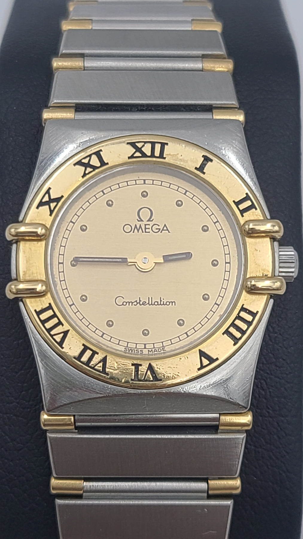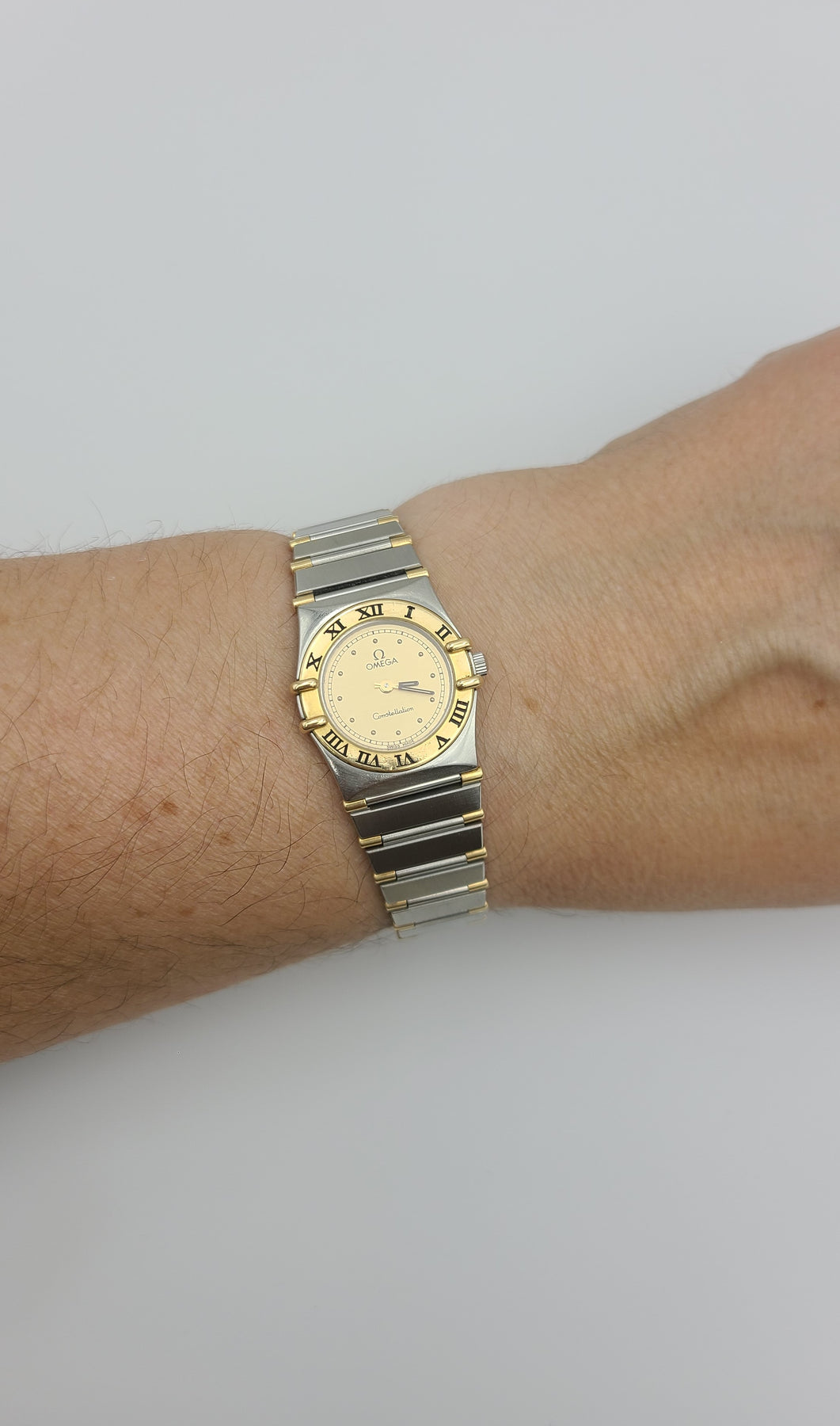 This is a nice ladies Omega Constellation quartz wristwatch. It features a 28mm case, Roman numeral bezel and two toned stainless steel band. Would fit up to a 6.25" wrist comfortably(6.5" is too tight). Perfect for daily wear. Stainless steel case. Would be a nice birthday, Christmas, Mother's Day or Valentine's Day gift for her.