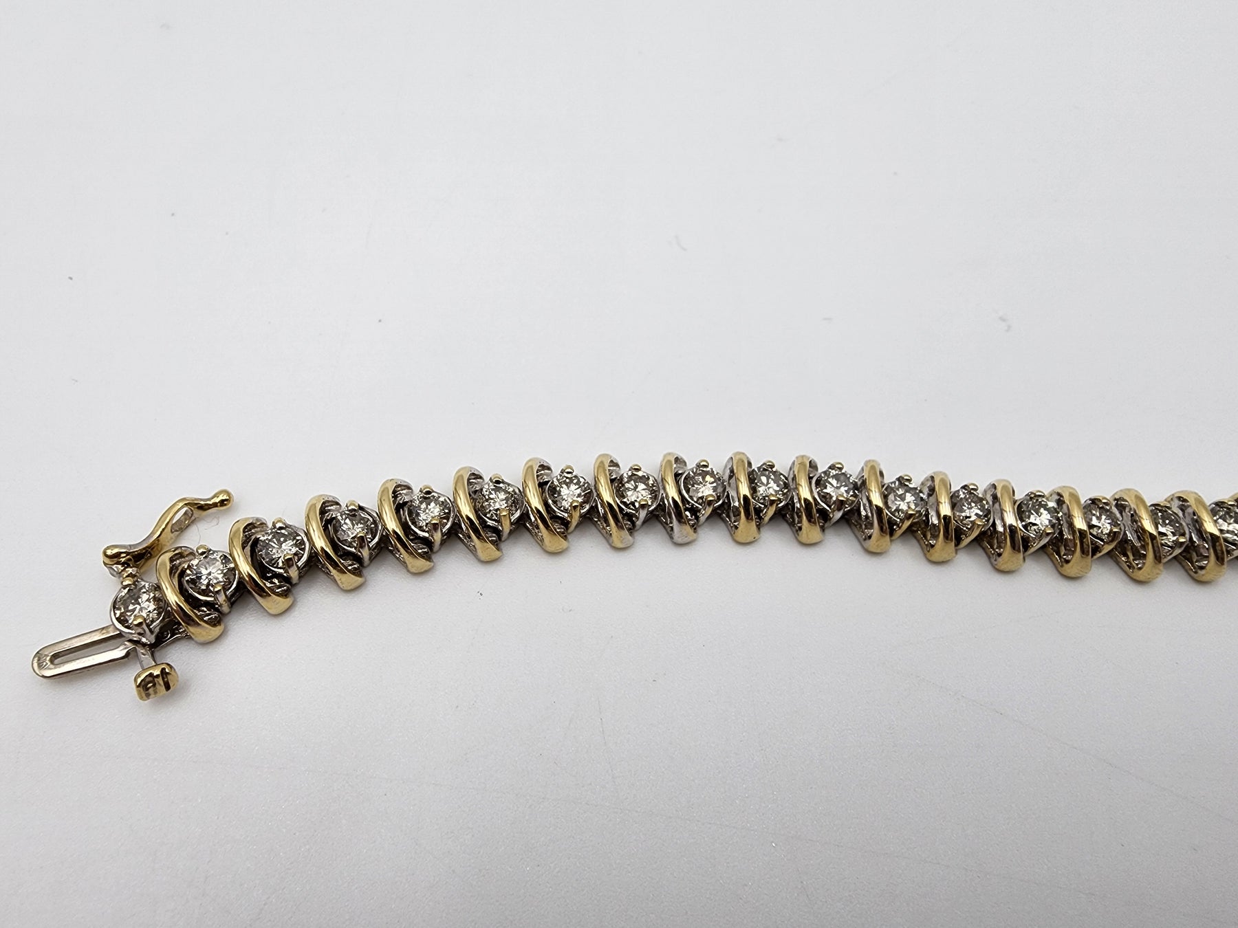 This is a stunning diamond tennis bracelet!! It features thirty-two (32) light champagne round cut diamonds, set in a two tone 14kt gold setting. Figure 8 latch is stamped 14k. Would be a nice gift for her!