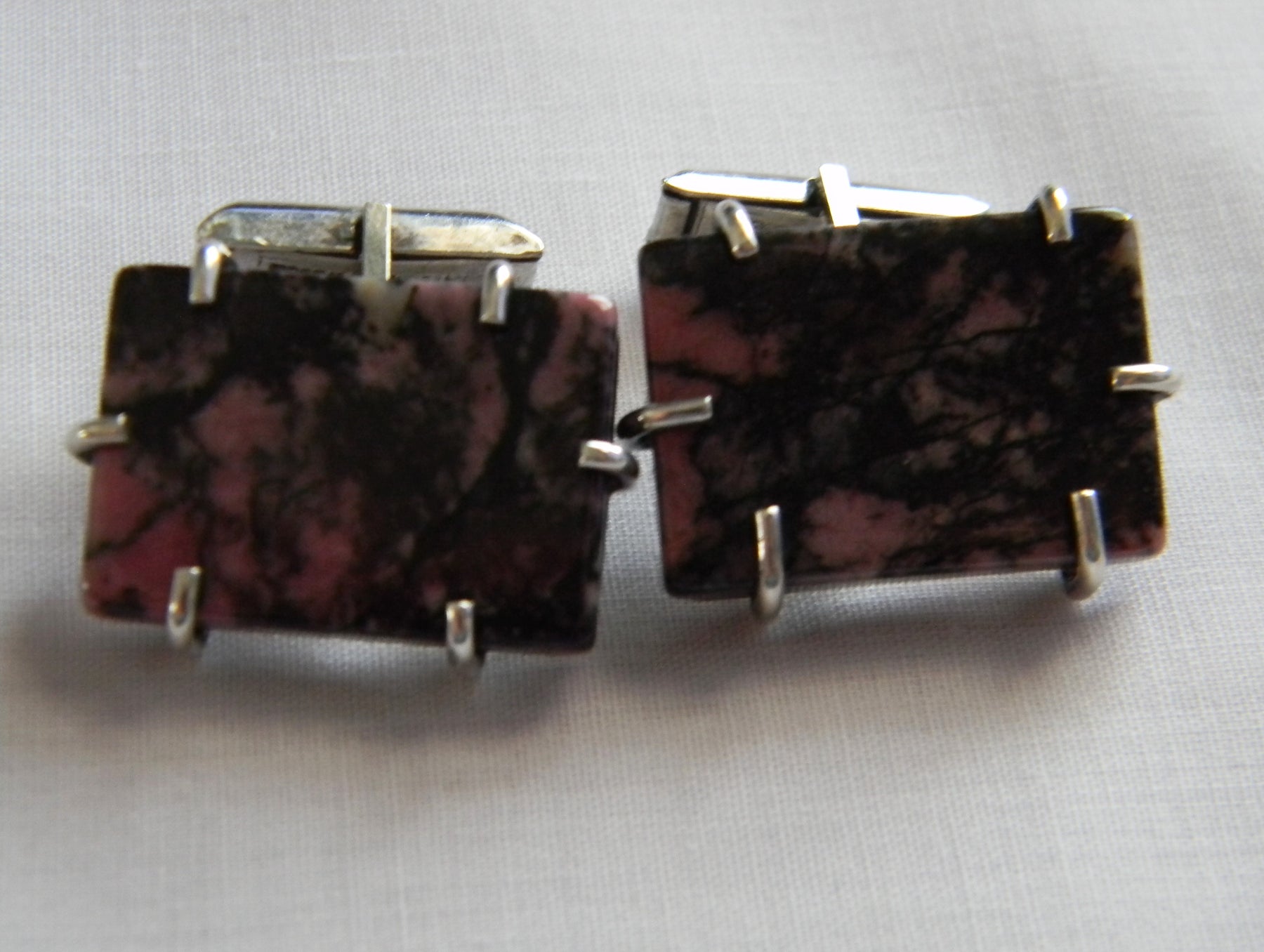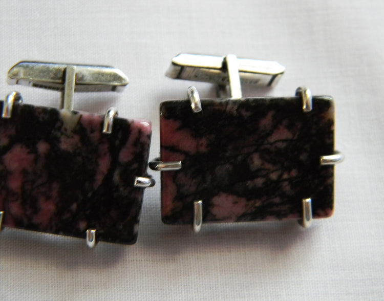 Nice Jez Originals marbled pink and black rhodonite sterling silver cufflinks.