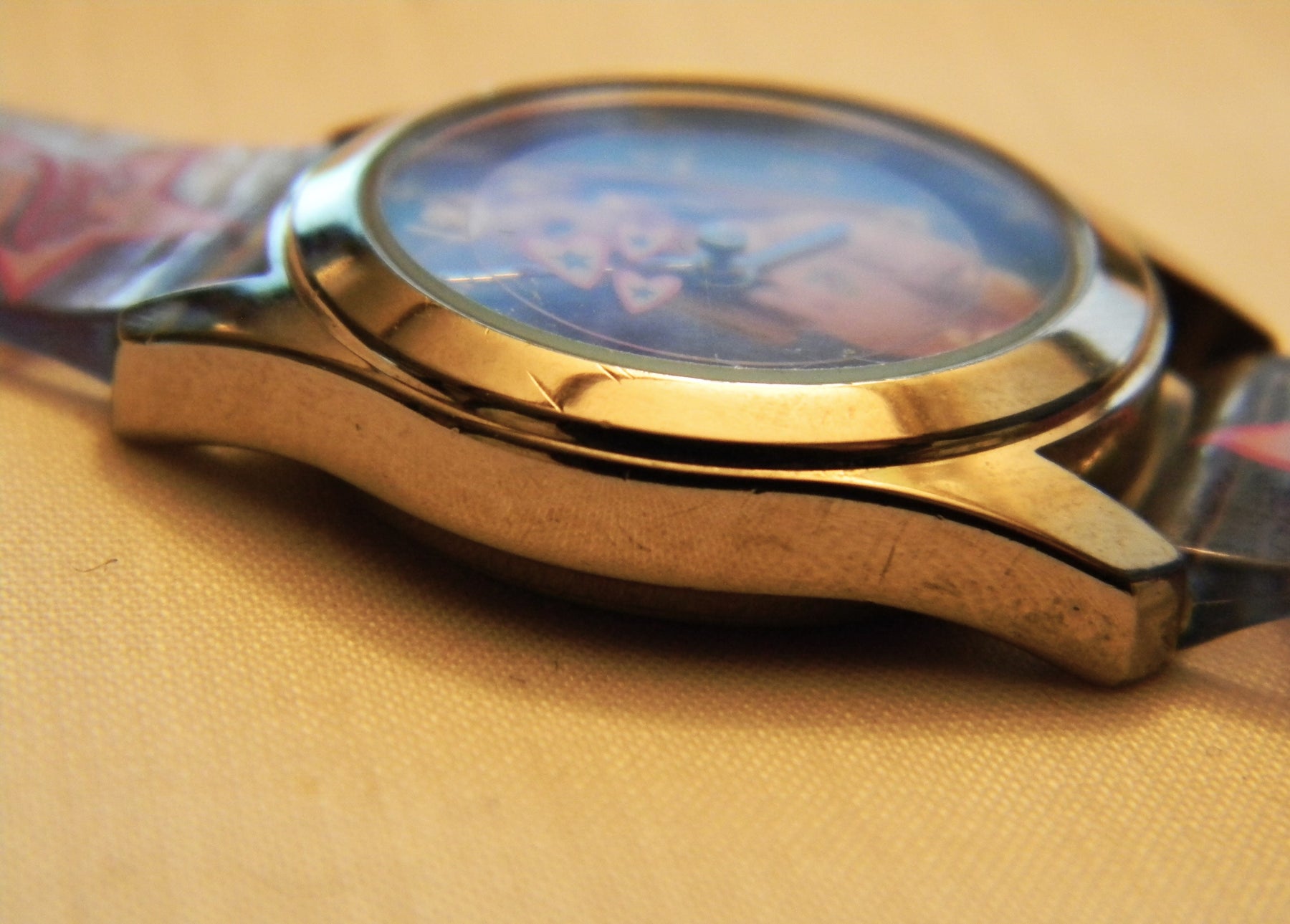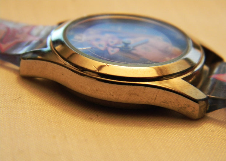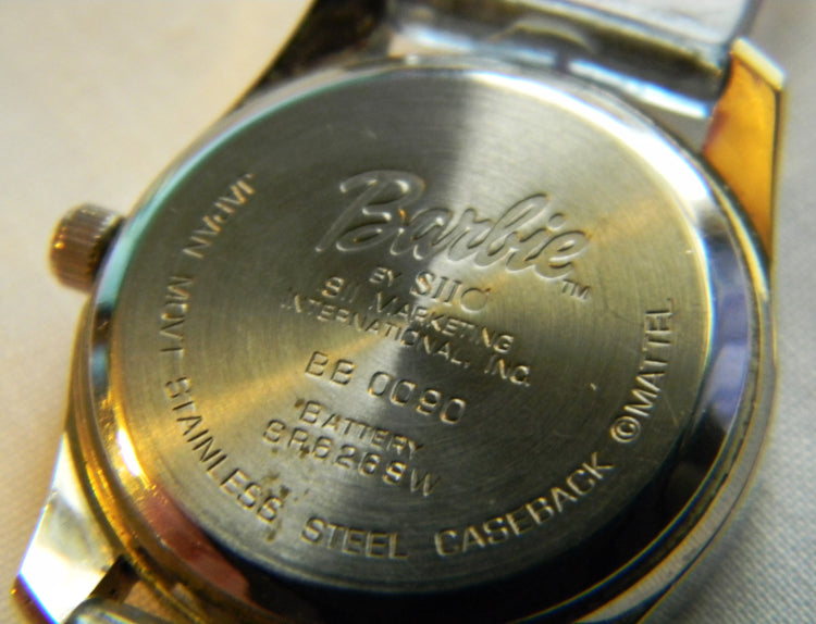 This nice little watch is a quartz watch with a picture of Barbie on the dial. The case is silver tone with silver hands and a cluster of hearts for the second hand. The silicone band is clear with hearts and stars with the word Barbie and a silver buckle. The back is marked Barbie, by SIIO, SII International Inc., B0090, Battery Sr828SW, Japan Mov't, Stainless Steel Caseback, @Mattel.