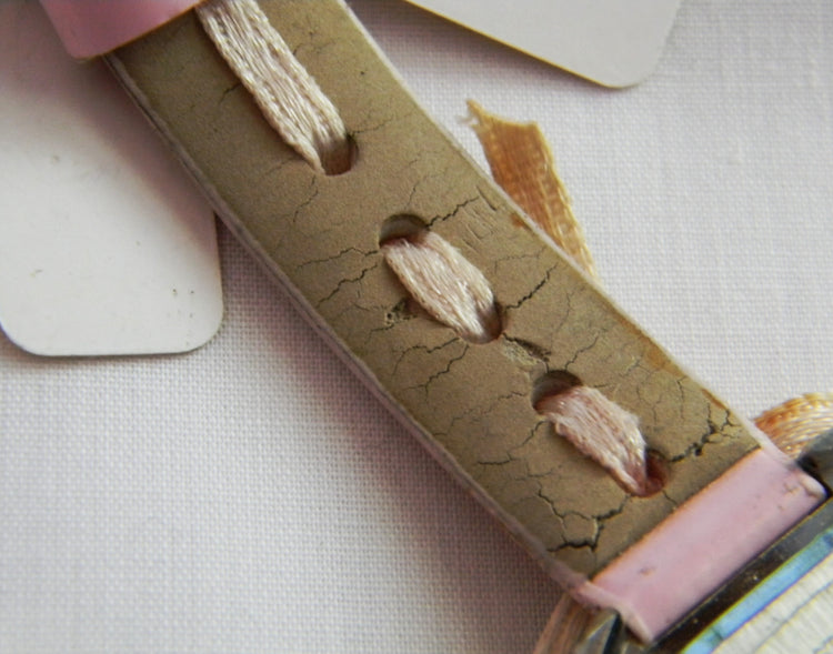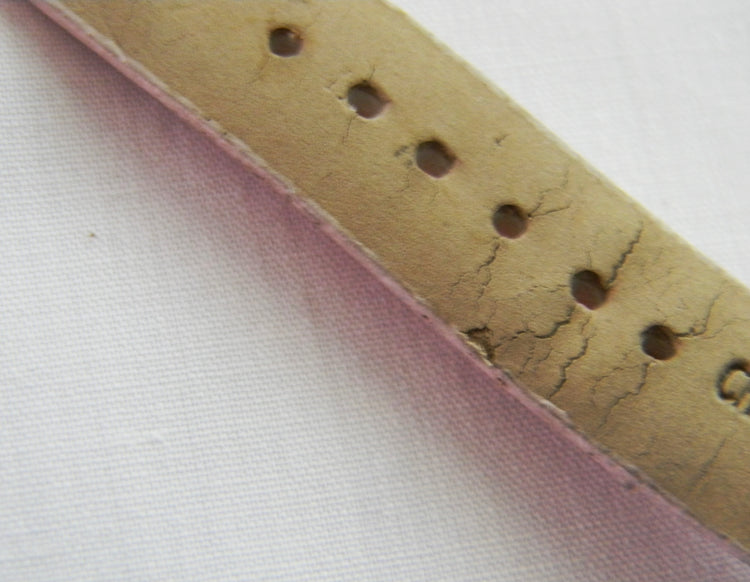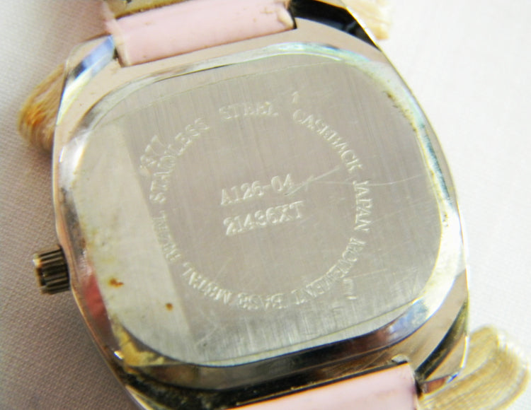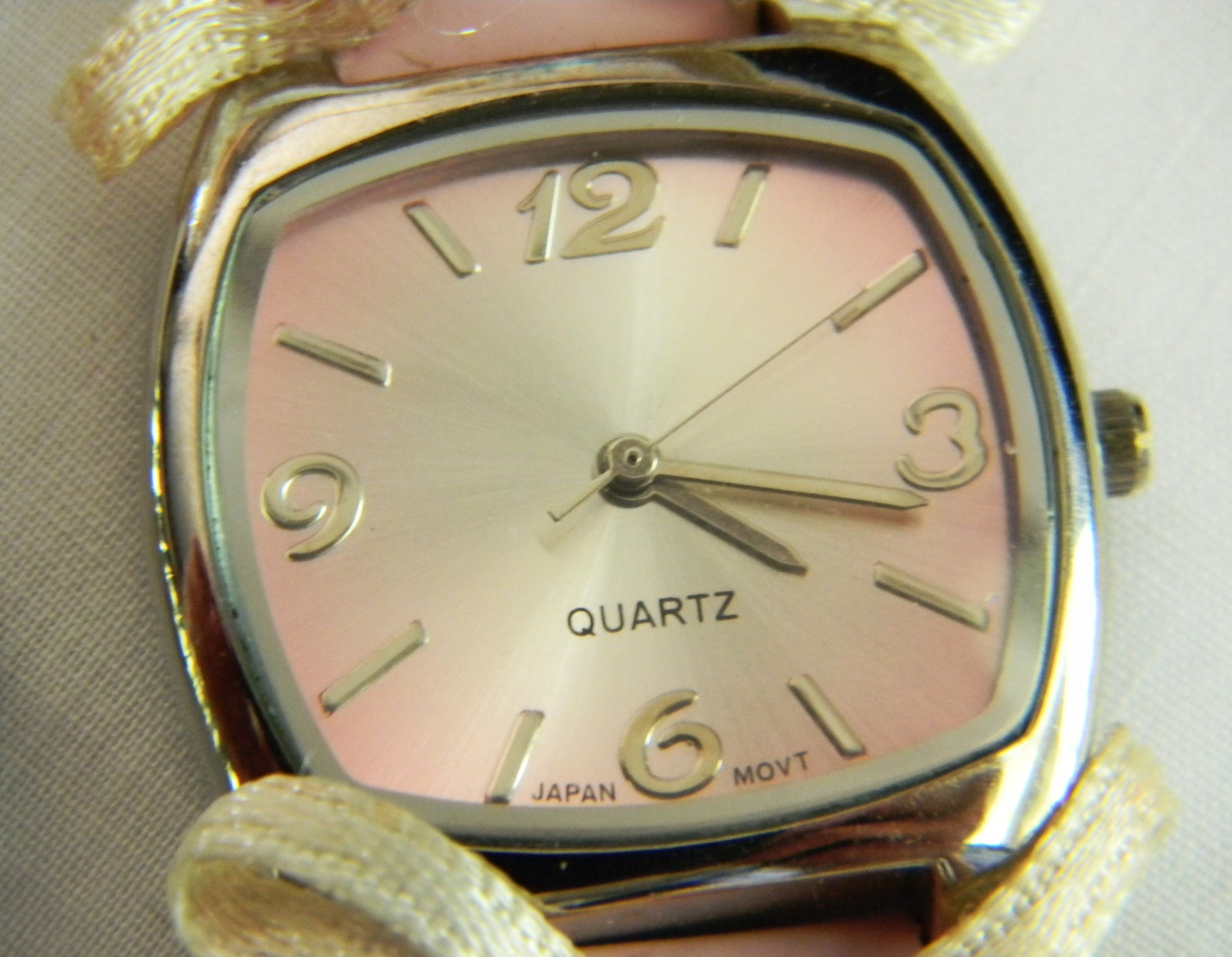 The second watch is a women's pink watch with no maker. This watch features a gradient pink dial with silver numerals and stick indices. The case is silver with the band being pink laced with a pink ribbon and tied in a bow. The band does show some wear as shown in the pictures. Back reads base metal case, stainlesss steel back, Japan movement, A125-04, 21436XT.