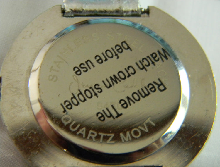 These two watches are being sold together. The Jessica Carlyle watch features loose crystals floating around in the bezel. The band has a shiny silver finish with the back marked genuine leather. The back is marked Stainless Steel Back, Jessica Carlyle 9470, Quartz movement. It does appear that a Couple crystals may be missing from the dial.