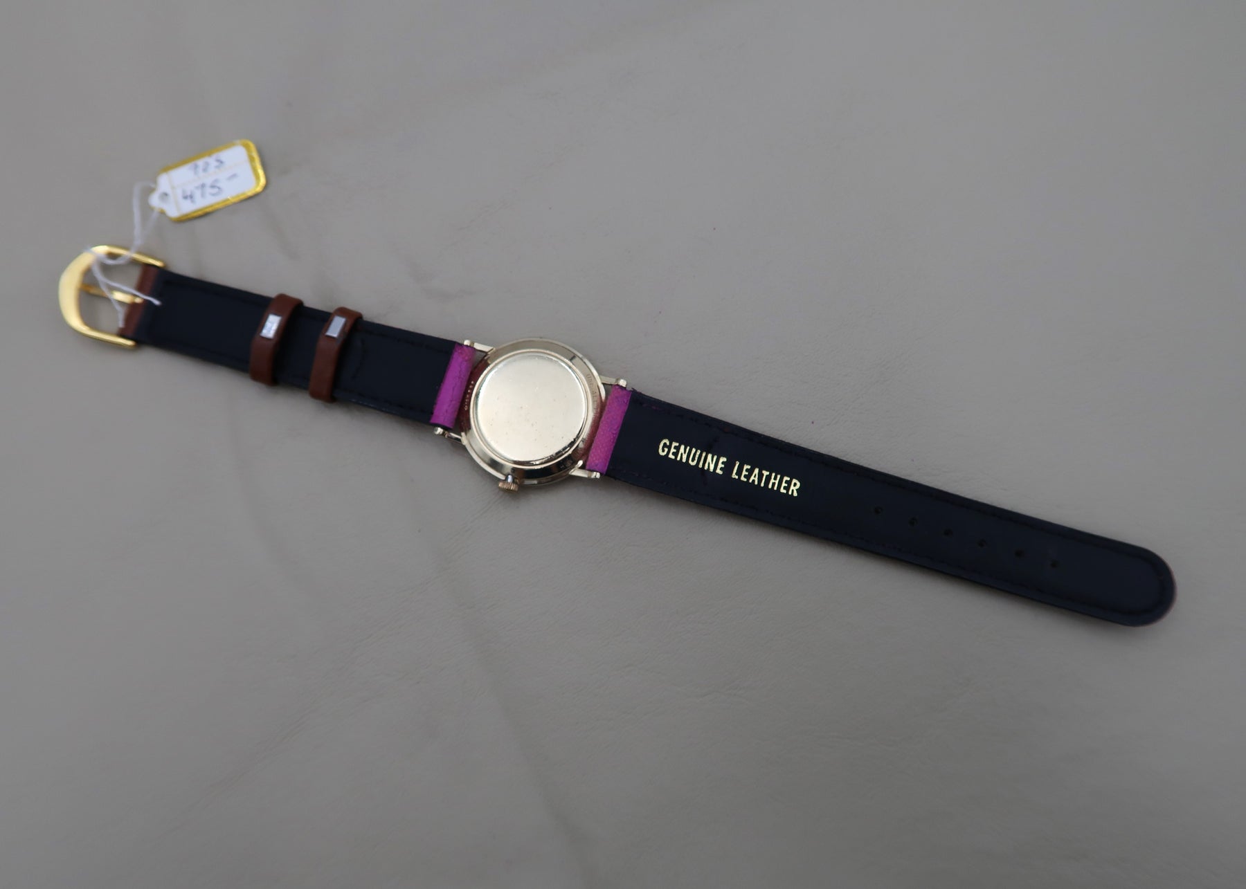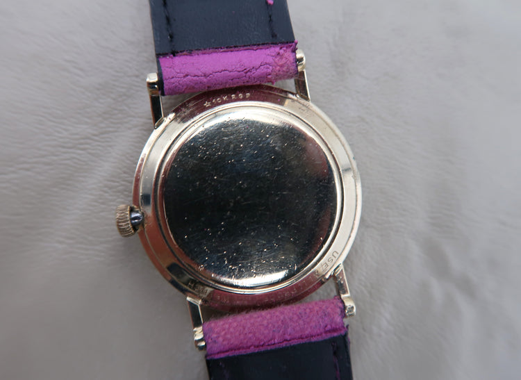 This is a nice 1970's men's Wittnauer watch featuring a second sub-dial, white dial with bright gold stick indices in a 10k RGP case.  The leather band is two tone with brown by the buckle and pink by the case with a stamped musical note. The back is stamped Use all Proo 1100 Wrench.