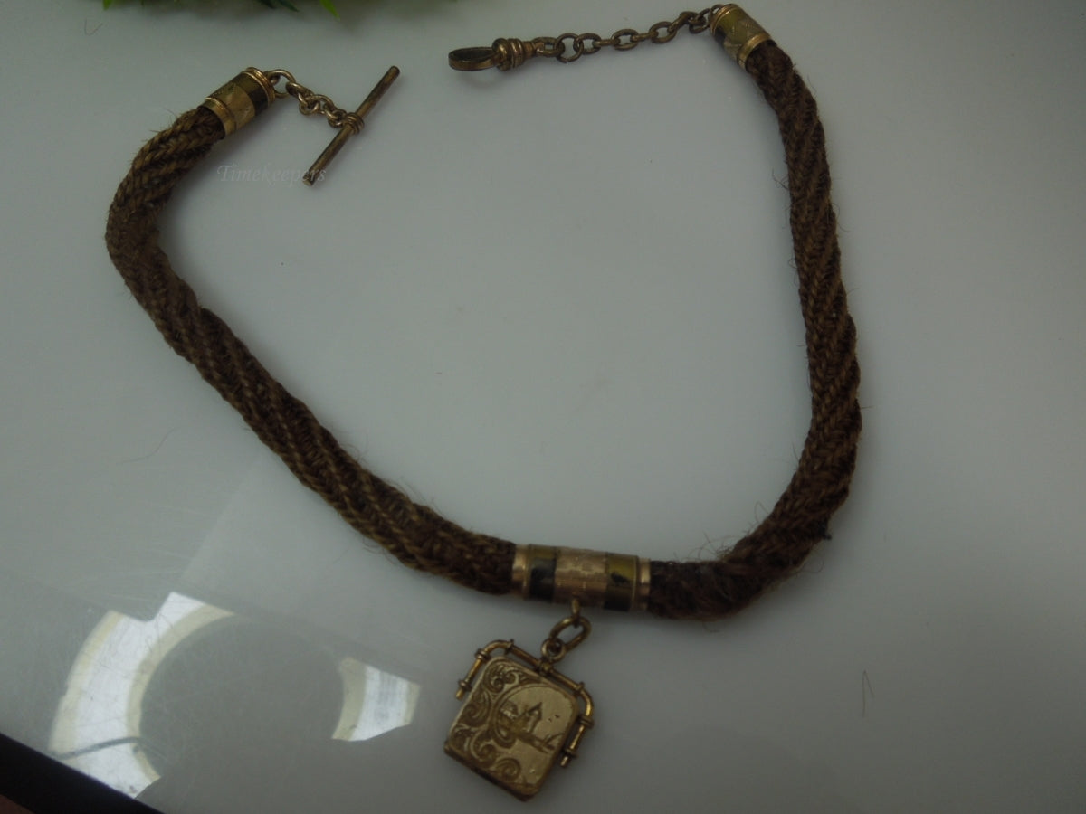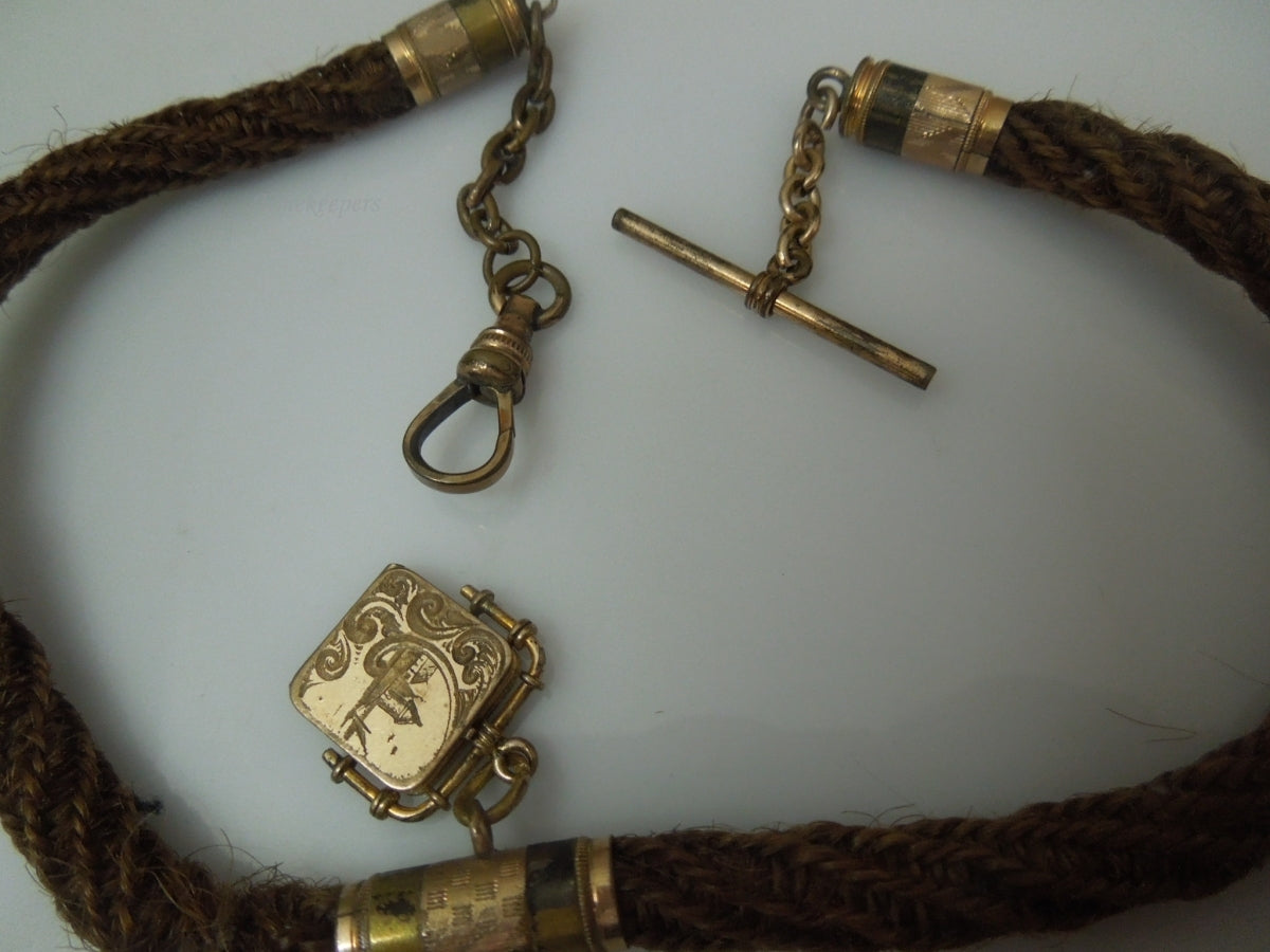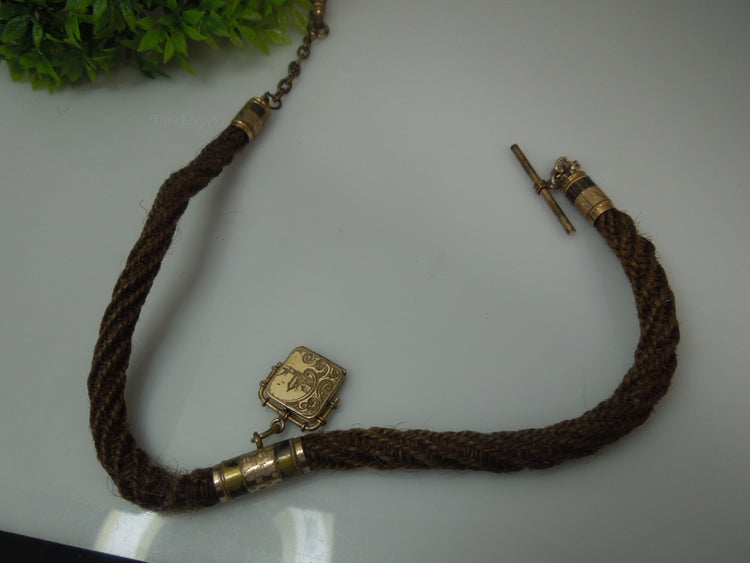 For Sale(1) : q816 Antique Victorian Woven Hair Pocket Watch Chain 1800s Mourning In Memory Braided Brown Hairwork Gold Filled Jewelry