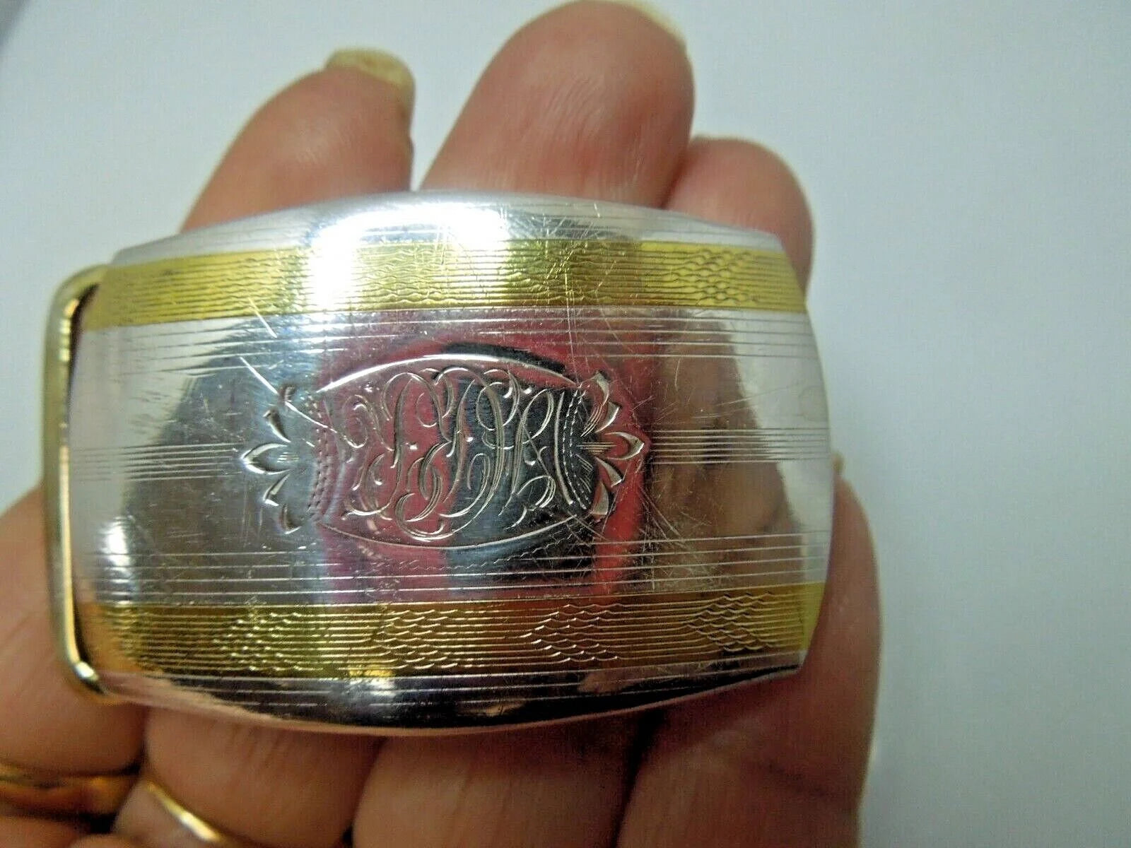 1920 Vintage Sterling Silver and 22K Gold Engraved Belt Buckle For 1” Belt. Buckle is in very good condition with some light scratches acquired over a lifetime. The company model number is C 8859. There are several similar versions of this buckle, and I believe this is the deluxe model in that there is an added 14K gold rectangle in the center for the initials. Most model do not have that added rectangle.