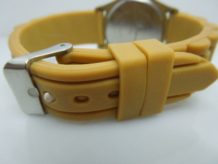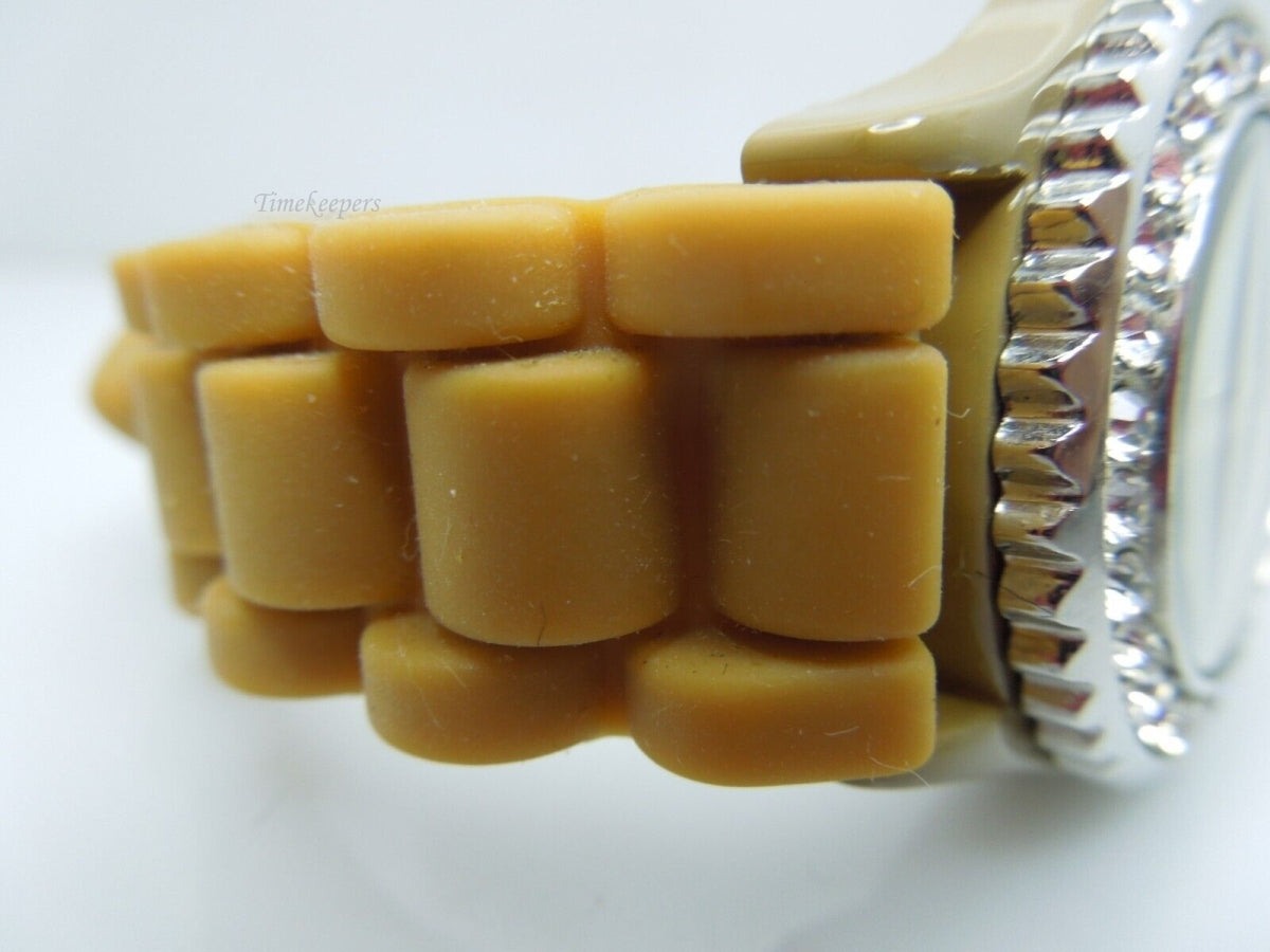 Ladies Geneva tan silicone band rhinestone watch, clear rhinestone bezel, tan tone soft flexible silicone band, silver tone hardware, stainless steel case back, Japan quartz movement, the watch overall is in great condition.