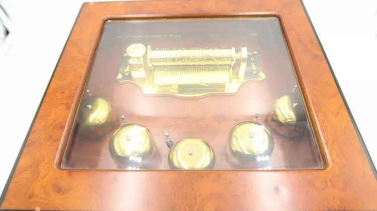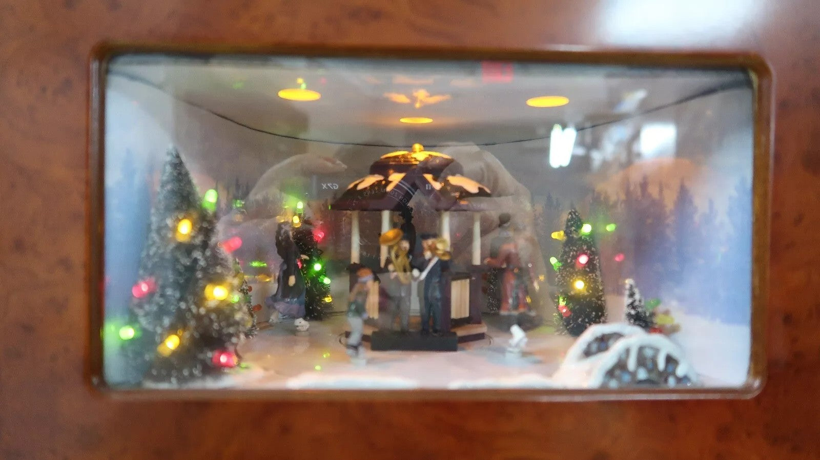 Five real brass bells chime in harmonic accord with favorite Christmas and all-time classics played in this concertina. This timeless piece is housed in a burled wood box above an animated Victorian Christmas scene, with an abundance of LED lights festively decorating the trees. From Mr. Christmas.
