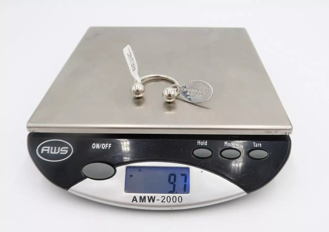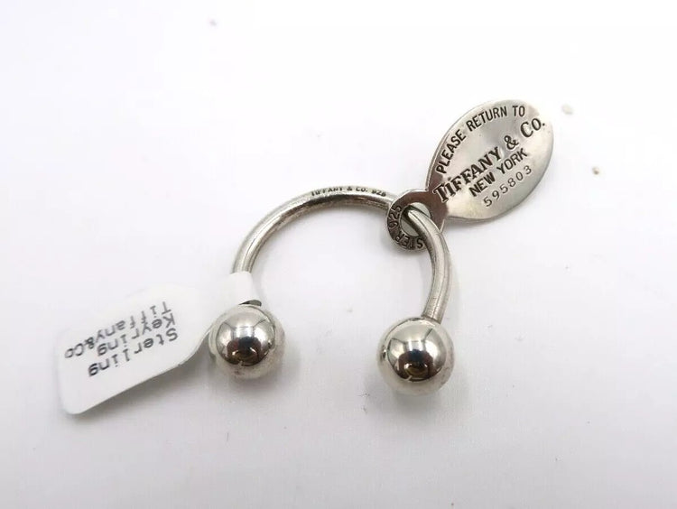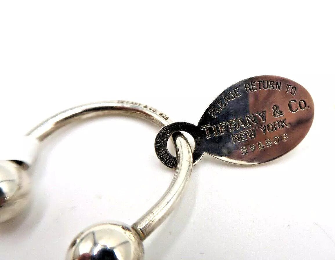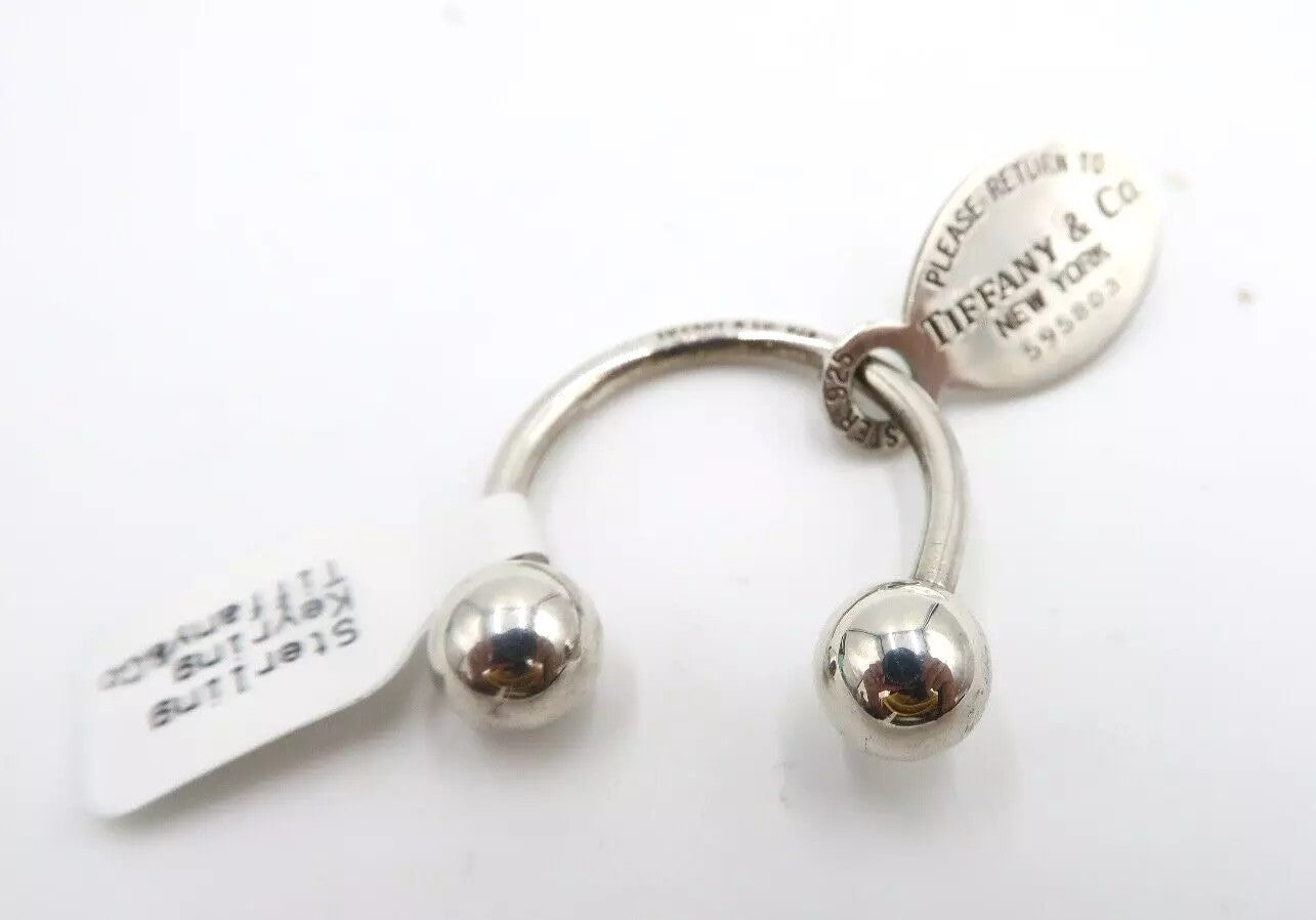 This is the sterling silver Tiffany & Company Round Tag Key Ring. The tag is ready for engraving if you desire. The oval disc can also be worn on a chain. One of the balls unscrew to add your keys. Signed on the key ring and on the disc. The tags are bright polished silver both sides no matter what they look like in the photos.