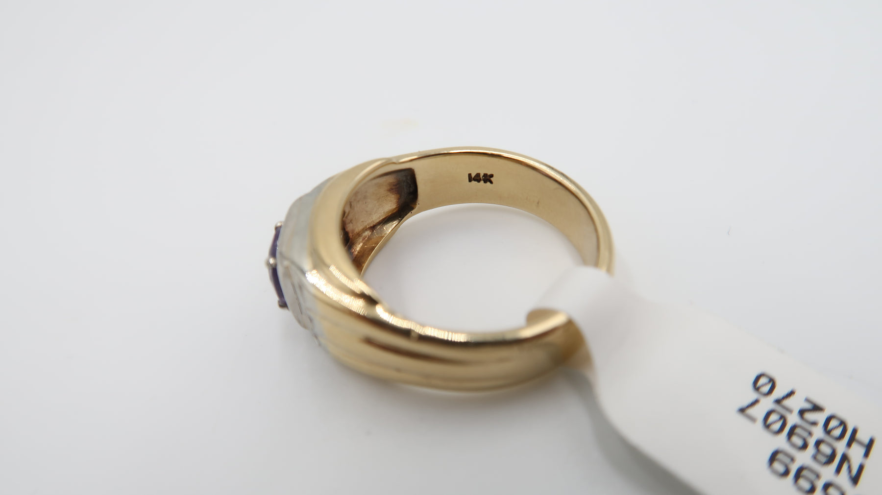 This yellow gold amethyst and diamond, men's ring is sure to grab attention and add a little pop of color to your everyday attire, or would pair nicely with a purple tie or polo!14k Yellow Gold .03 TDW Diamond Amethyst Ring
