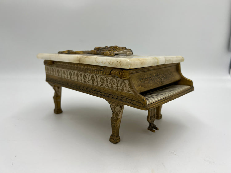 The entire piano music box is 4 inches tall with a length of 7 1/2 inches and width of 5 inches.