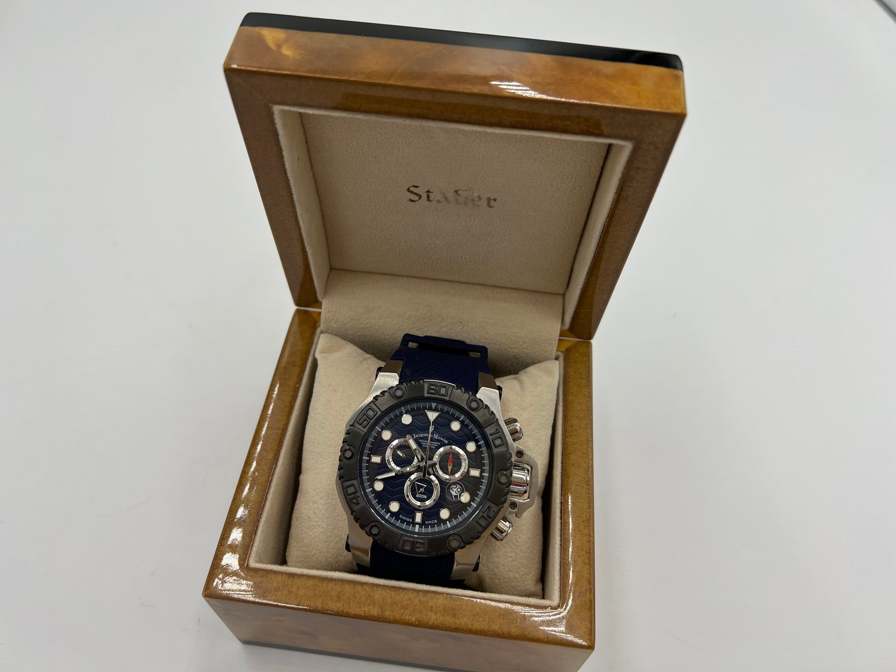 PLEASE READ ENTIRE DESCRIPTION BEFORE PURCHASING Pre-owned item. Good condition. Please see pictures for details. Sold as is, as seen on pictures. This Jacques du Manoir Diver Pro wristwatch is a stunning addition to any collection. Crafted with high-quality materials, this wristwatch is designed for men who appreciate style and functionality. Its quartz movement ensures accurate timekeeping, while its diver style adds a bold touch to any outfit. With a focus on quality and craftsmanship, the Jacques du Manoir brand is known for creating timepieces that stand the test of time. This particular wristwatch is a prime example of their expertise, with its sleek design and attention to detail. Whether you're a collector or simply in the market for a new wristwatch, the Jacques du Manoir Diver Pro is sure to impress. Specifics: 48 mm dial, with a band width of 30mm. Comes in a Stauer box. 158 grams. Stainless Steel. ------------------------------------------------------------------------------------------------------------------------------------------------------------- Please be 100% sure of your purchase before buying, as we do not offer refunds. We are more than happy to provide any specific pictures, or answer any questions you have regarding our items. ALL INCLUDED ITEMS ARE IN PICTURES, SOLD AS IS AS SEEN ON PICTURES Do not assume anything is included that is not shown in pictures. We claim no responsibility for possible inaccuracies in Manufacturers description. Shipping & Returns Please allow adequate time for your item to arrive before contacting us Domestic •We ship via First Class Mail USPS with signature RETURN POLICY We DO NOT refund for "buyer's remorse". We do not accept returns. If a buyer returns an item, the buyer will pay all return shipping fees. A 10% restocking fee will be subtracted from the amount of the item. No shipping fees will be returned. All items must be returned exactly as shipped. If an item is damaged during shipping, the buyer is responsible for contacting the shipping company to collect any monies owed. All of our items are insured upon shipping. If an item is defective we must be notified within 7 days to try to resolve the problem Any item listed "as is, for parts or repair may not be returned. These items may be damaged. These items will not be refunded. |