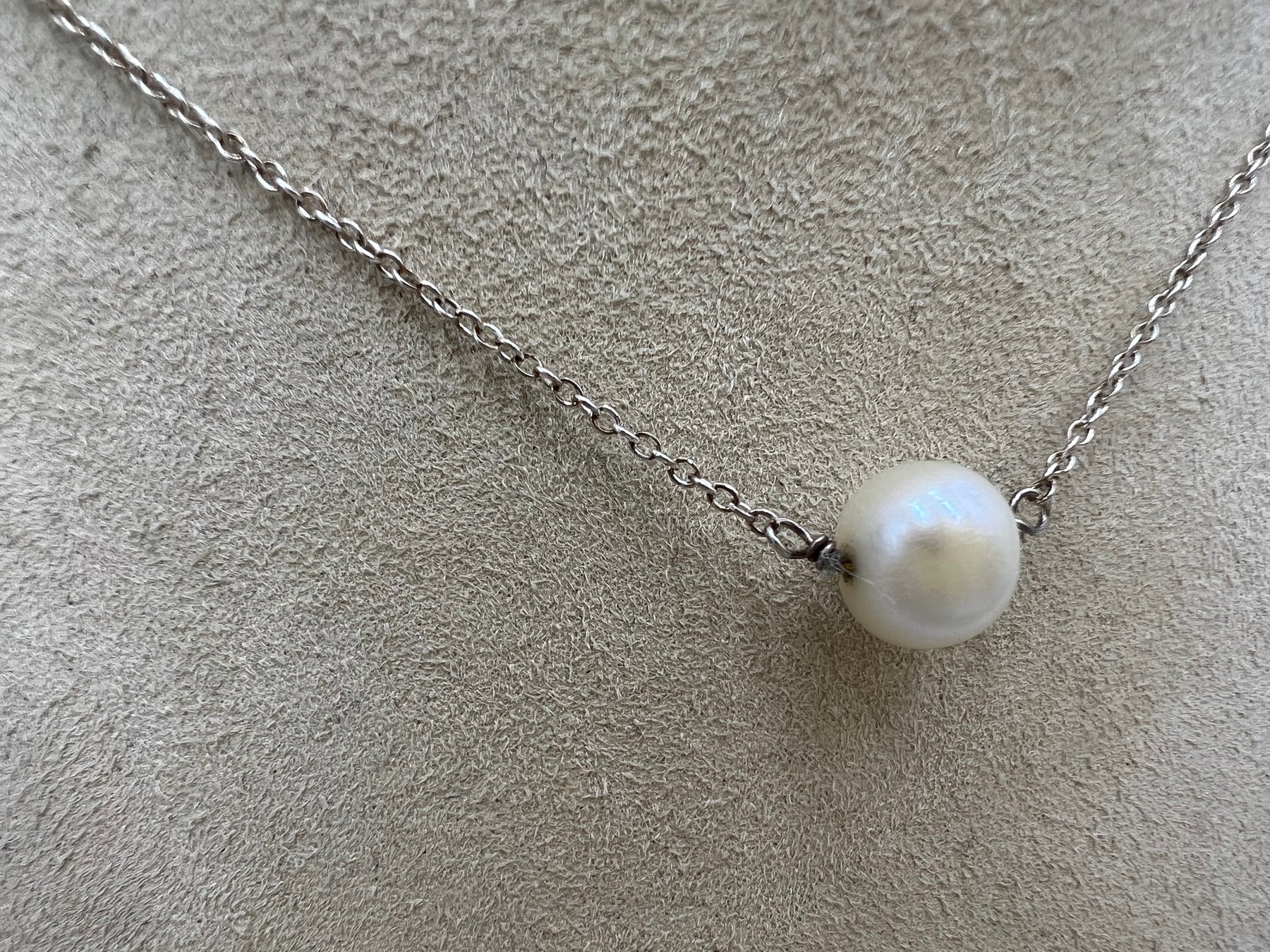 The necklace weighs 1.7 grams. The chain is about 18 inches unclasped. The pearl has a diameter of 8 mm. 925 sterling silver chain.