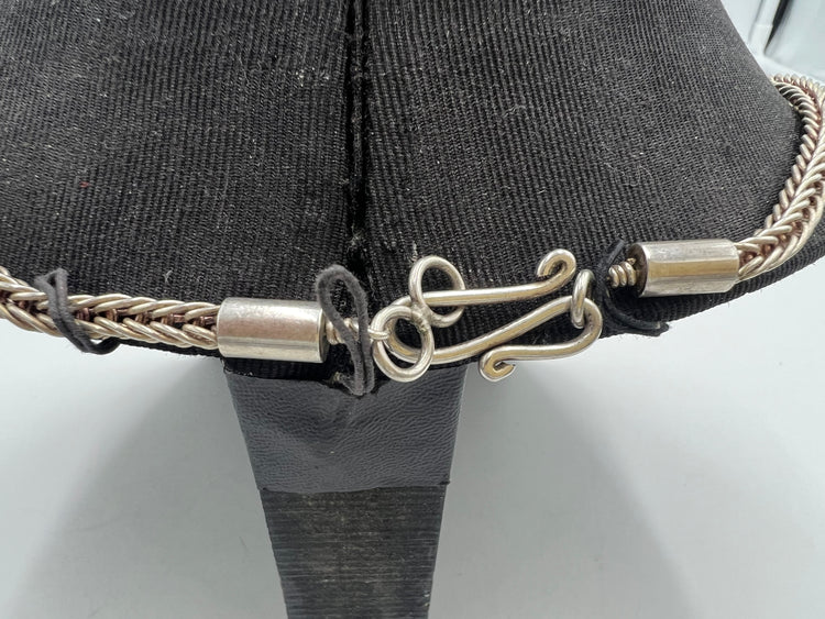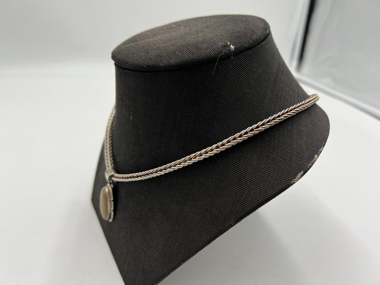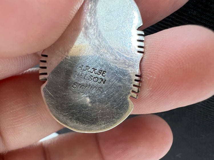 This necklace and pendant are a perfect gift for anyone interested in Native American craftsmanship. The pendant is oval shaped and has a width of 1.5 cm and a height of 2.75 cm. The necklace is 40.5 grams. The chain is 18 inches. The necklace and pendant are 925 sterling silver. It is crafted by Arkie Nelson.