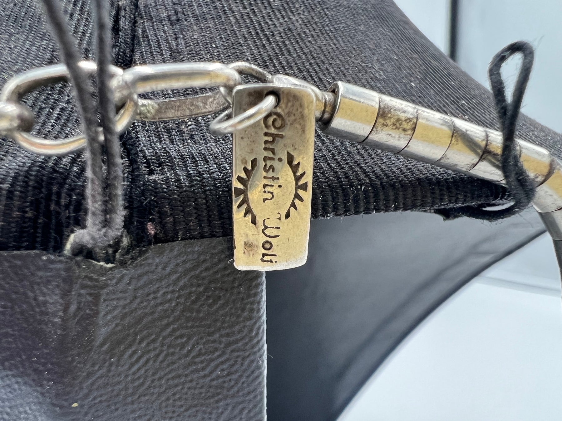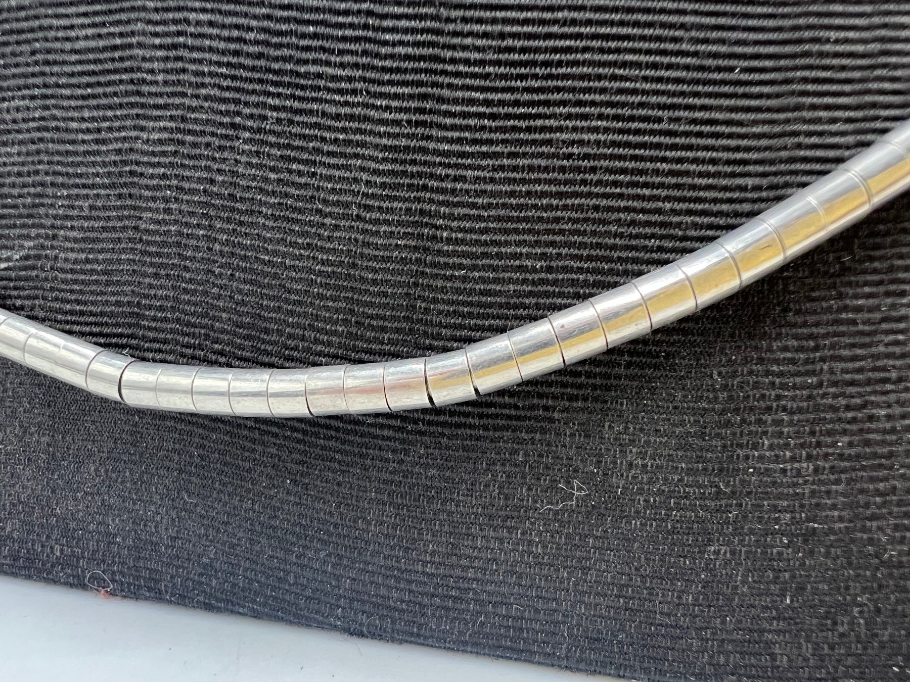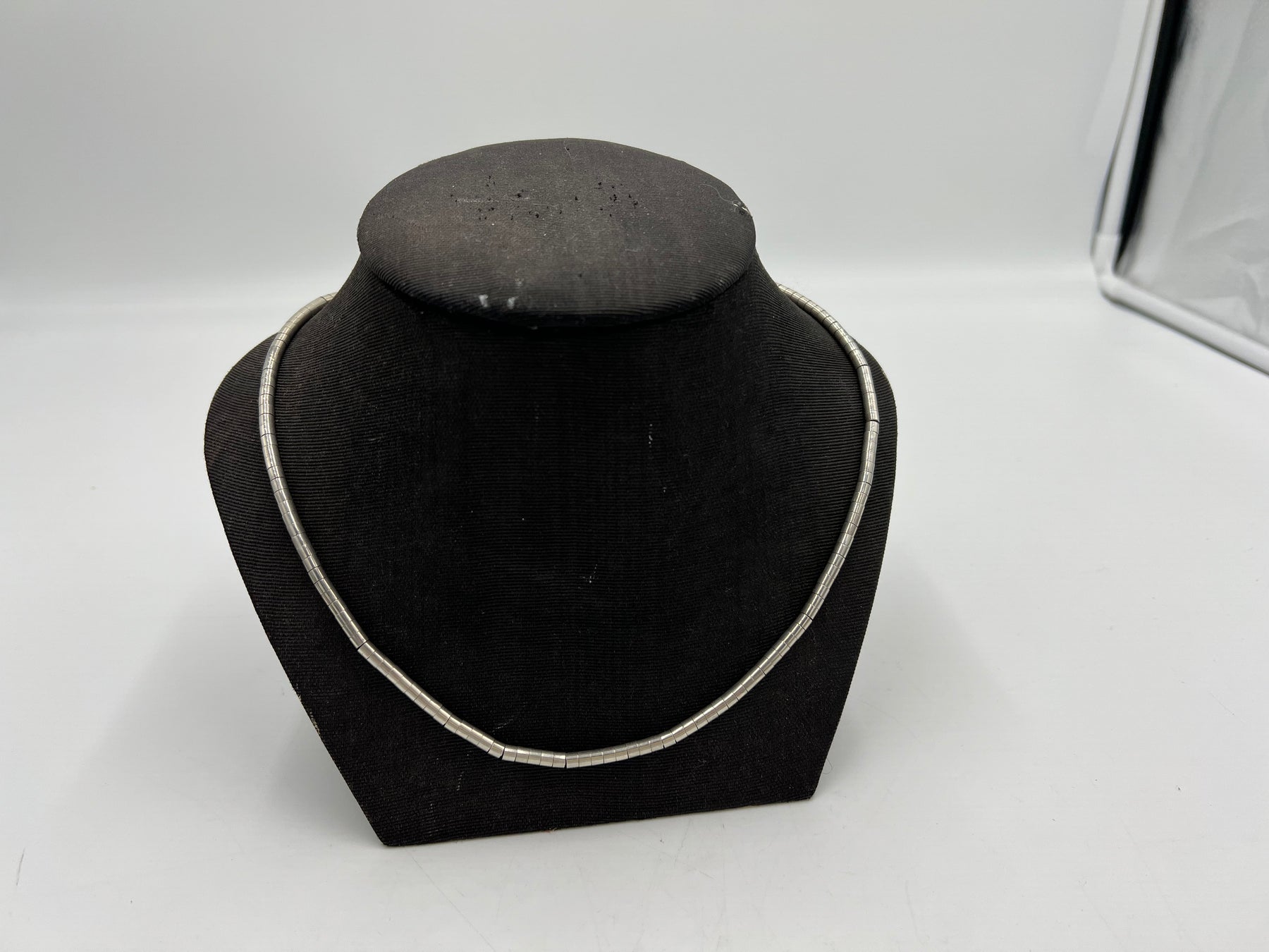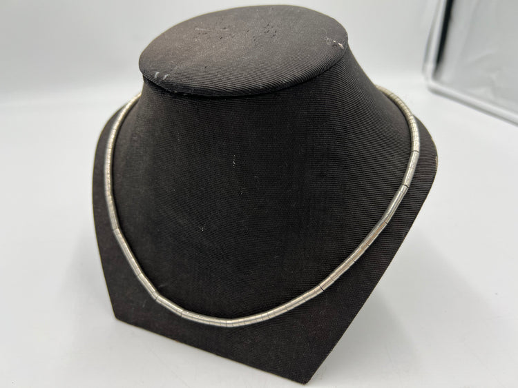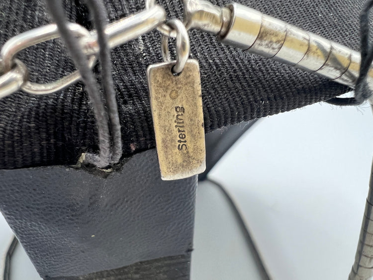 This necklace is beaded with sterling silver material. It has a blue stone on the top near the clasp; stone unknown. It has been handmade by Christin Wolf, a Navajo affiliated crafter. The necklace measures over 24 inches in length unclasped. 62 grams.