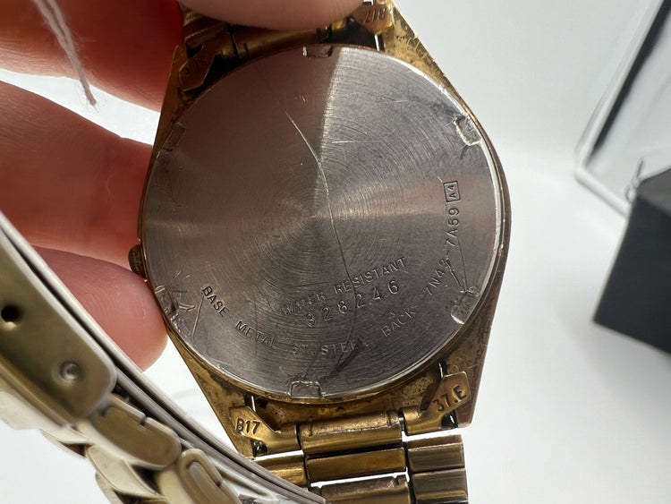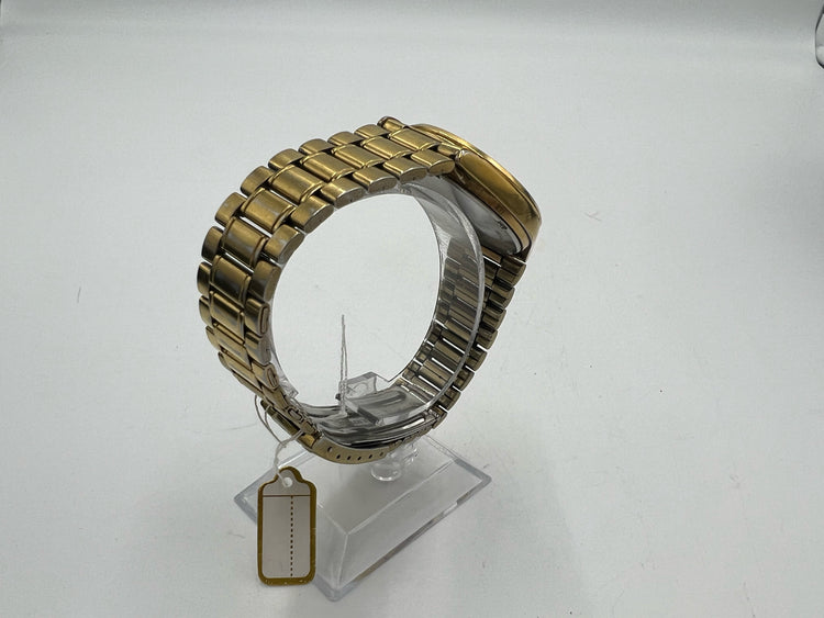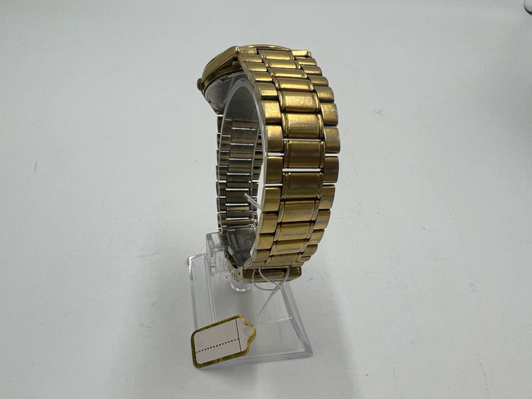 Case size is 34mm and dial size 30mm. Gold tone with stainless steel. Quartz watch. Day Date feature. Band width is 19mm.