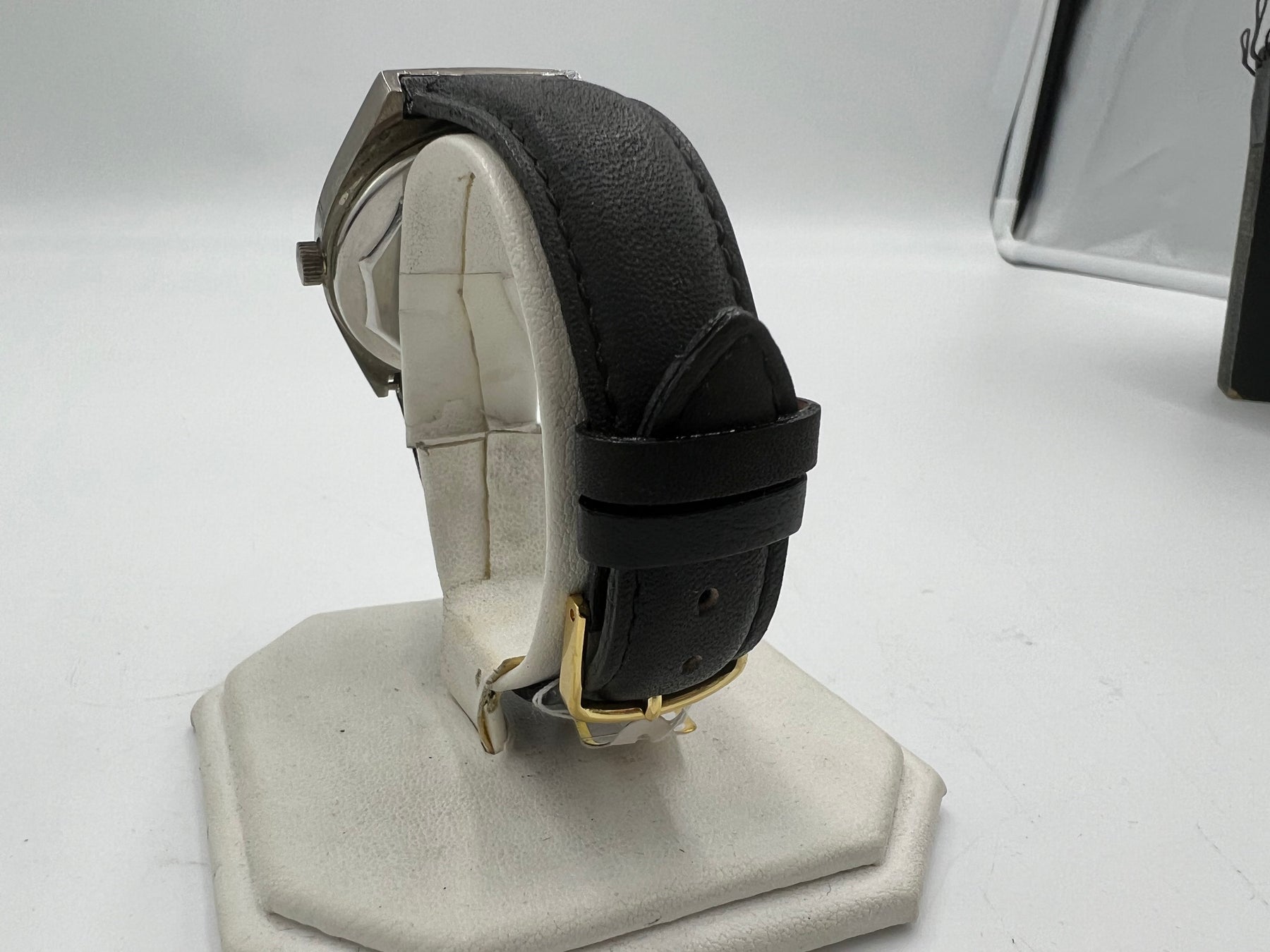 38mm dial/case size. 18mm band width. Genuine leather black band. 59.3 grams. Stainless steel.