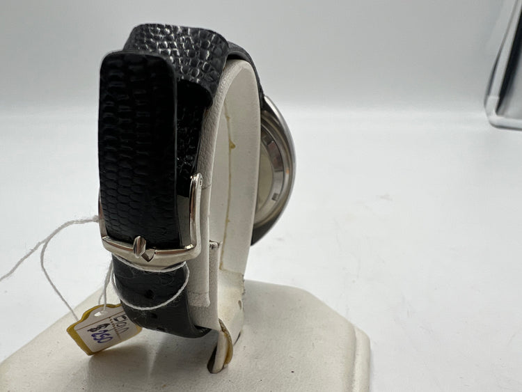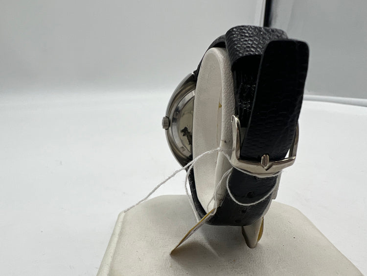 33mm case diameter with a leather band width of 16mm. 49.8 grams. Features a day and date display. Automatic movement.