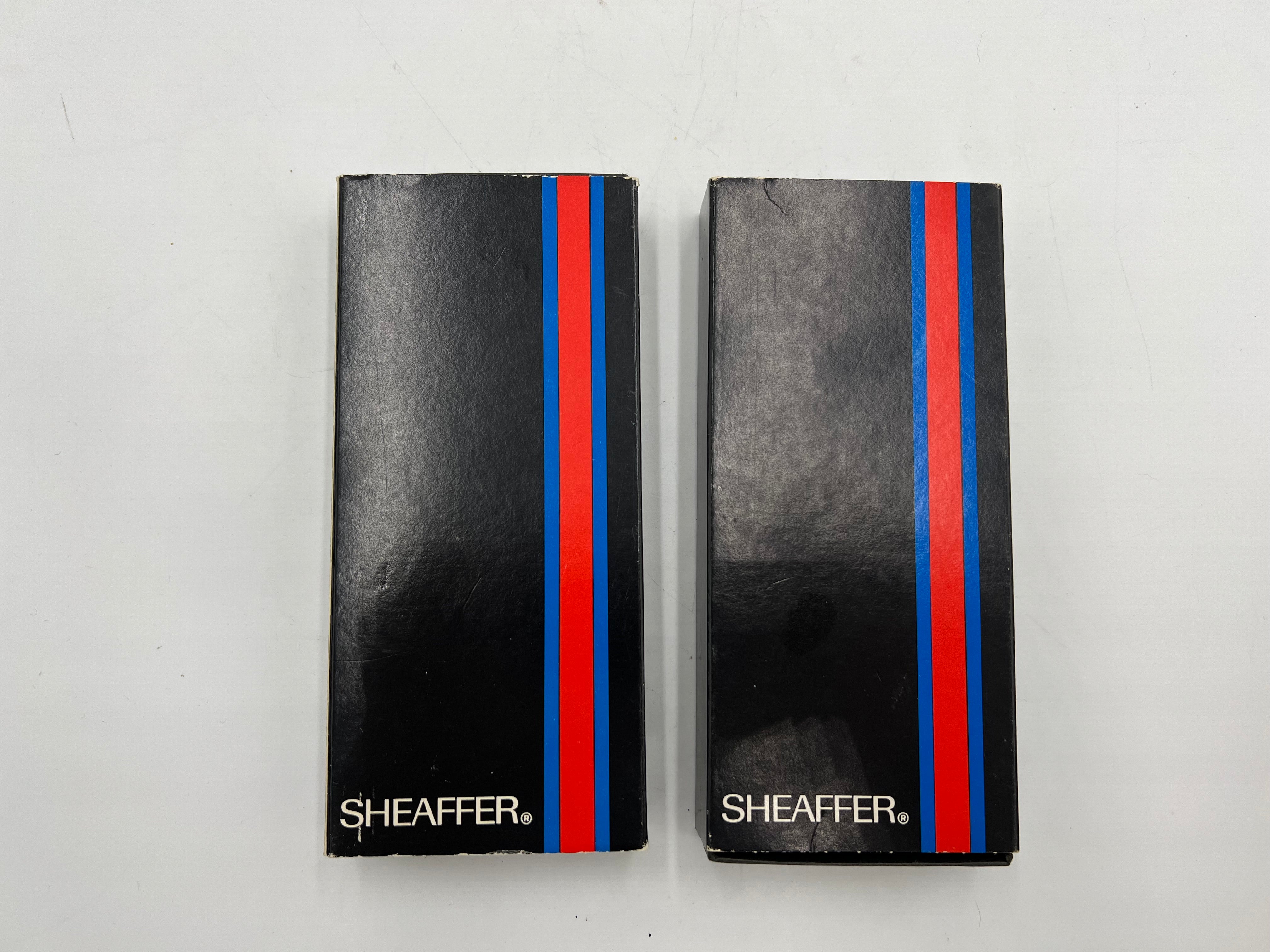 This vintage Sheaffer pen and pencil set is a great addition to any collector's collection. Made of high-quality metal, this set boasts a medium (M) nib size and comes in a classic blue ink color. Personalization is not available, adding to the authenticity of this collectible item. The Sheaffer brand is known for their quality craftsmanship and attention to detail, and this pen and pencil set is no exception.  Don't miss out on this opportunity to own a piece of history with this vintage Sheaffer pen and pencil set.