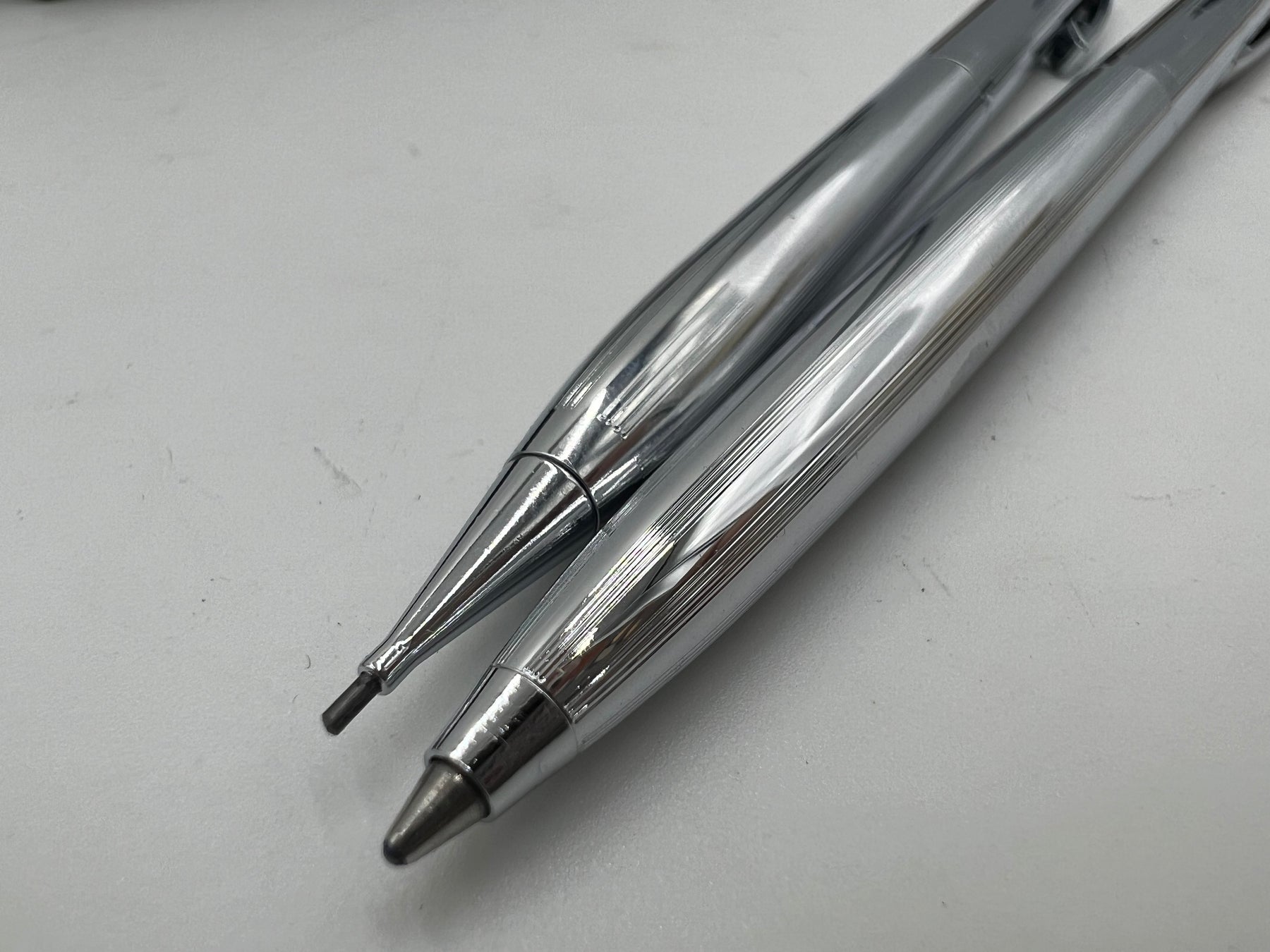 Pen and Pencil set in its original box. Pen and pencil measures 5 inches in length and 6mm in width. Blue ink in the pen. Pencil weighs 18.4 grams and pen weighs 16.4 grams. $30 for each set.