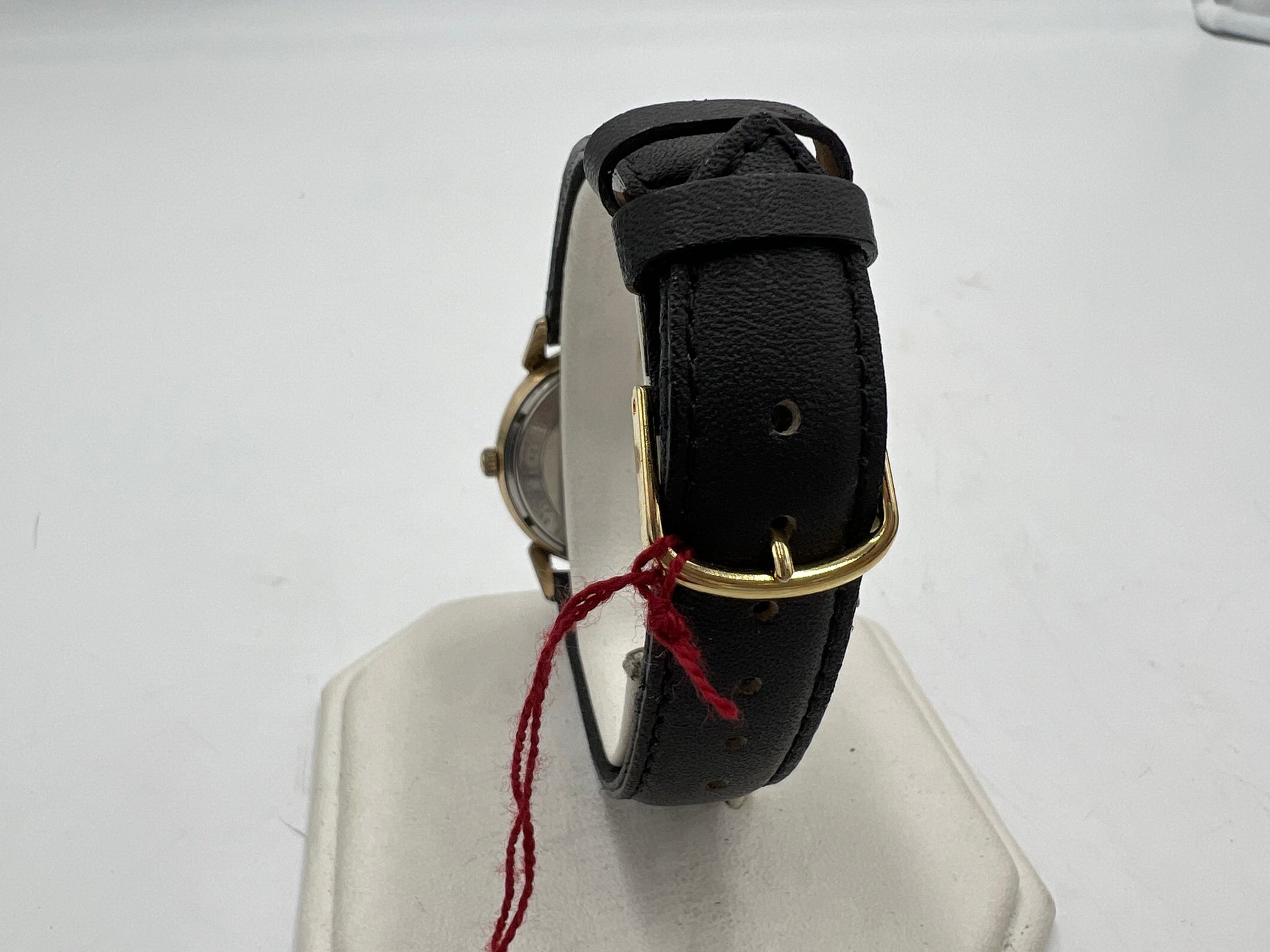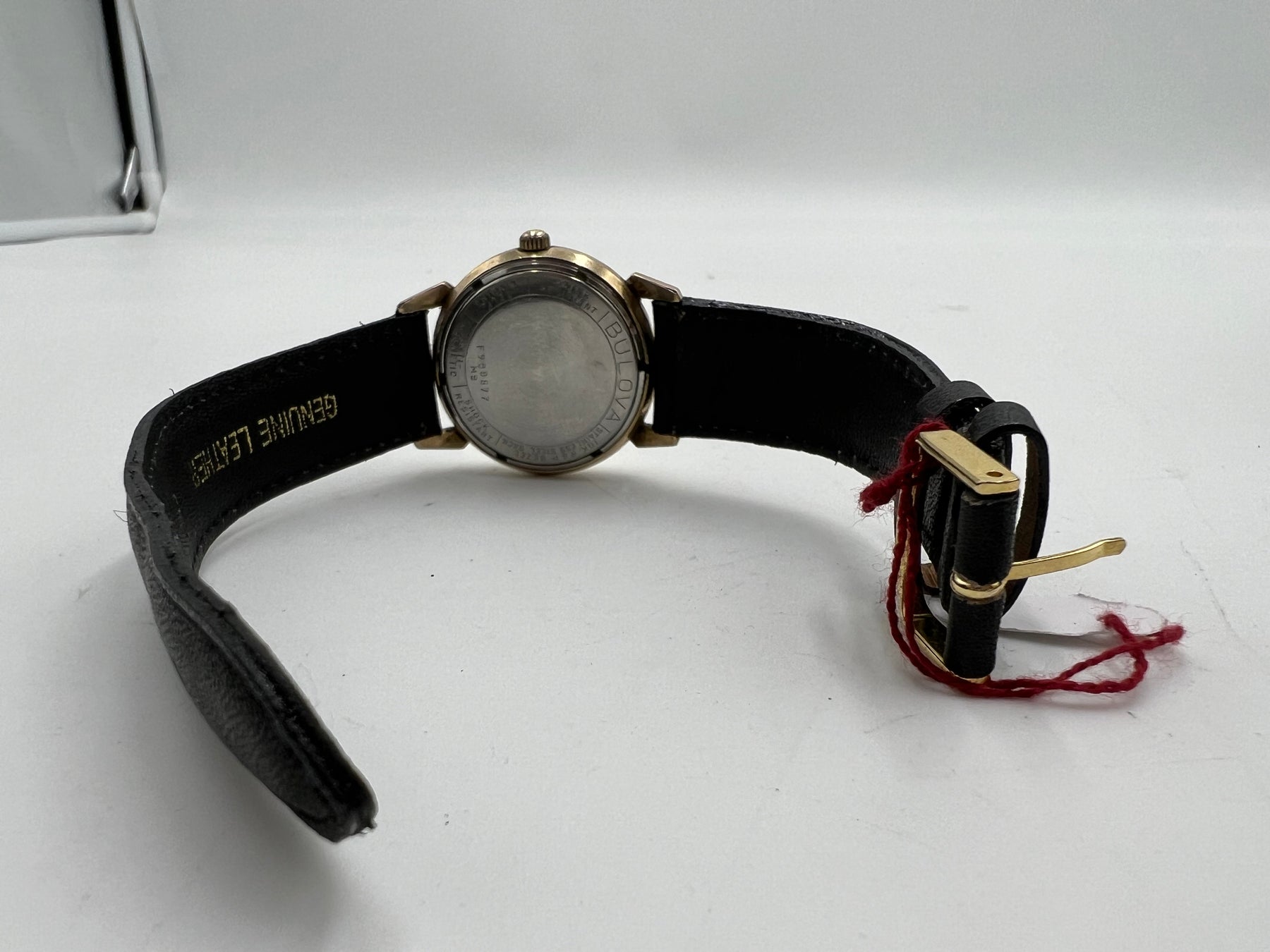 This Bulova wristwatch is a stunning timepiece, perfect for any occasion. The watch features a gold plated bezel and gold tone dial. The bezel color is gold and the band is made of black leather. The watch has a mechanical automatic movement with analog display. It also has a date indicator and a 12-hour dial. This watch is ideal for men who want a dress/formal or casual/classic style. The watch is in great working condition and will be a perfect addition to your collection.