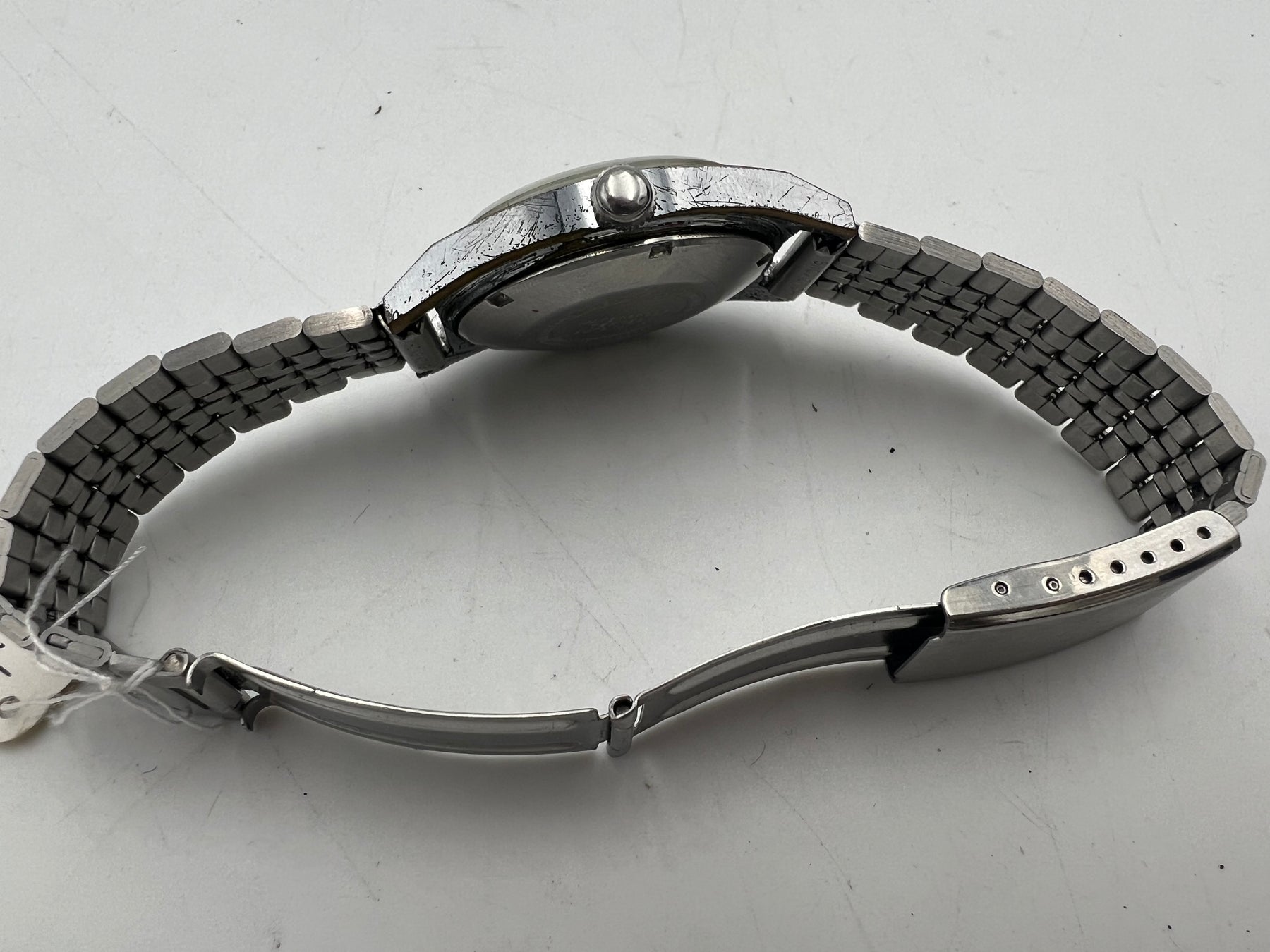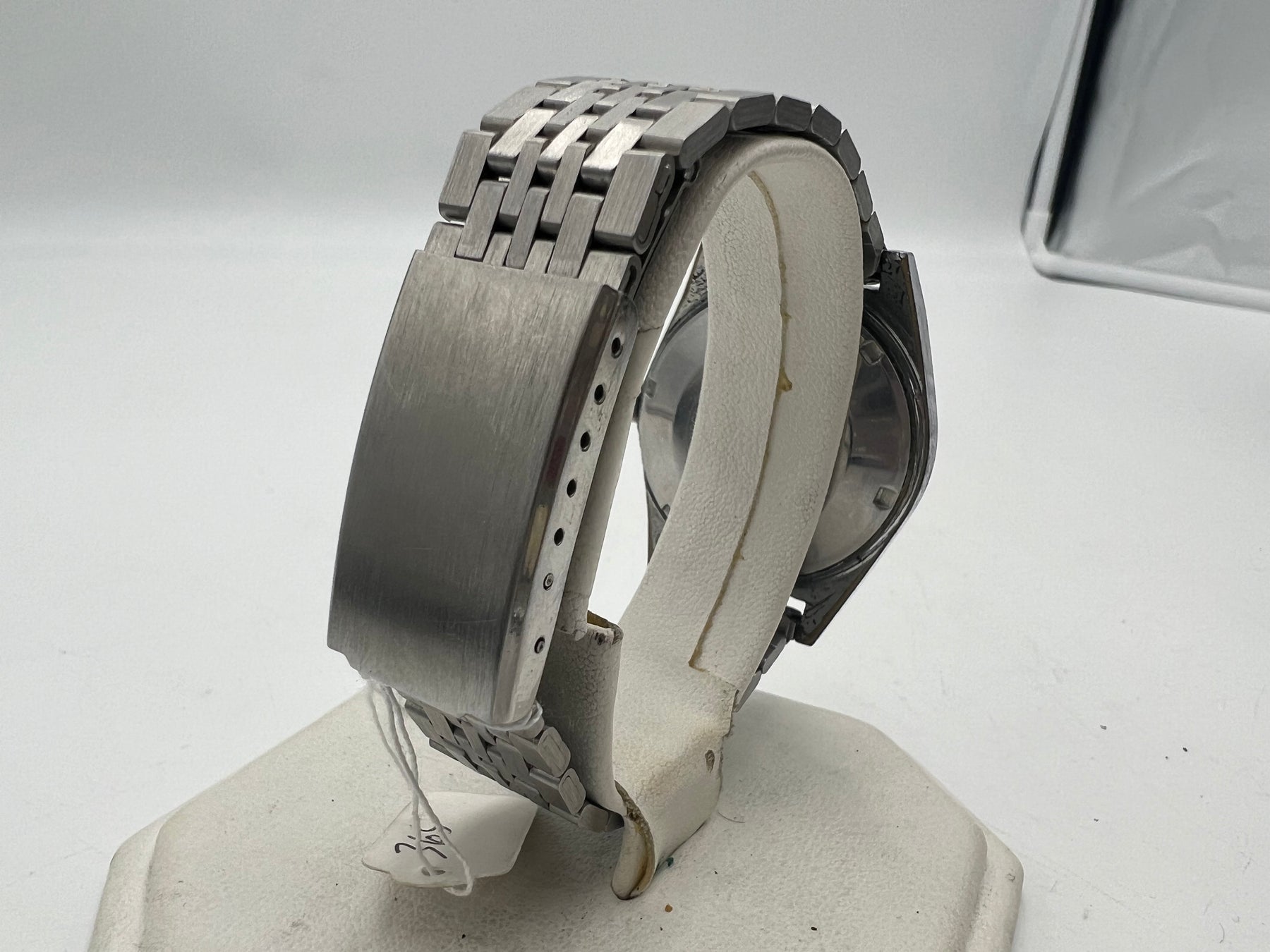 Dial diameter is 30mm and the band width is 18mm. The watch is made of stainless steel material and the crystal shows minimal wear and tear with some scratches. It is an automatic watch. 80.6 grams. Has a day date feature.